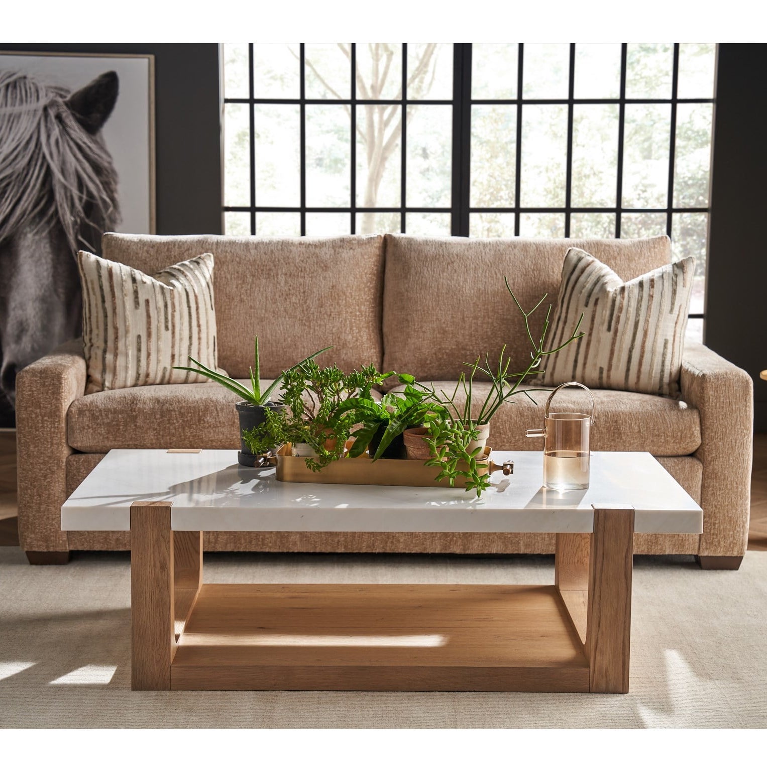 The Ellis Cocktail Table captures attention with its organic, two-tonal design, pairing a Natural Oak base with a honed White Quartz top. This combination makes a fresh and elegant statement, anchoring modern spaces with a piece that merges the raw beauty of nature with a touch of refined elegance.