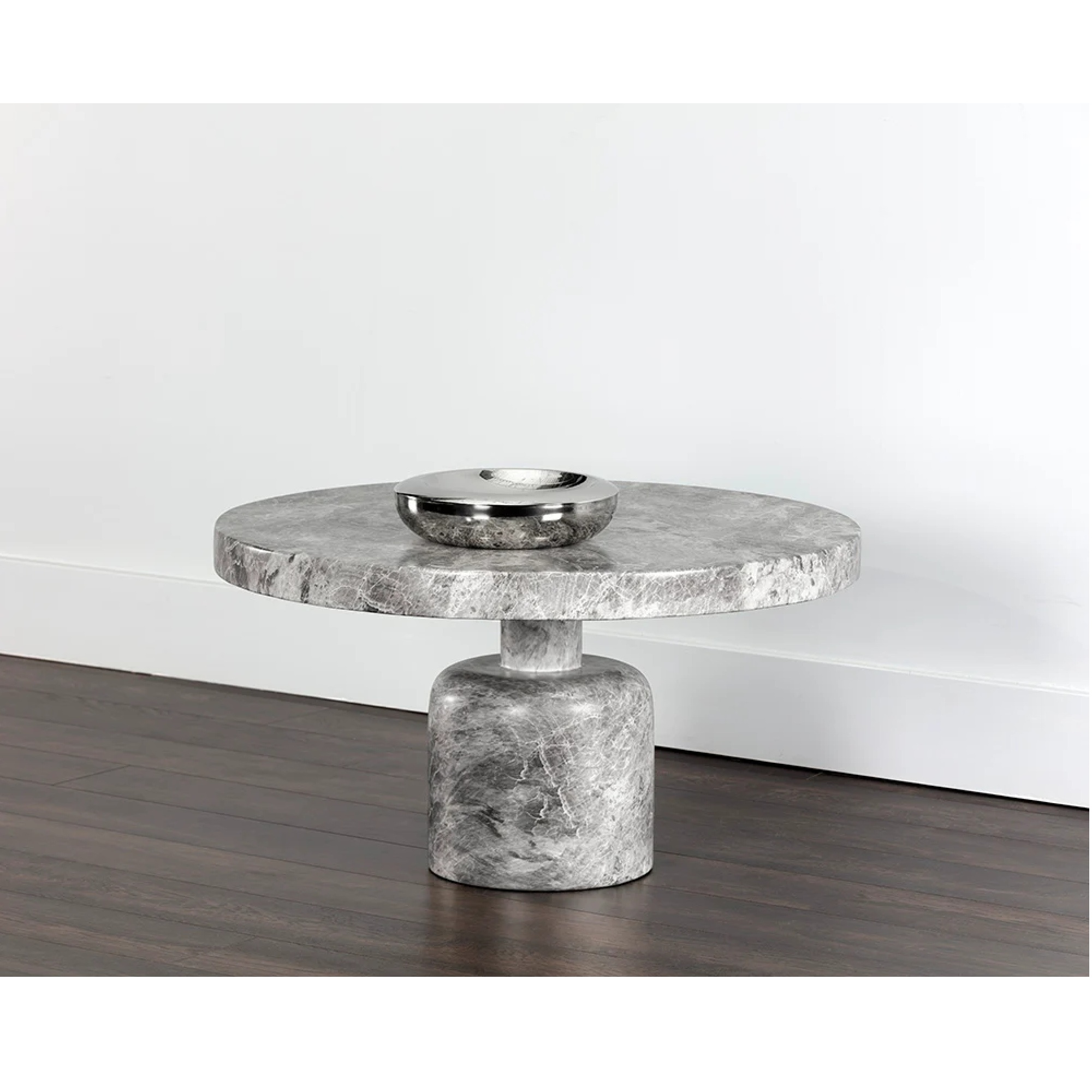 A clasically chic cocktail table with an elegant design. Featured a round tabletop with a curved table base in matching grey faux marble finished concrete.