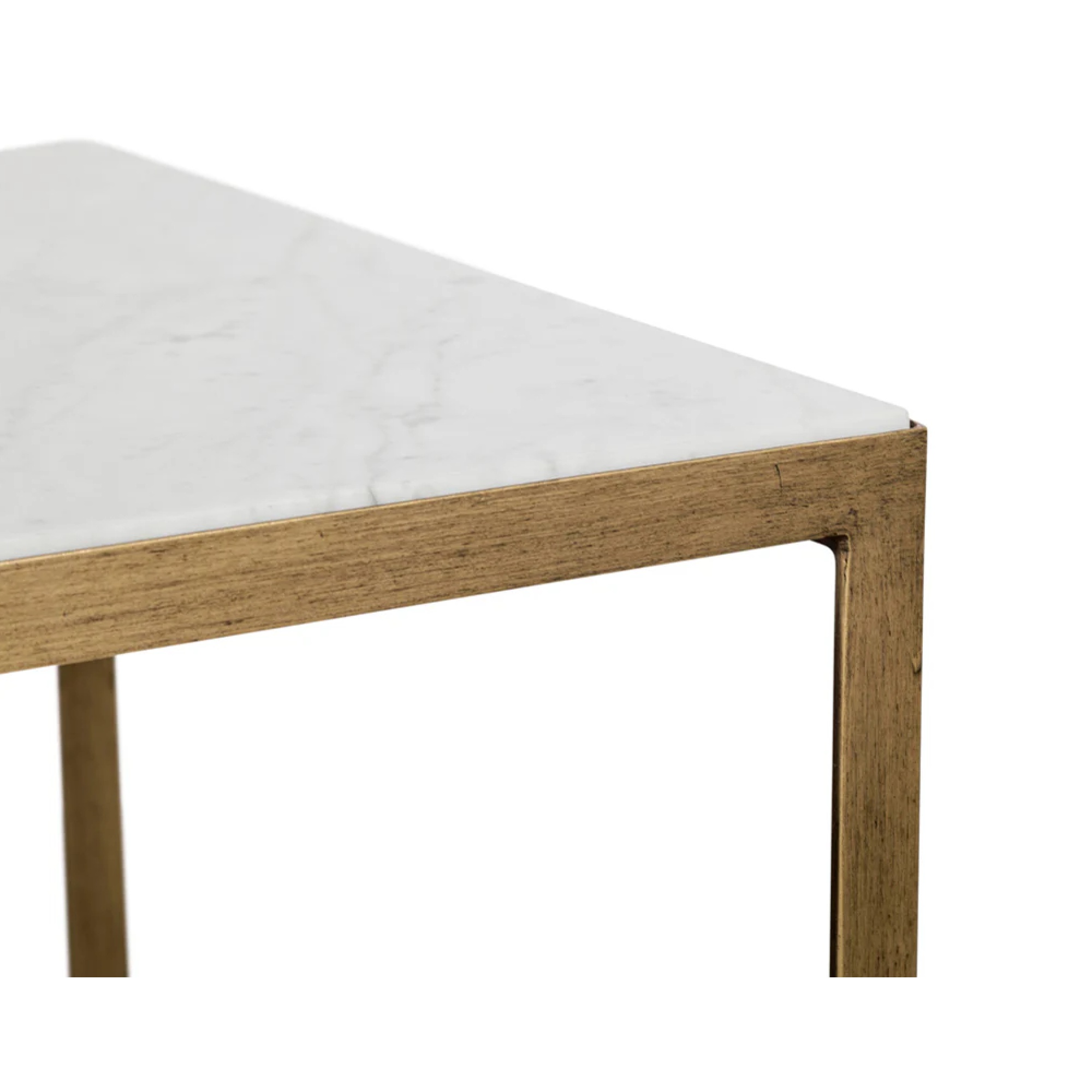 A beautiful modern marble coffee table. Tabletop features a 1″ layer of white Italian marble supported by an antique brass iron frame. Can be paired with our high profile Evert coffee table for added dimension. Each piece sold separately. As marble is a natural material, unique veining, pitting, fissures, micro-cracks and colour variations are all characteristics that add to the uniqueness and beauty of each piece
