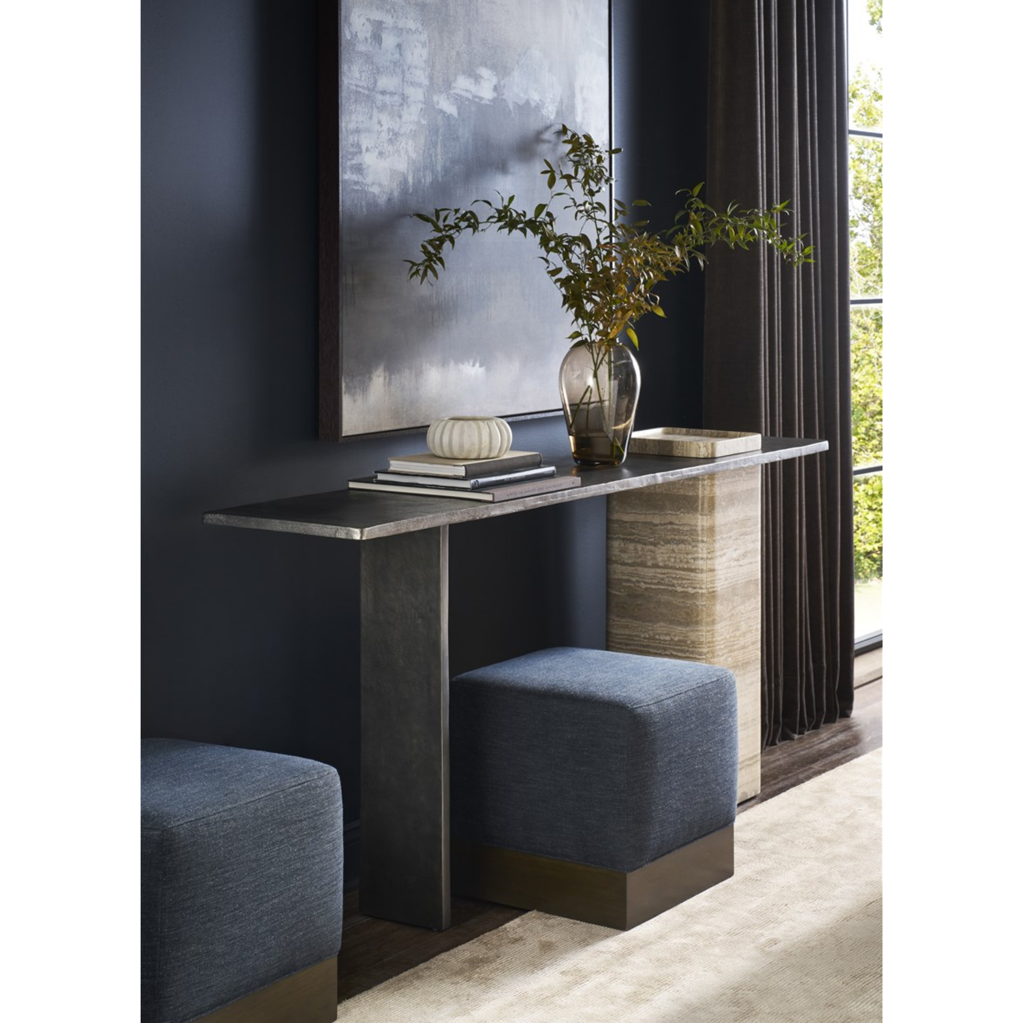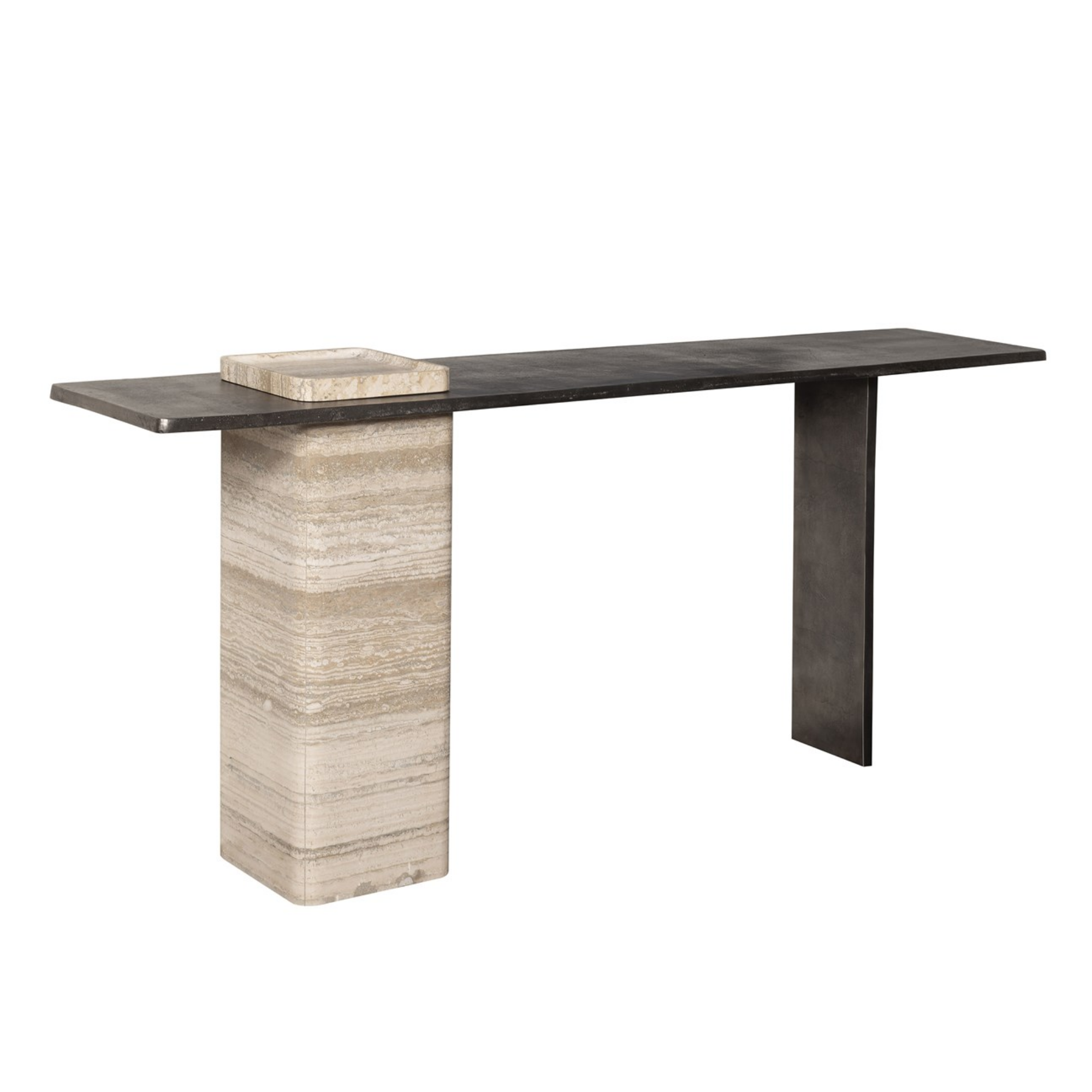 Finish Options Available. As Shown in – Finish: Charcoal Aluminum Top and Travertine Base.