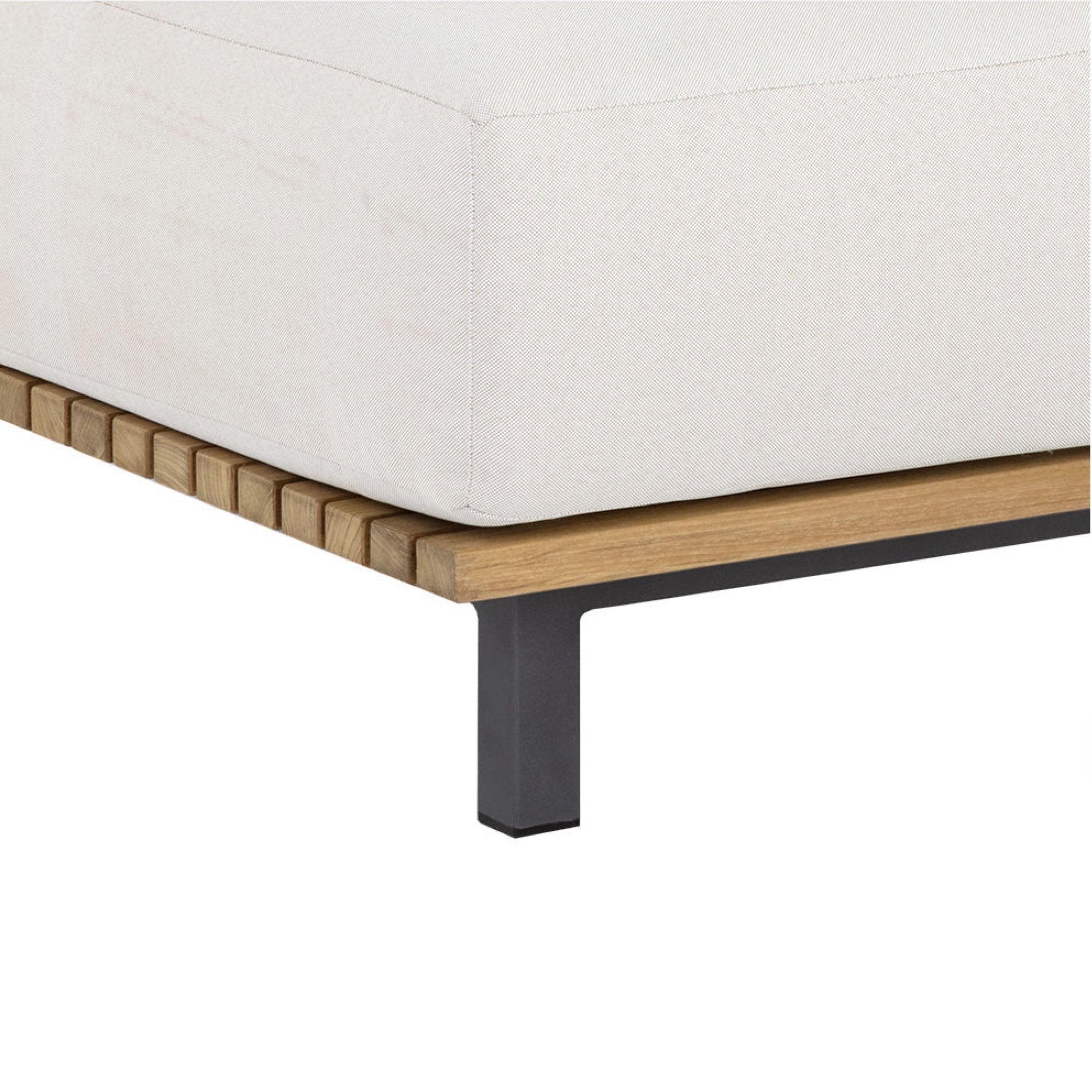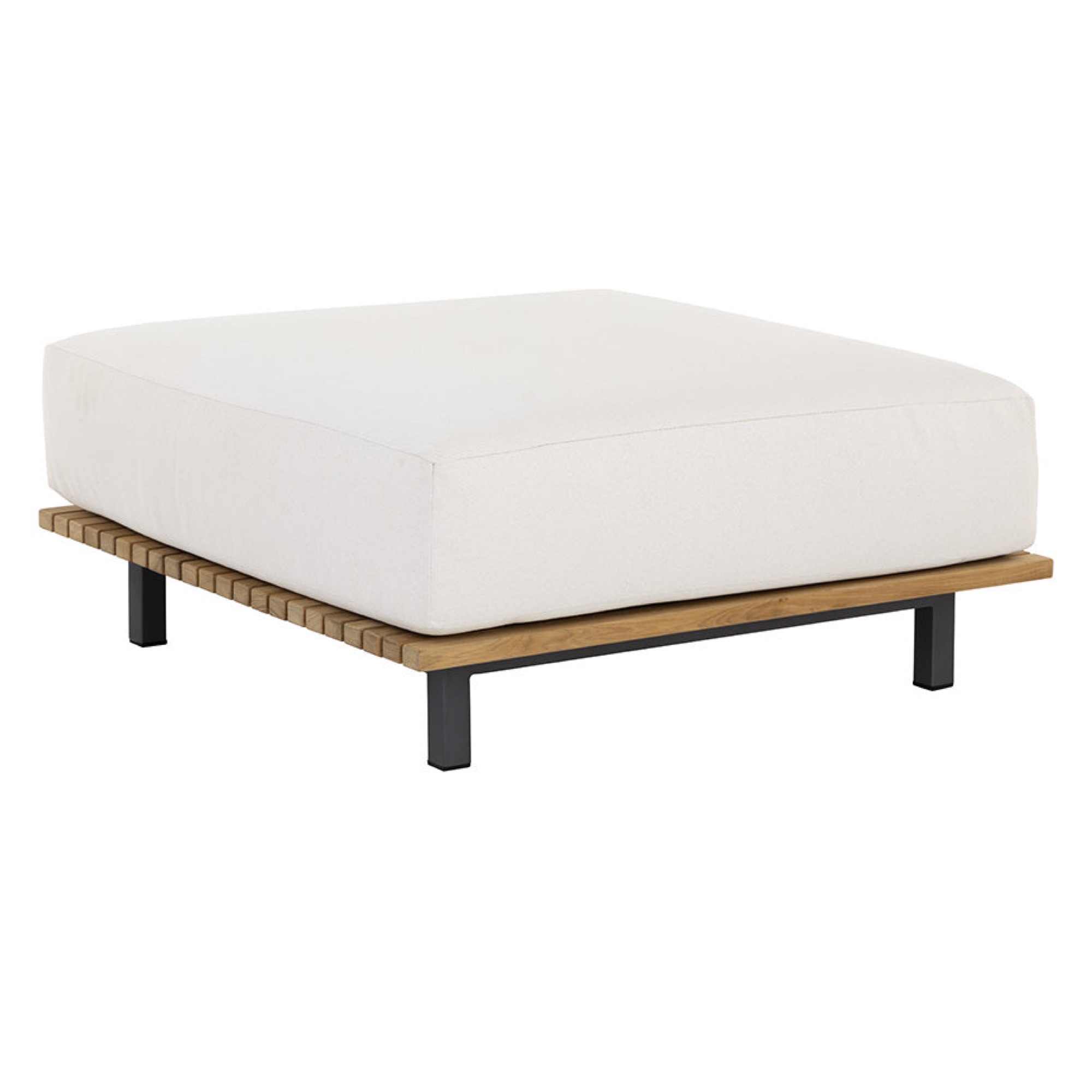 Appreciate warmth and sunlight while seated in an outdoor dining space inspired by the Arizona desert. This modern ottoman features upholstery in Palazzo cream fabric, atop a natural teak wood frame. Finished with a powder-coated aluminum base. Suitable for indoor and covered outdoor spaces.