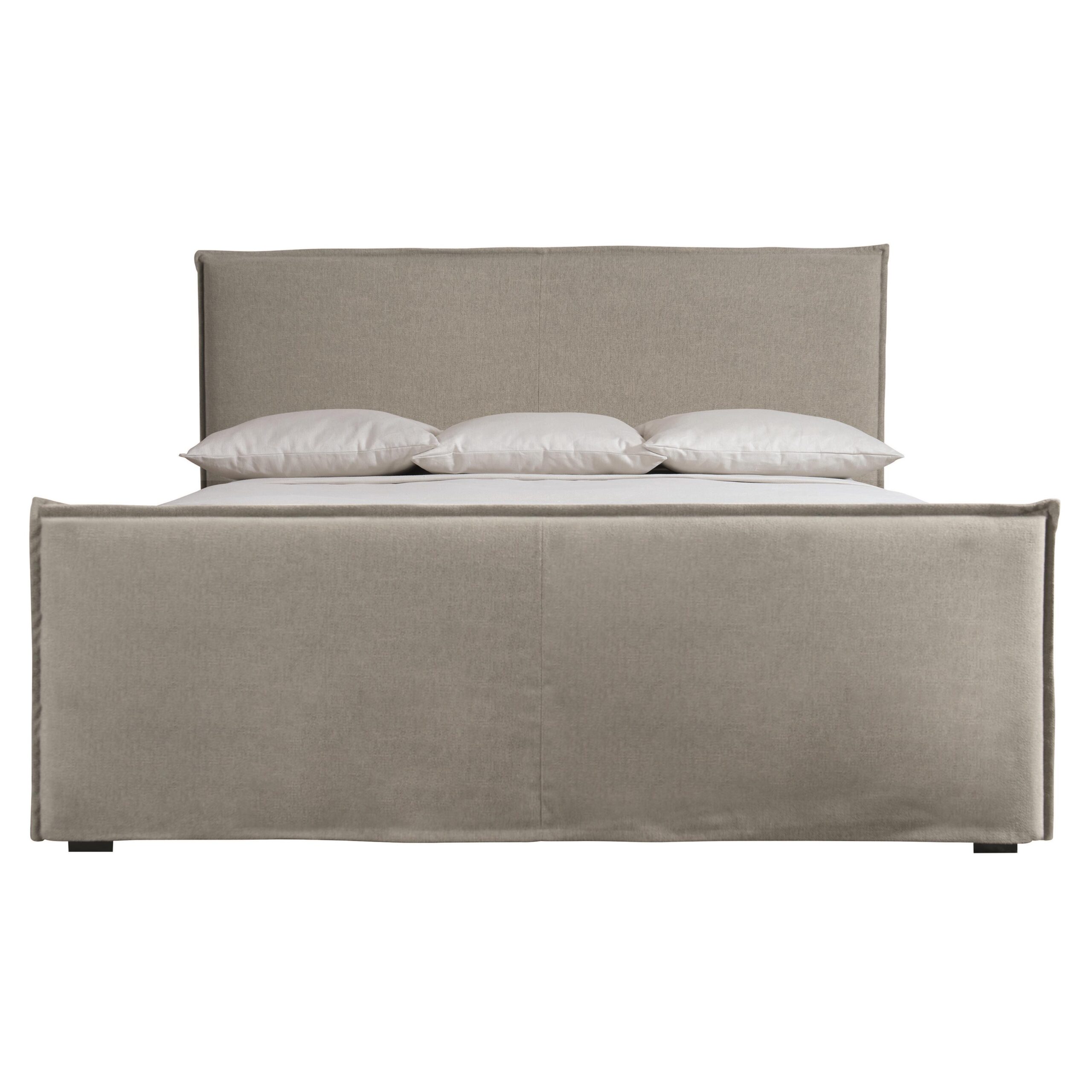Bringing an air of understated elegance, the Gerston slipcovered bed is fully upholstered and wrapped in muslin. Lightweight and breathable, the woven fabric looks and feels soft and natural. Stitched flanged edges on the headboard and footboard add subtle nuance to the clean, minimalist design. Exposed wood feet are finished in espresso.