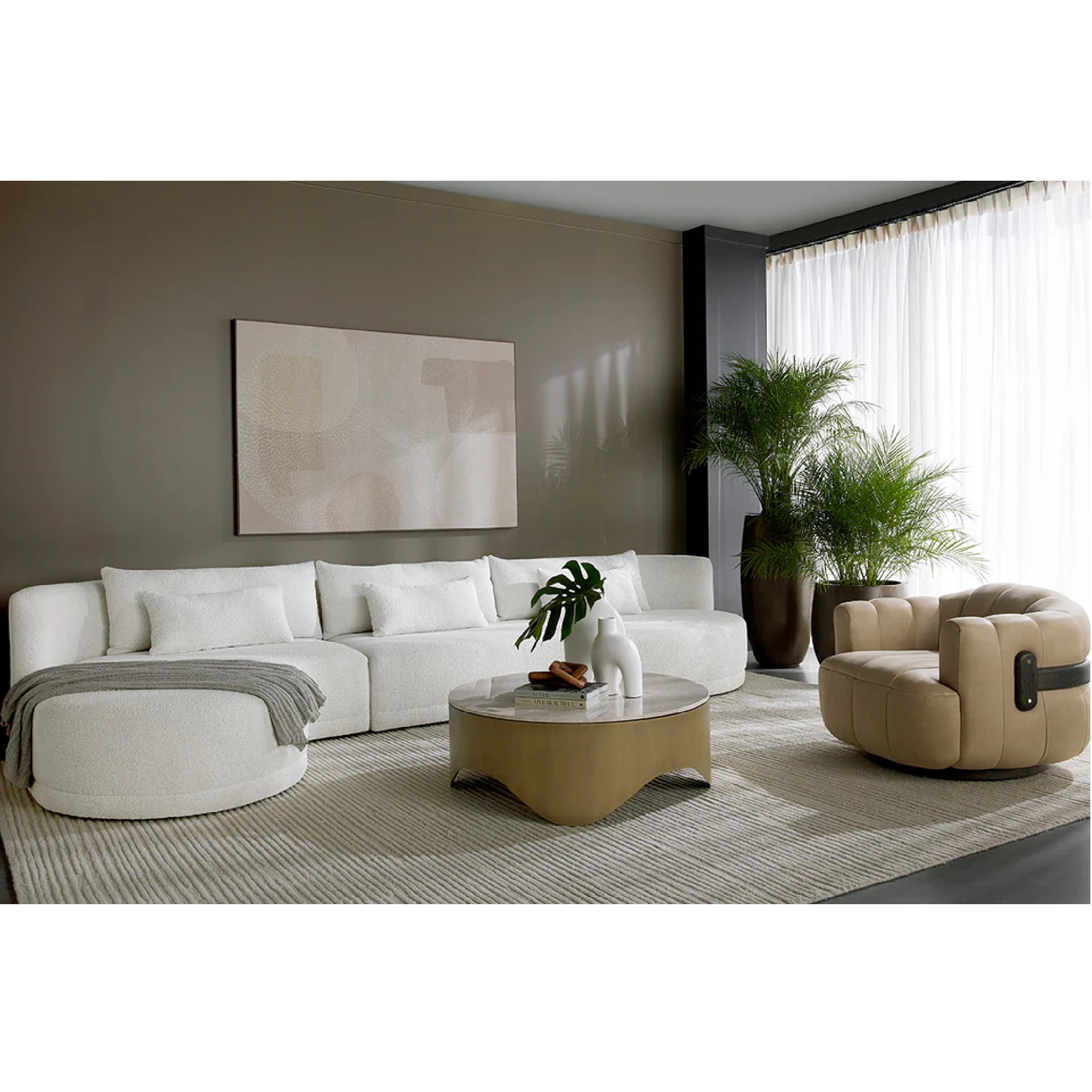 The Guinevere Coffee Table will be the crowning centrepiece of any living space. Characterized by a curvy base handcrafted from powder-coated iron with an antique brass finish. A crema Italian marble tabletop brings out the warm tones in this piece. As marble is a natural material, unique veining, pitting, fissures, micro-cracks and colour variations are all characteristics that add to the uniqueness and beauty of each piece. Made in India. With refined craftsmanship, this design was brought to life by skilled local artisans. Due to the nature of handcraftsmanship, unique imperfections such as fissures, markings and variations in colour and shape are welcomed and appreciated characteristics for a truly one-of-a-kind piece.