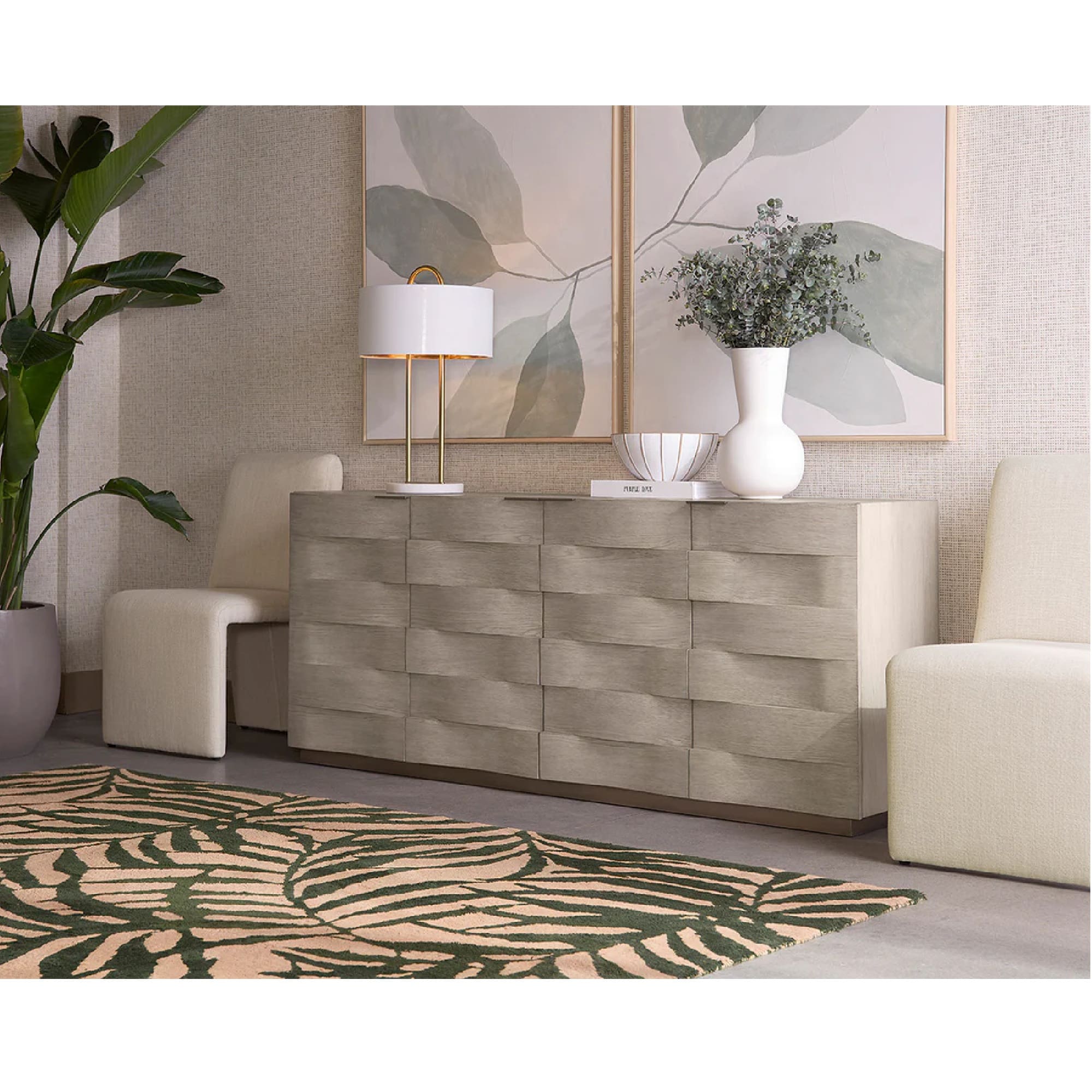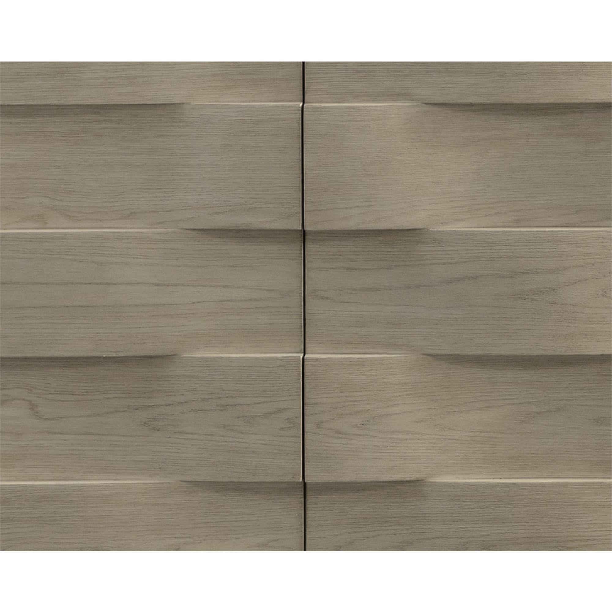 Crafted from poplar wood and oak veneer with warm brass aluminum handles.