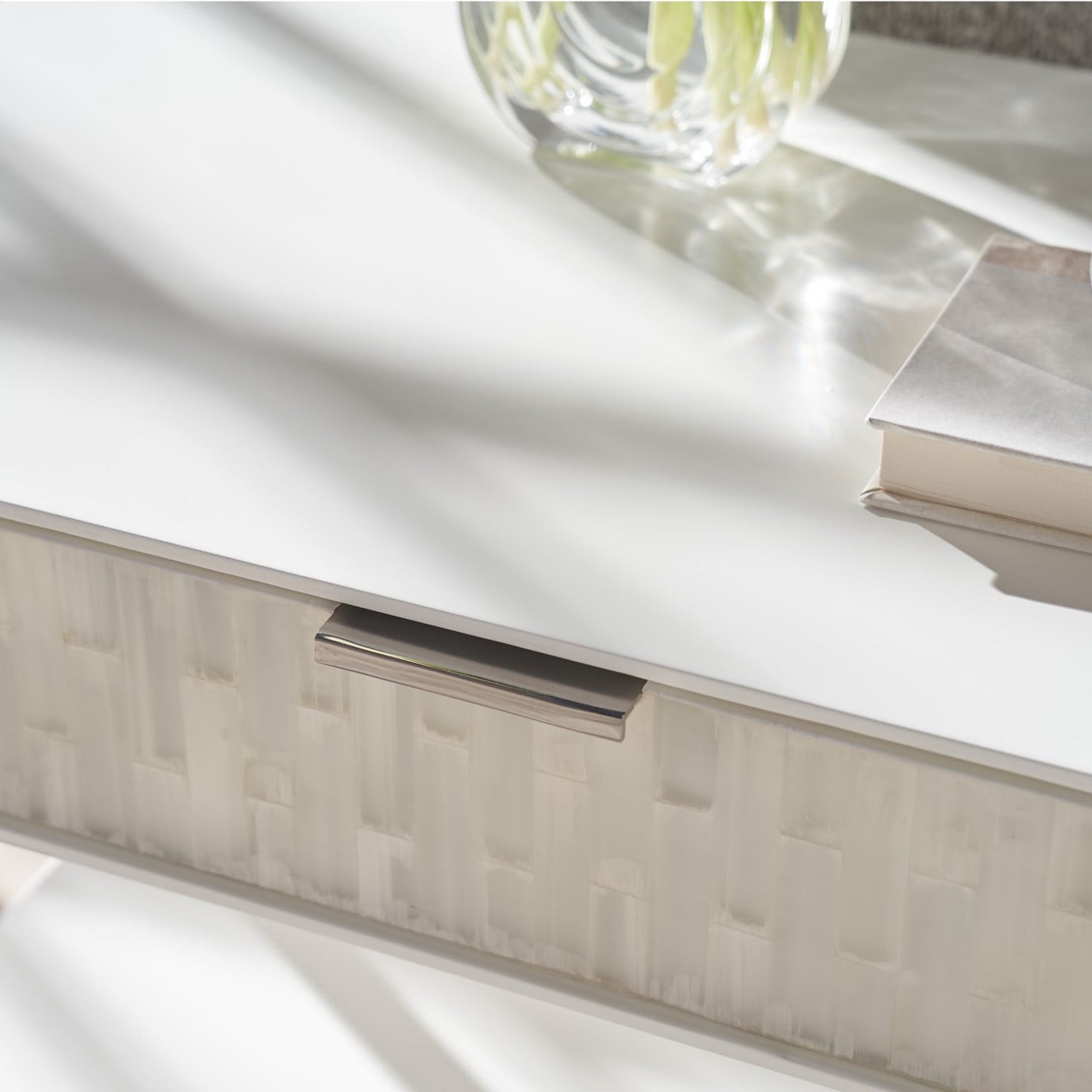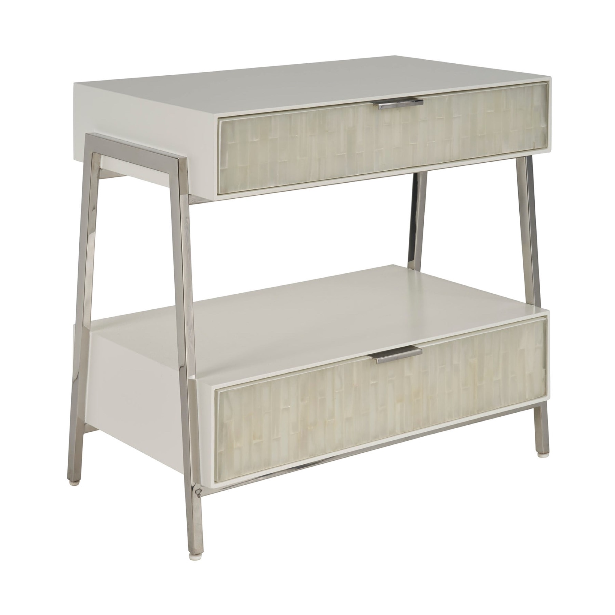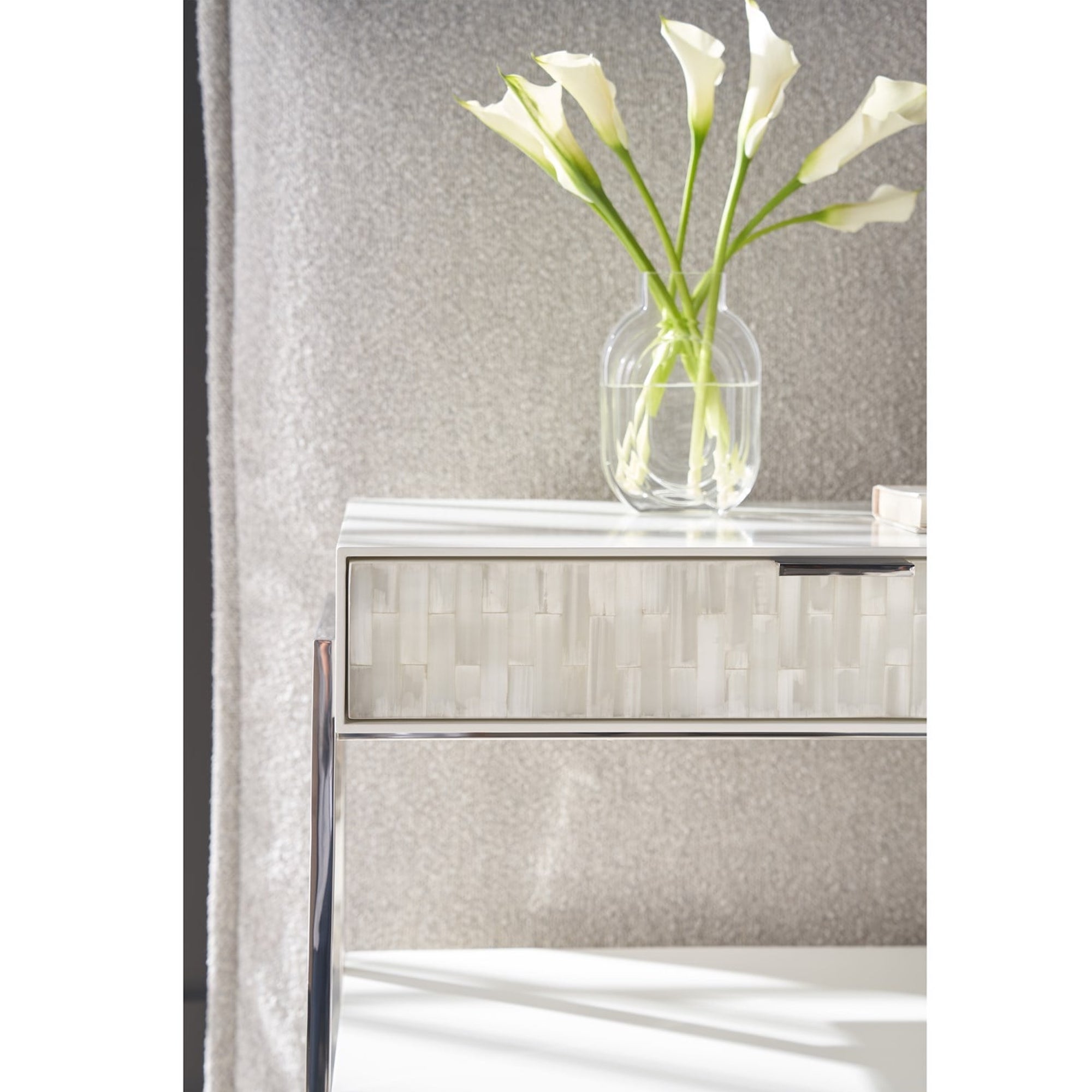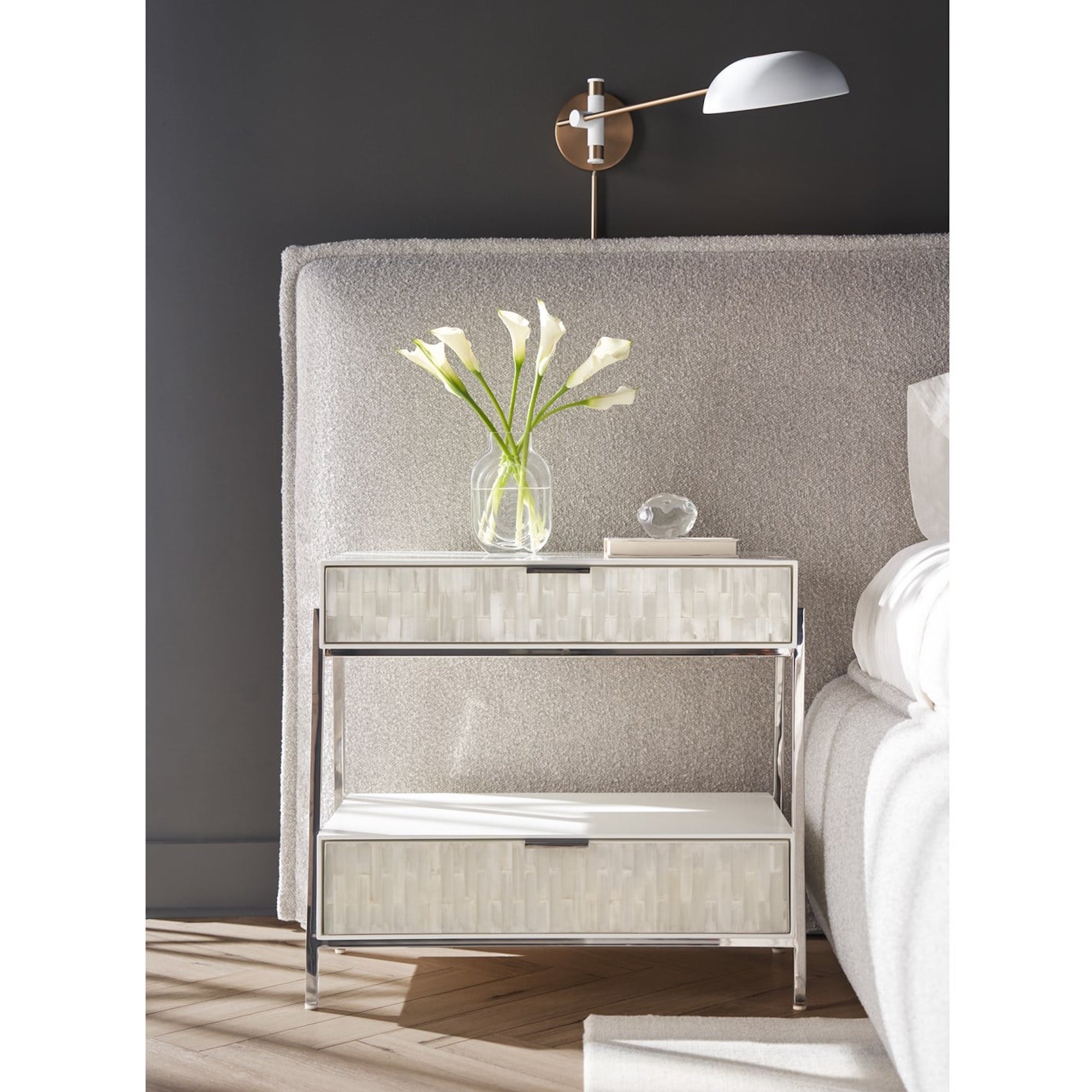 The Ingrid Nightstand presents an elevated design with two drawers, showcasing stunning selenite fronts set against a sleek polished nickel base. This piece epitomizes clean, refined aesthetics, offering an ultra-modern touch that seamlessly integrates into sophisticated bedroom interiors.