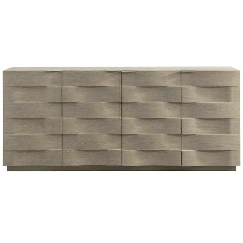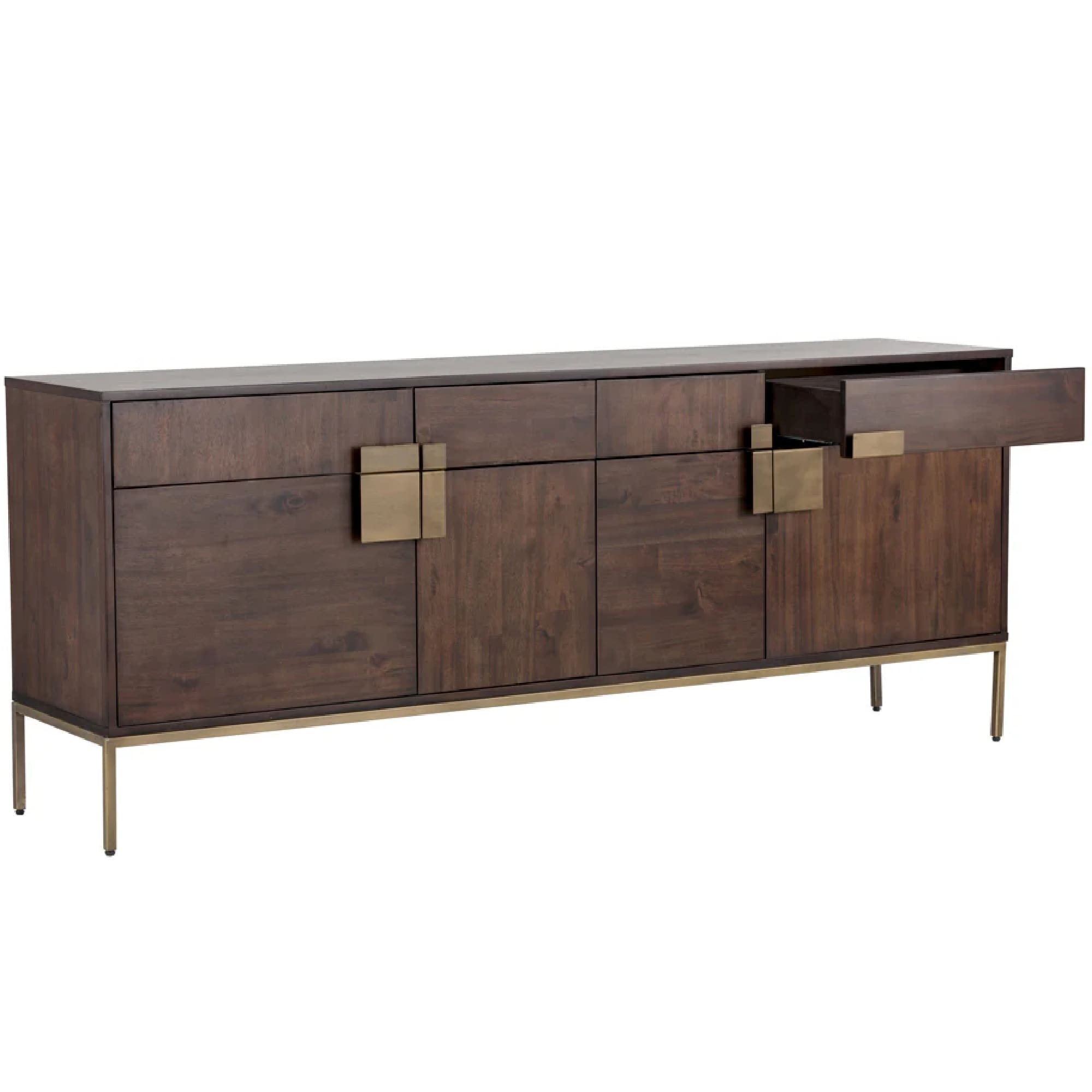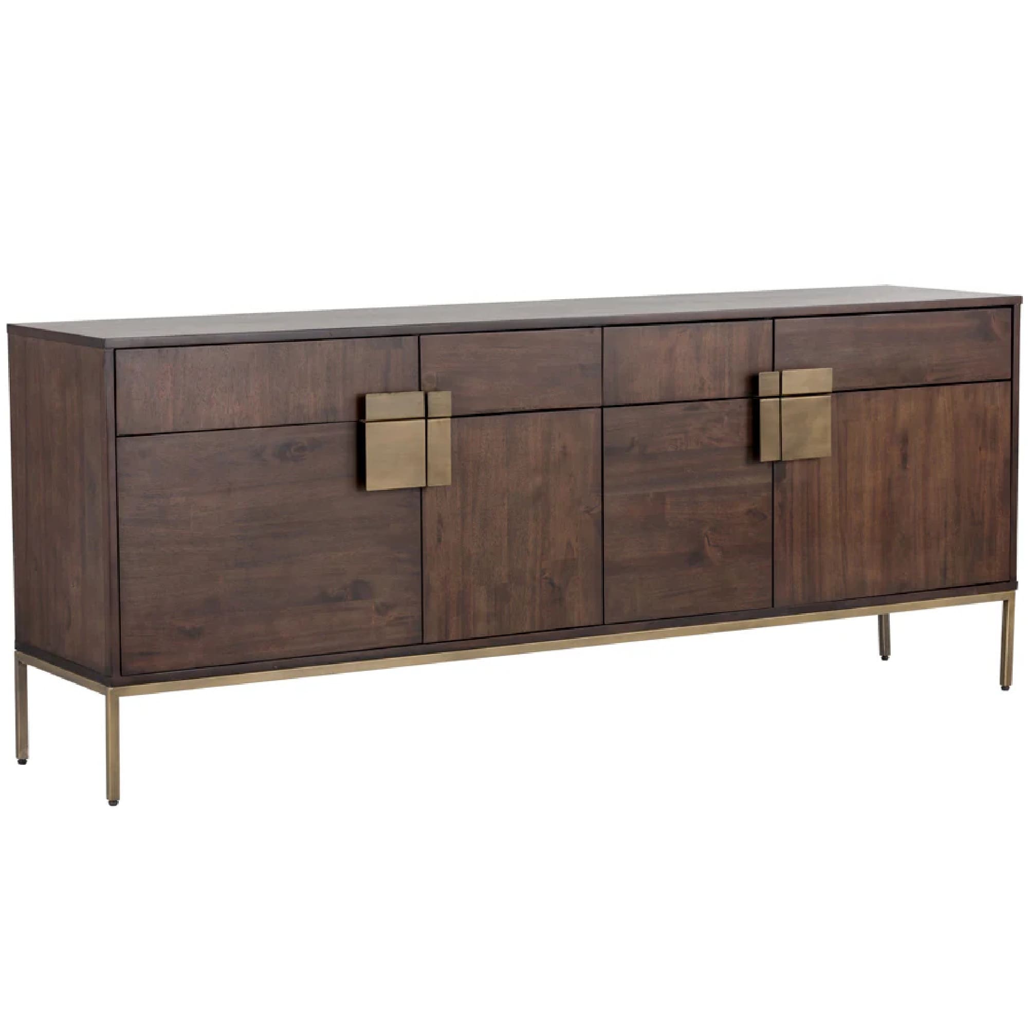 Made from acacia wood veneer with four drawers and two large cabinets with alternating wood grain patterns on the drawer fronts and antique brass hardware.