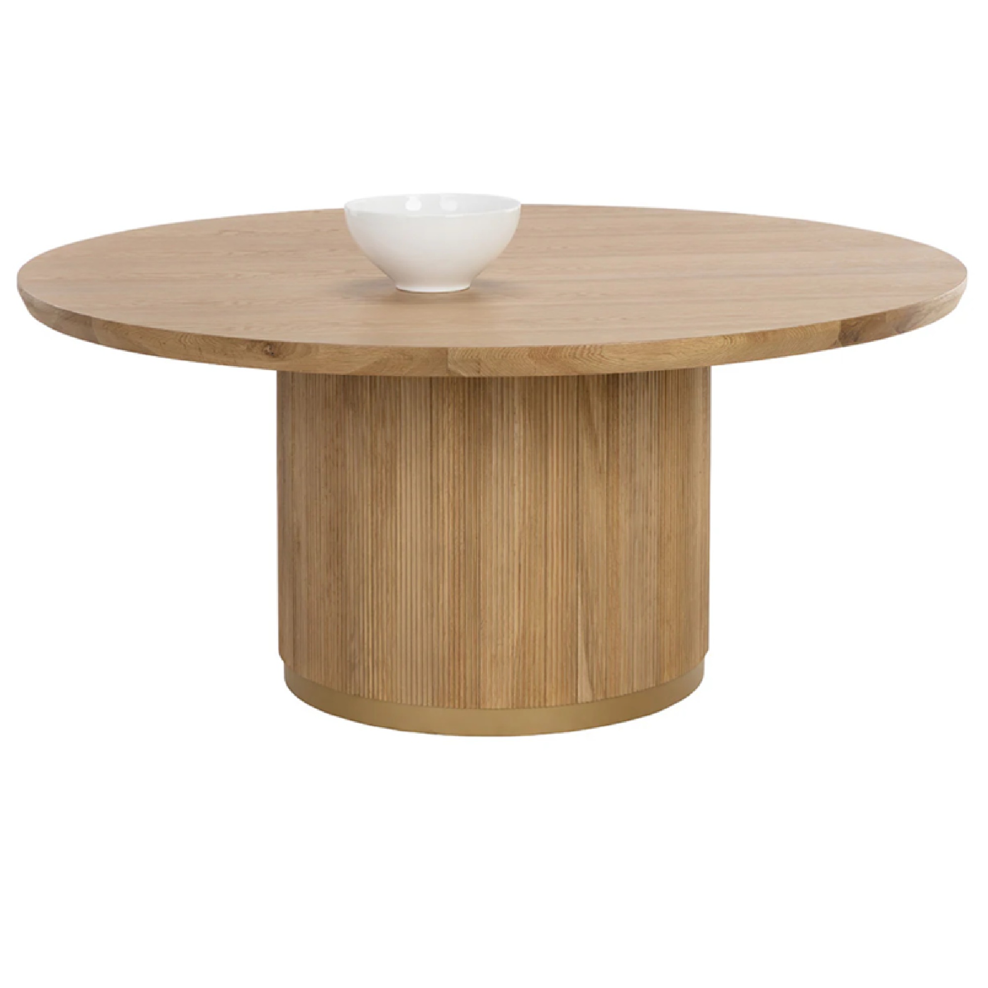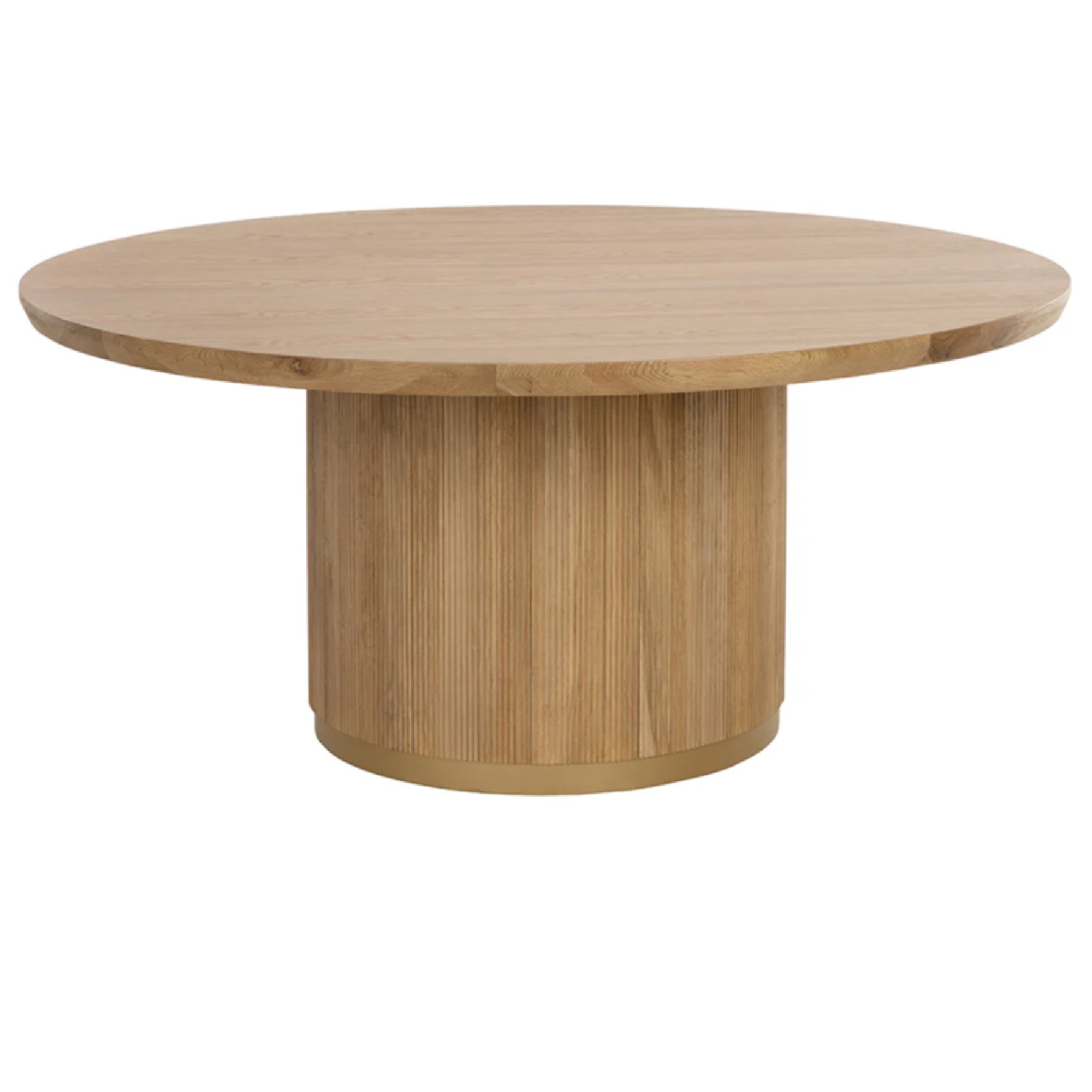 The Kalla Dining Table is a rustic masterpiece crafted from oak wood and oak veneer with vertical reeding. Its multiple iterations feature chamfered edges, solid oak bases, and brushed gold steel accents, combining traditional craftsmanship with contemporary elegance.