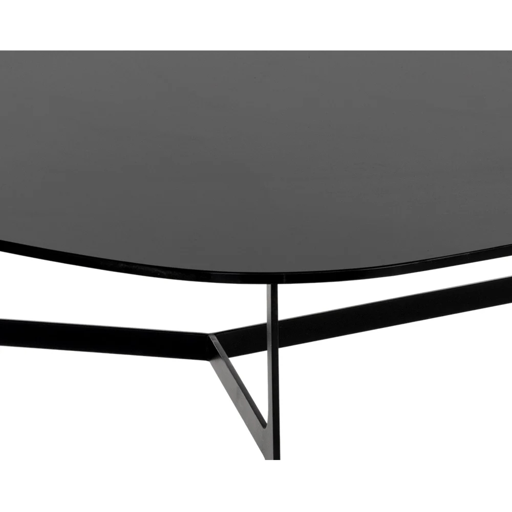 With a charming curved design, this coffee table boasts a mid-century modern appeal. Features a painted black glass top and completed with a matte black metal frame.