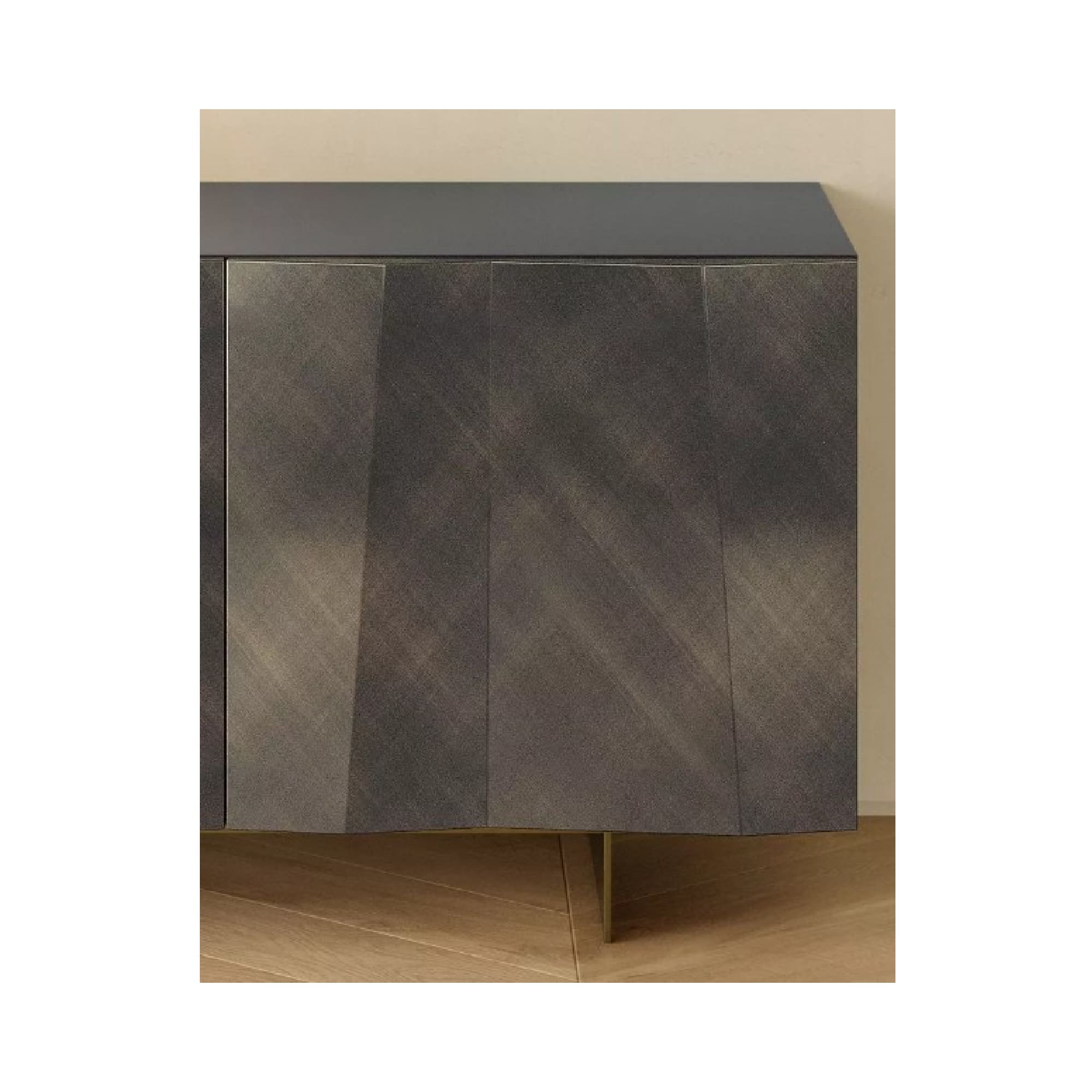 Sideboard in wood with silver lacquered door fronts (other finishes available) with clear glass interior shelves. Top and sides available in various matt lacquered finishes. Lacquered metal feet available in various finishes. Also available without metal feet 27.5″ high, and available 56.75″ wide with or without feet.