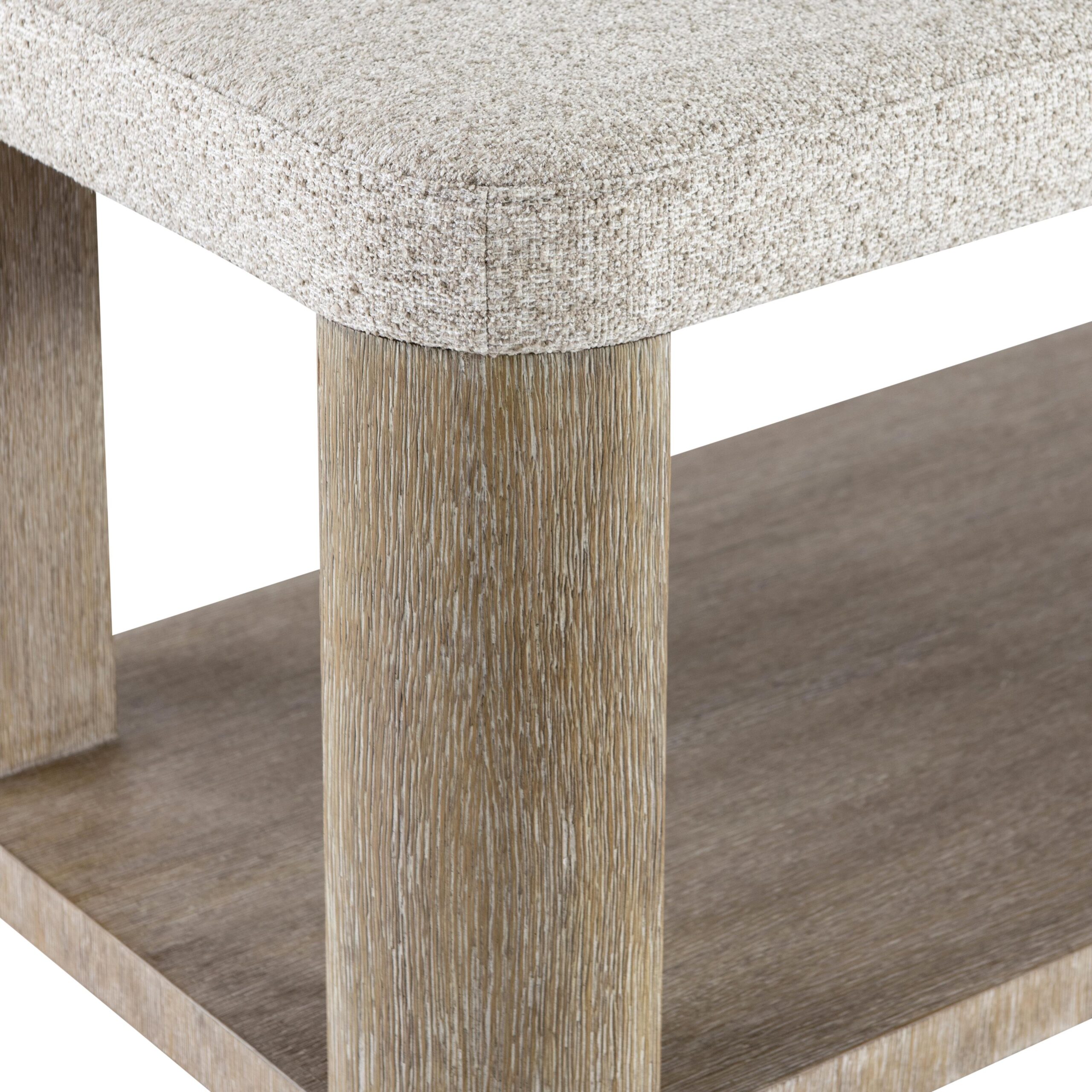 Upholstered top with wire-brushed oak open base with shelf in Aria finish