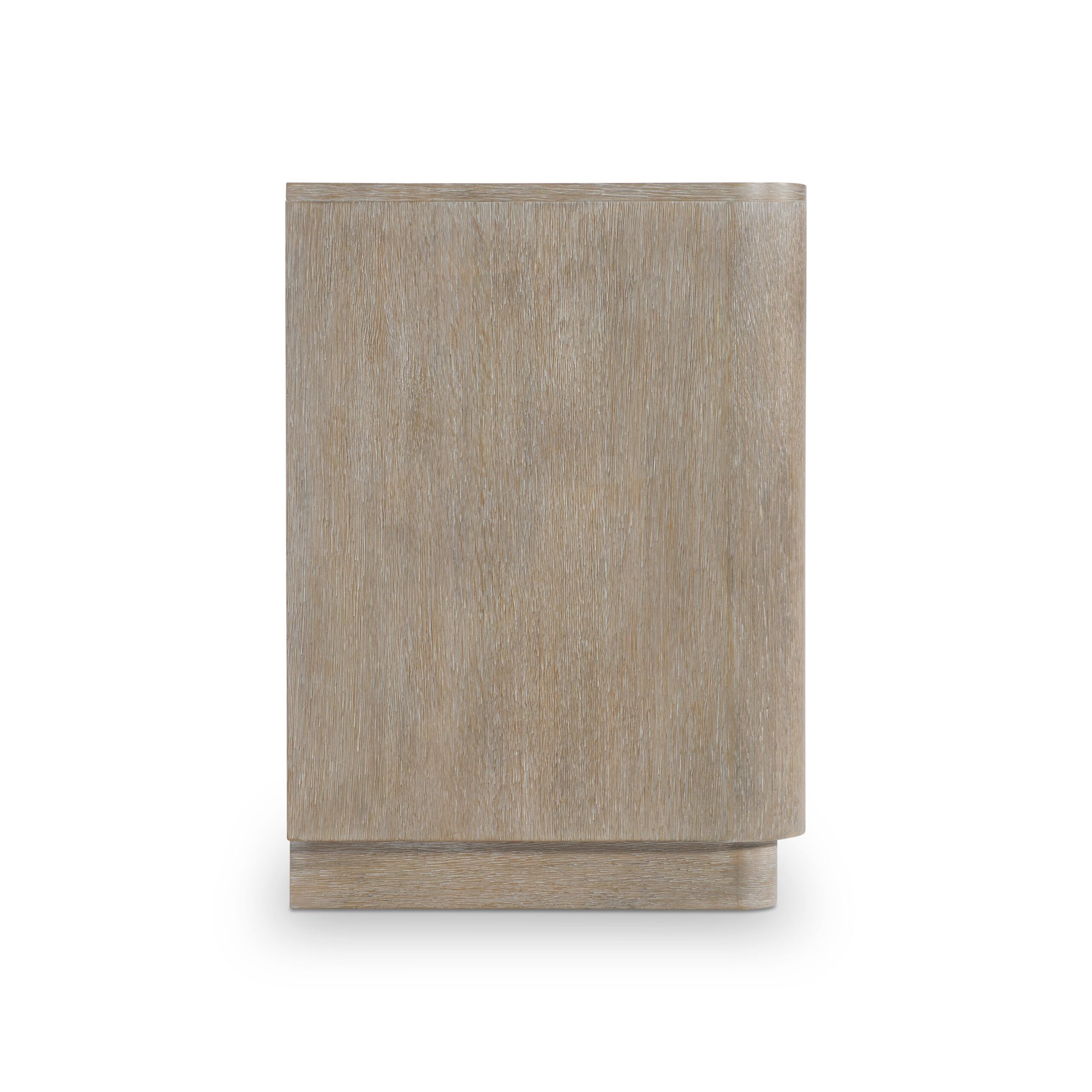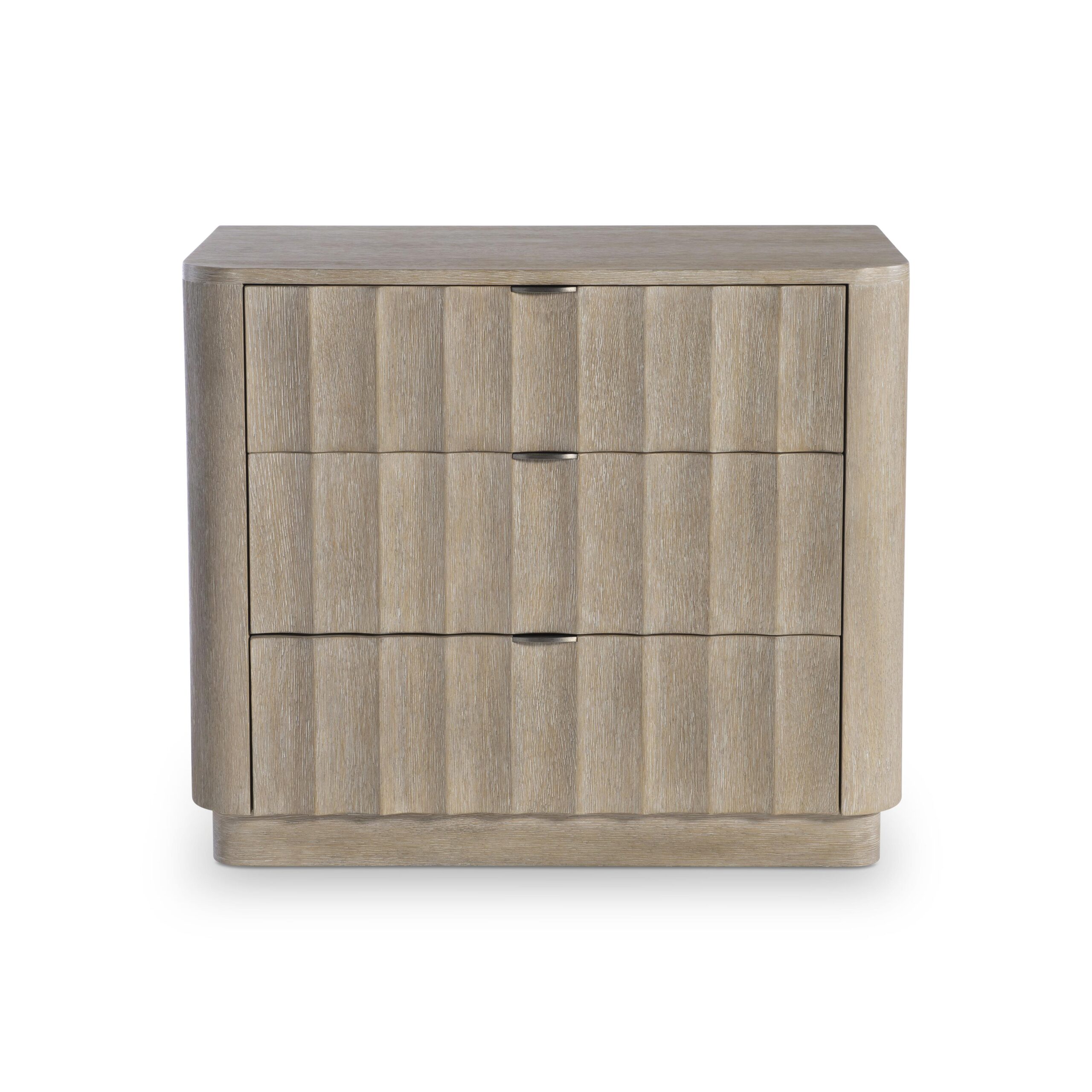 The Loggia nightstand patterns contrast and dimension with stunning fluting on its three drawer fronts. Finished in Aria, the case sits on a plinth base and supports a wood top with rounded corners. The drawers feature metal tab pulls finished in Laurion. A two-port A+C USB charging unit is also included.
