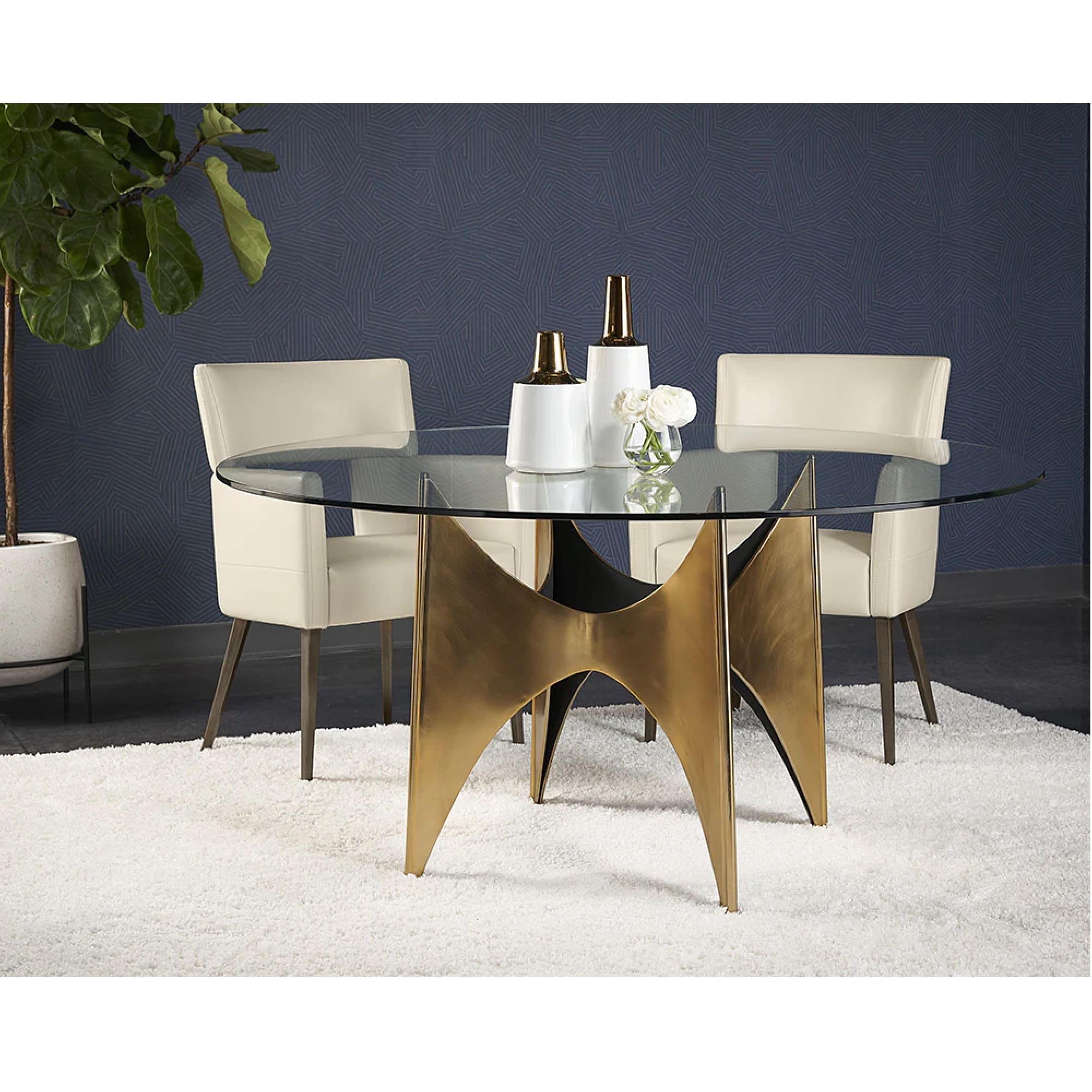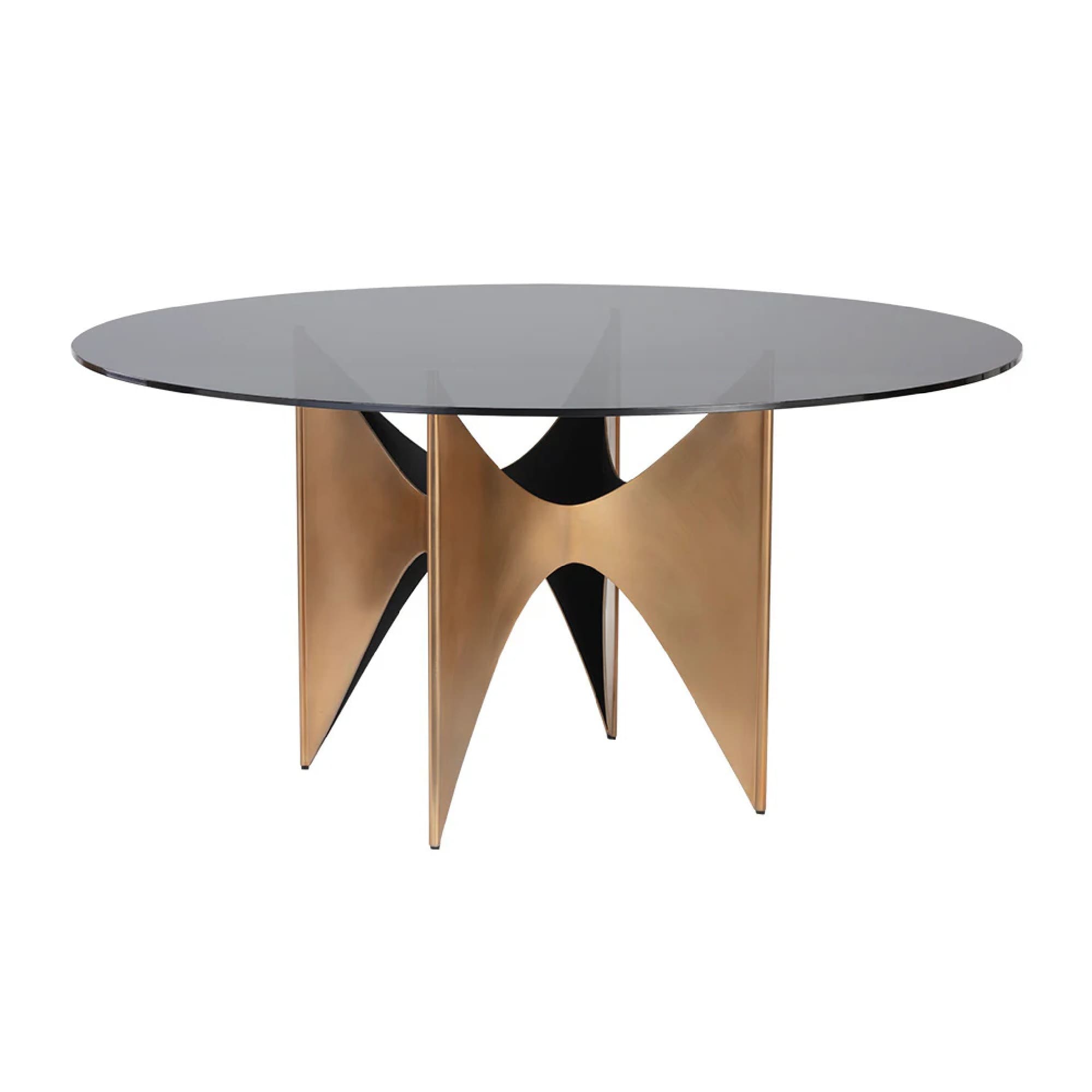 Dining table base featuring a stainless steel base with a brushed antique gold finish.