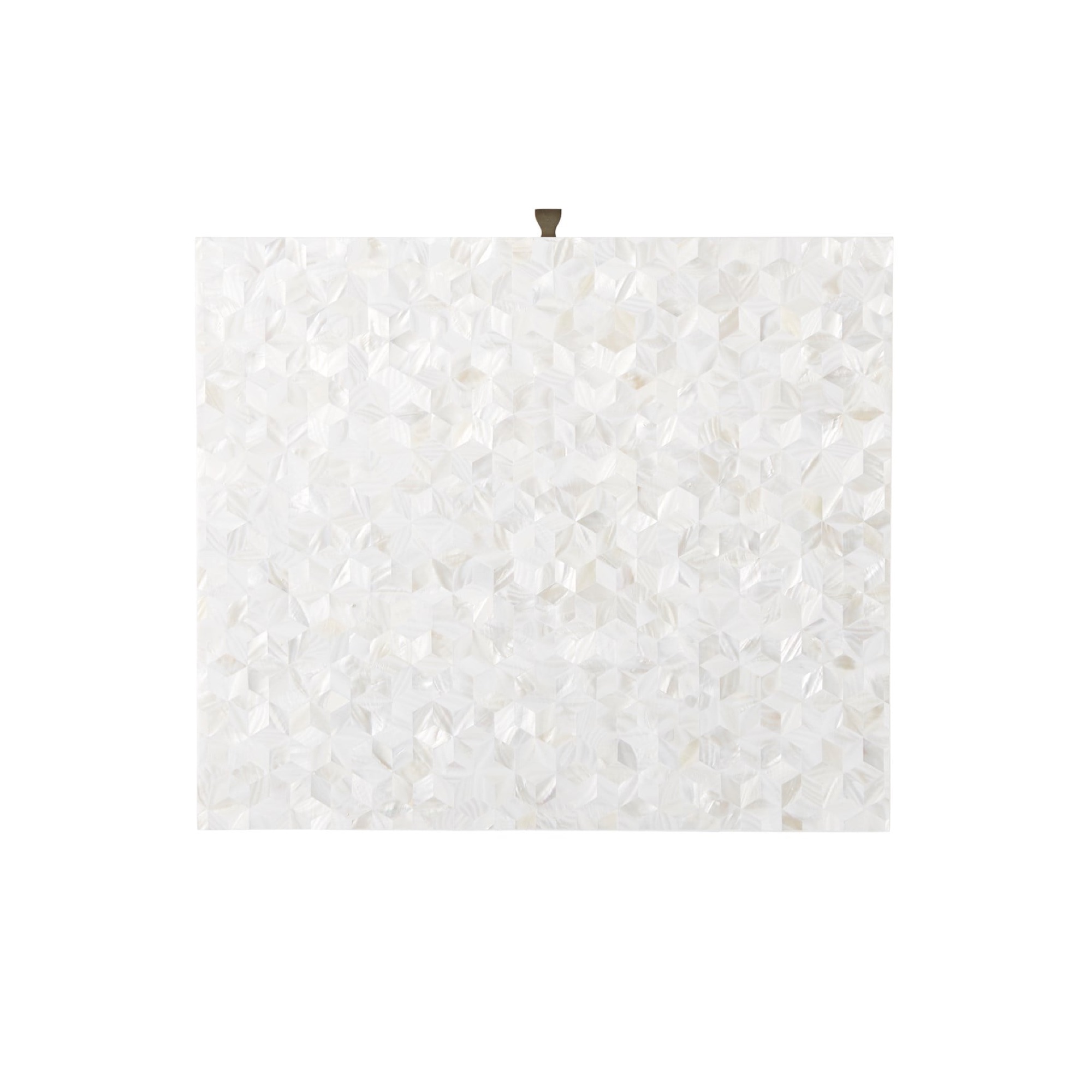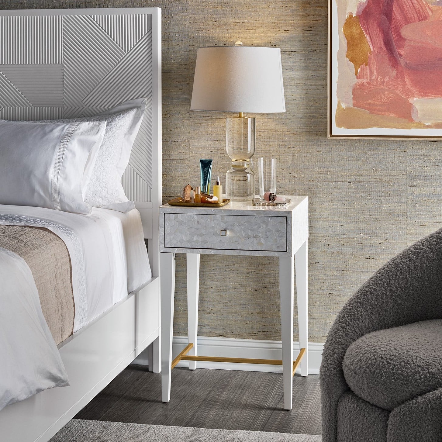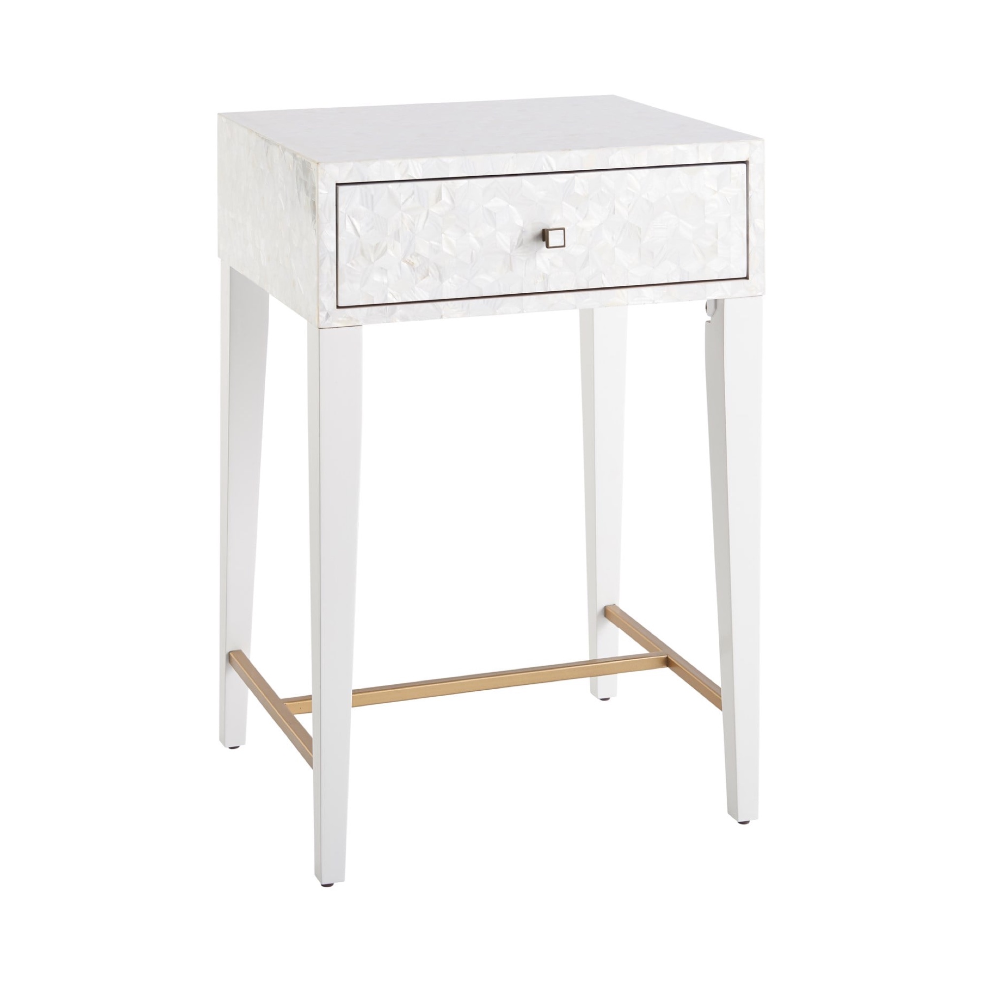 The Love Joy Bliss Bedside Table harmoniously exudes a perfect pairing of textures, with a mother of pearl overlay on the tabletop and drawer front, paired with a complementing white lacquer base. A sleek, linear design in soft gold metal adds additional interest and style at the base.