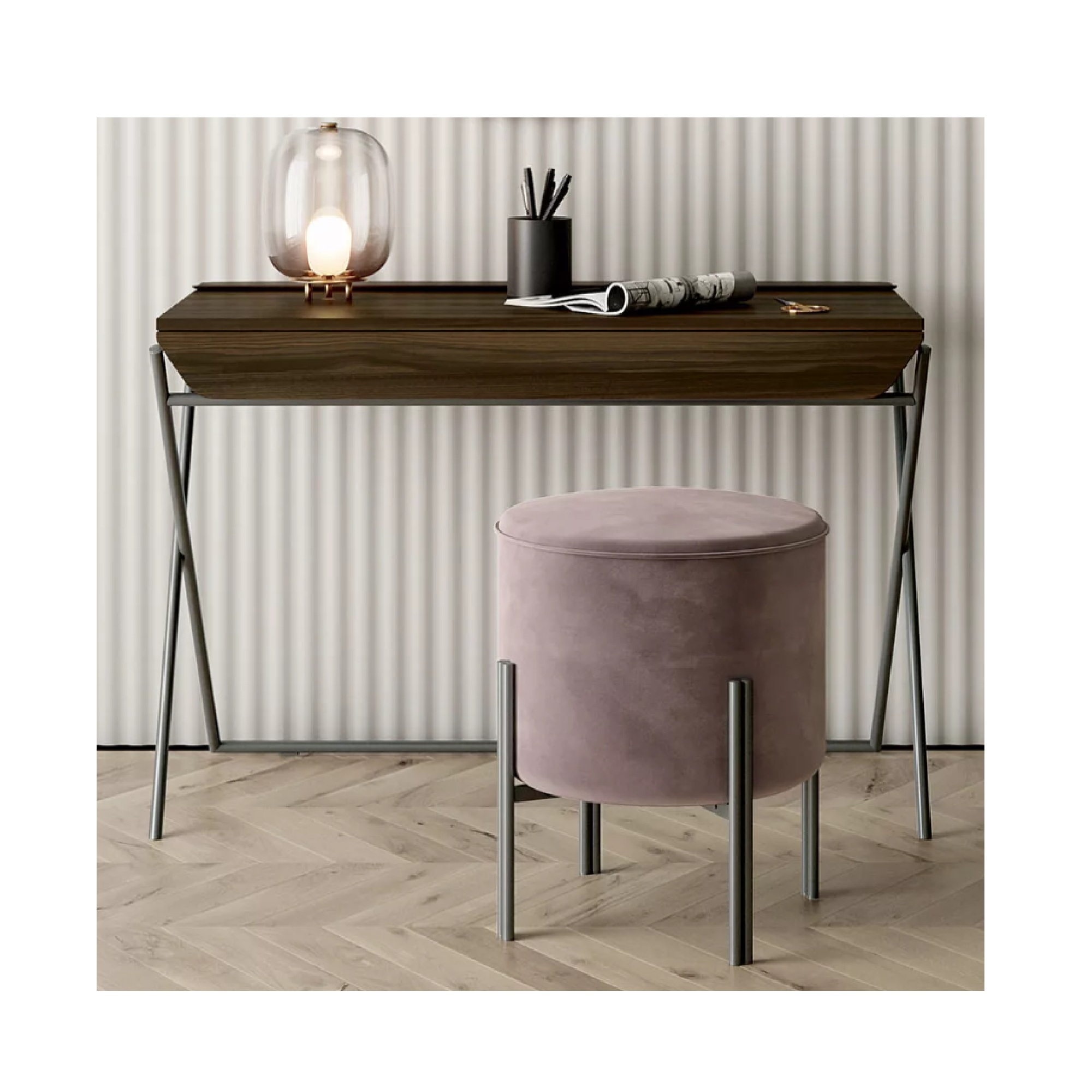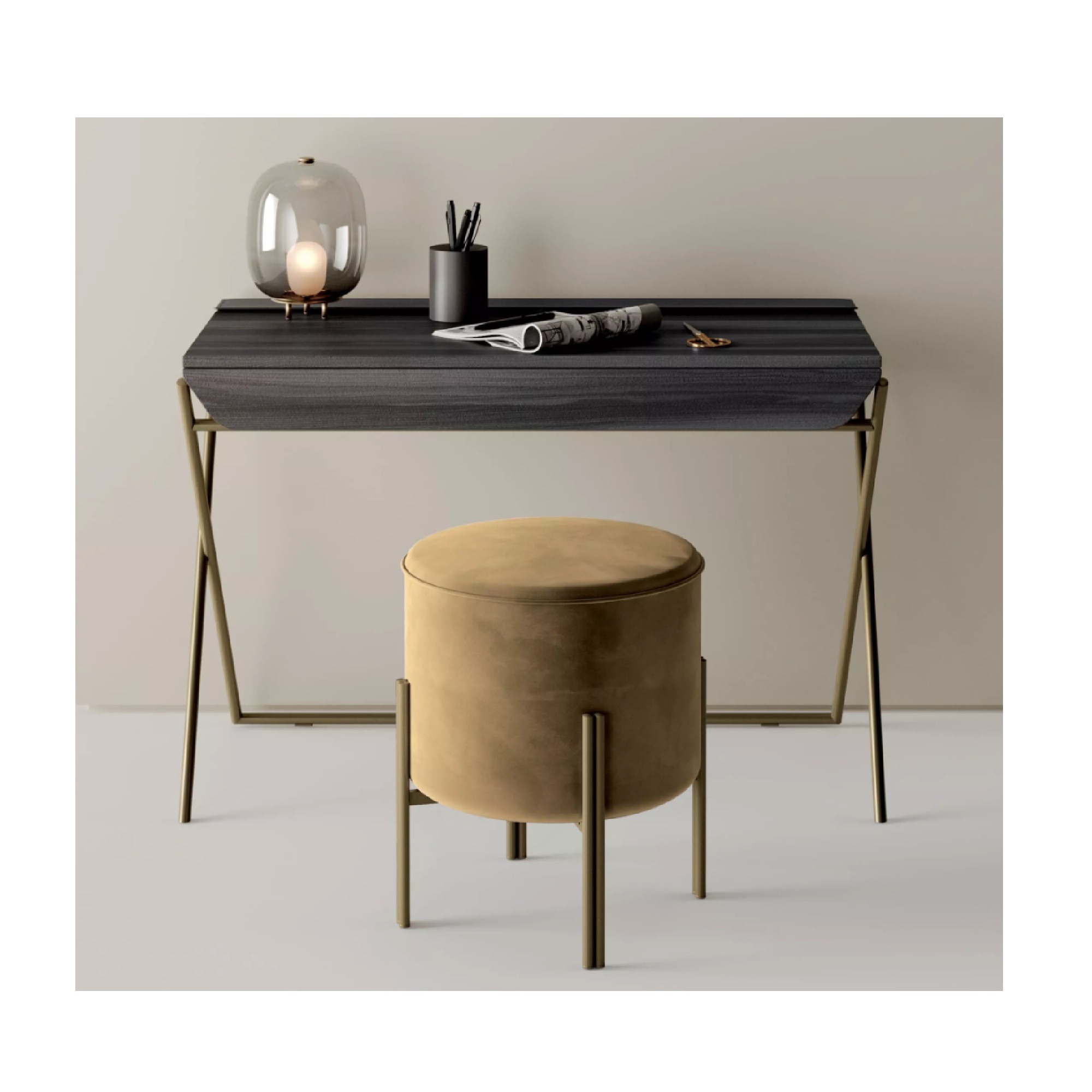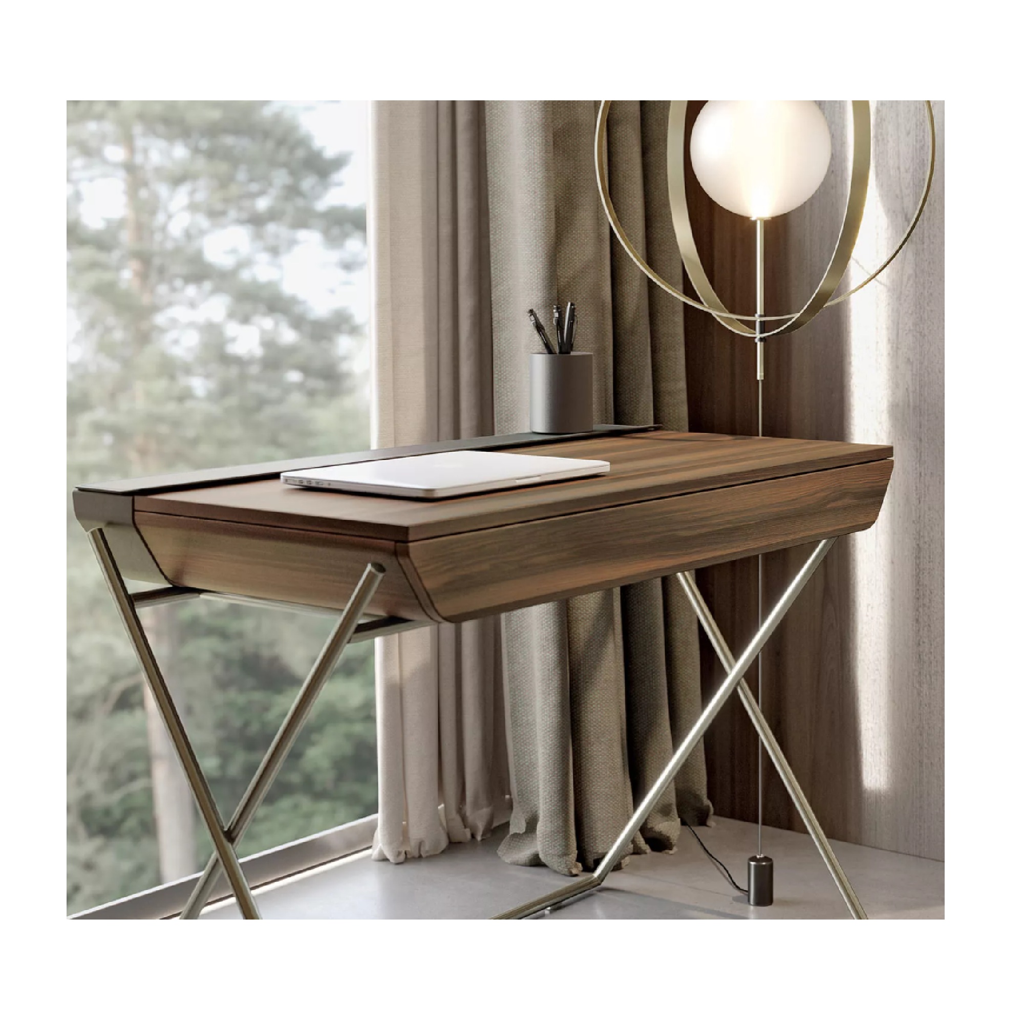 The Matisse Desk combines contemporary elegance with functional design. Featuring a sleek metal frame available in a variety of lacquered finishes, it pairs seamlessly with a wood veneer top and drawer, while the storage compartment can be customized in leather for a luxurious touch. Perfect for a modern home office or workspace, this desk balances style, practicality, and craftsmanship.