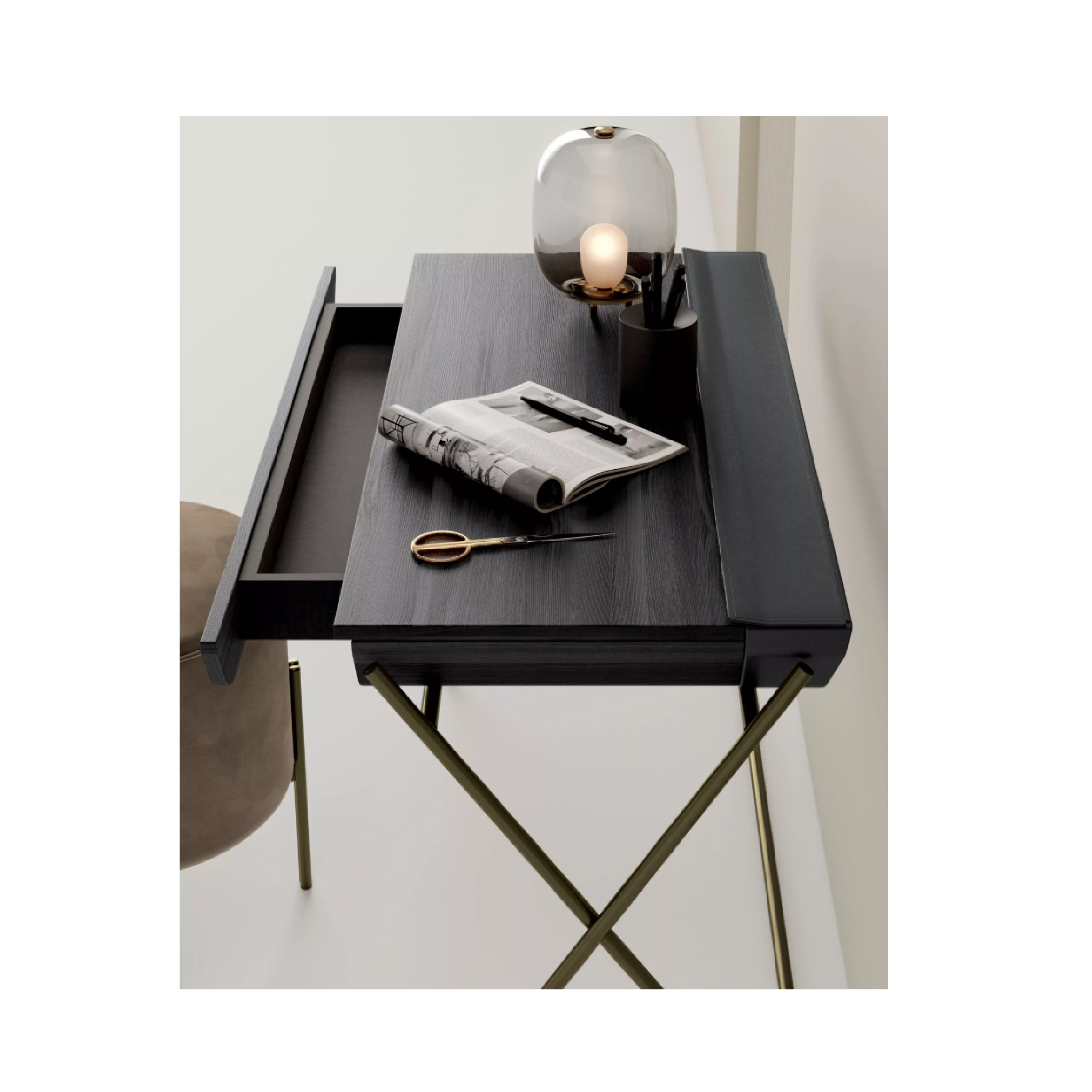 Desk with metal frame in various lacquered finish options. Top and drawer in wood veneer options and storage compartment in options of leather.