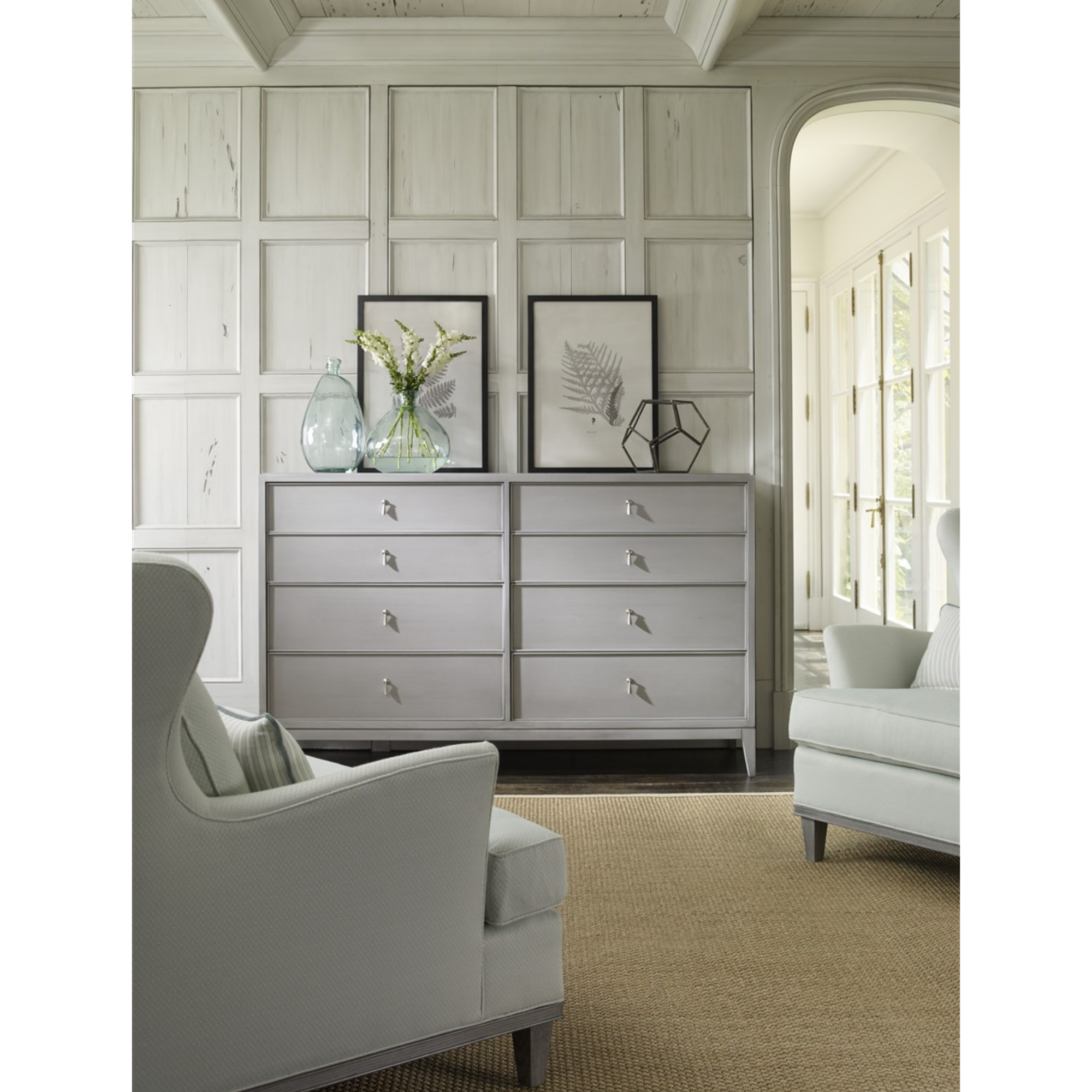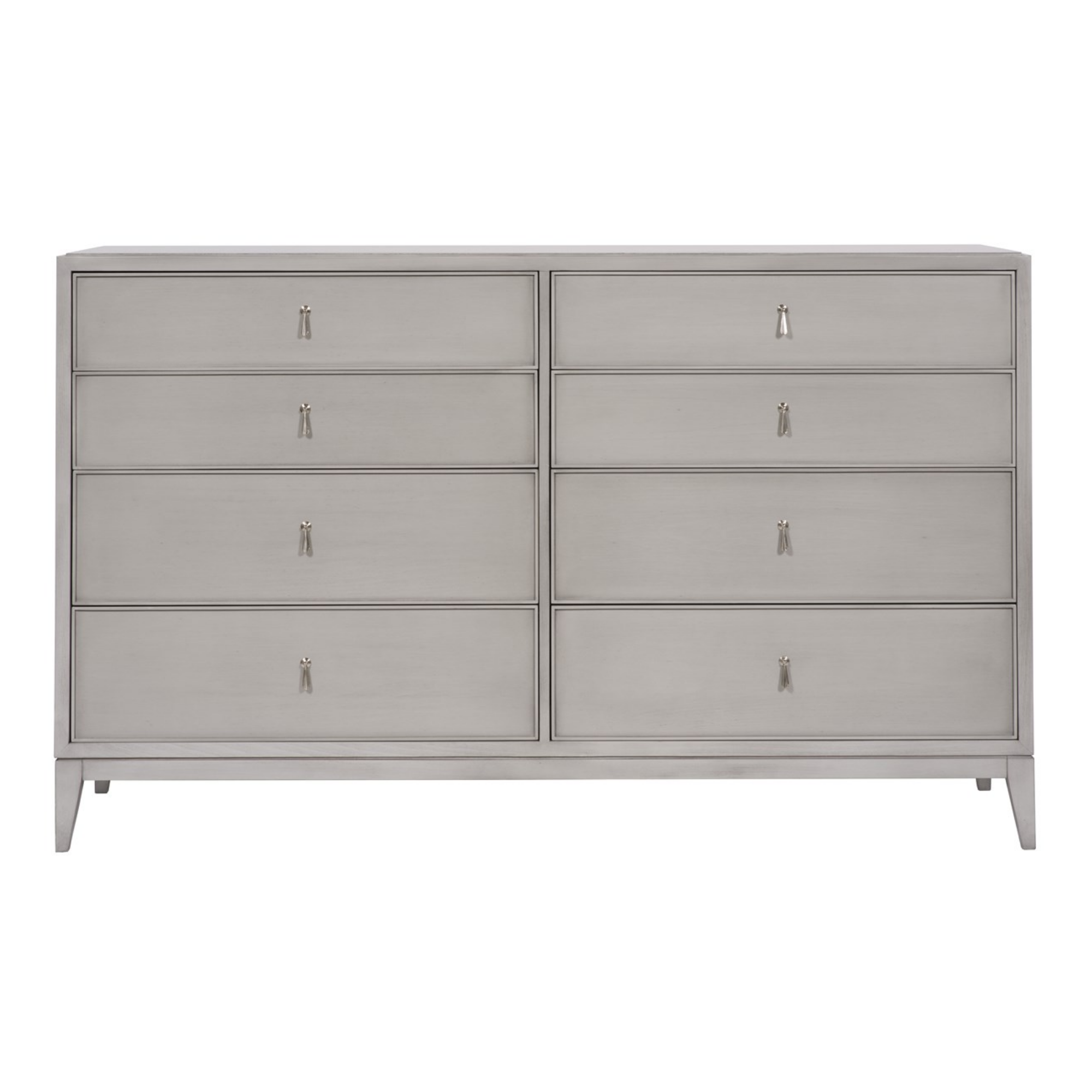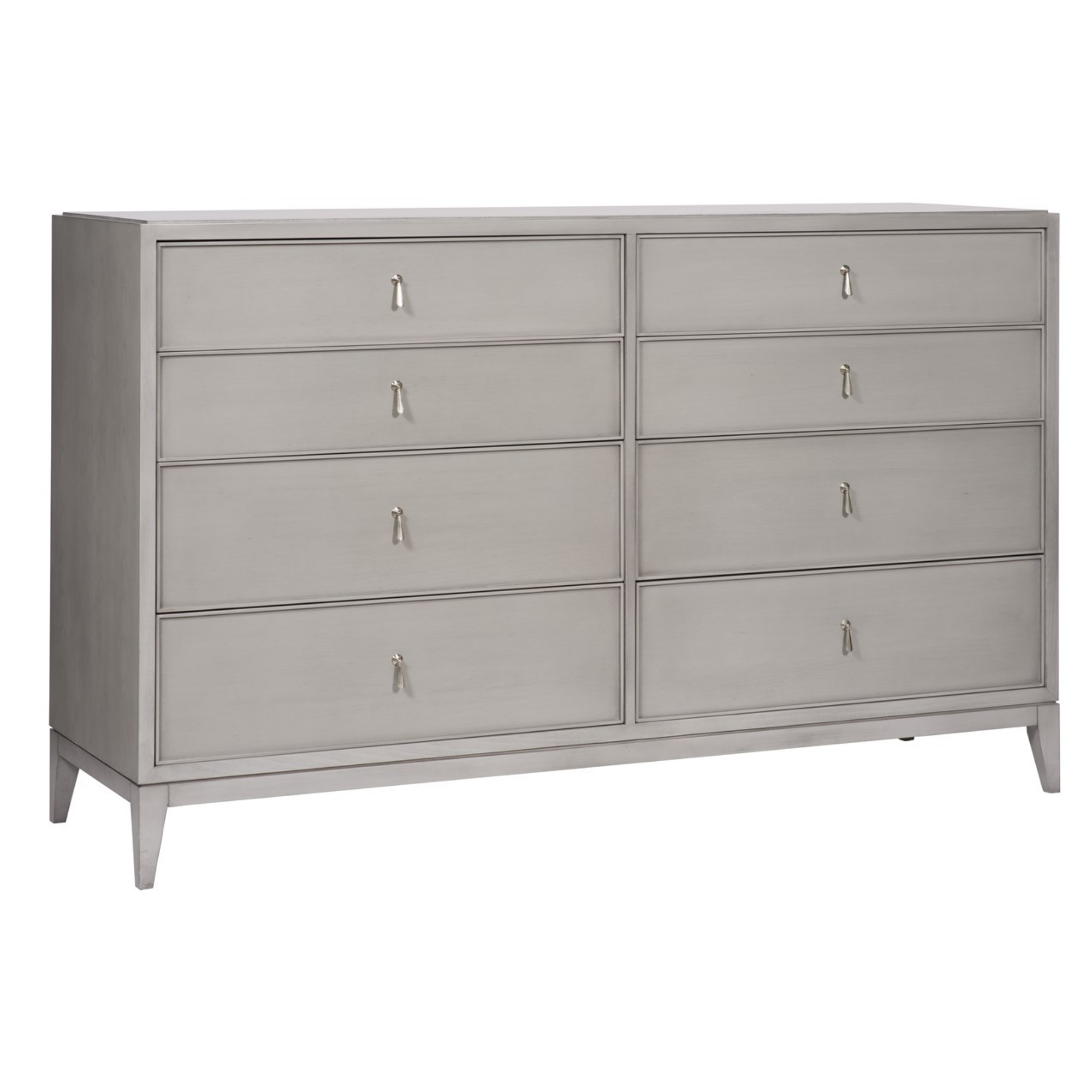 Finish Options Available. As Shown in: Finish – Dove Gray. Tapered Legs, Clean Face, Deco Pendents in Brushed Nickel/One Centered on Each Drawer.