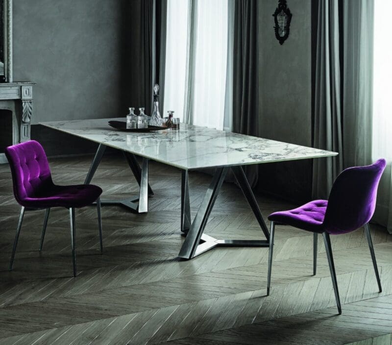 Metal base with top in either veneer wood, solid wood, glossy glass, velvet matt anti-scratch lacquered glass SuperMarble or SuperCeramic.