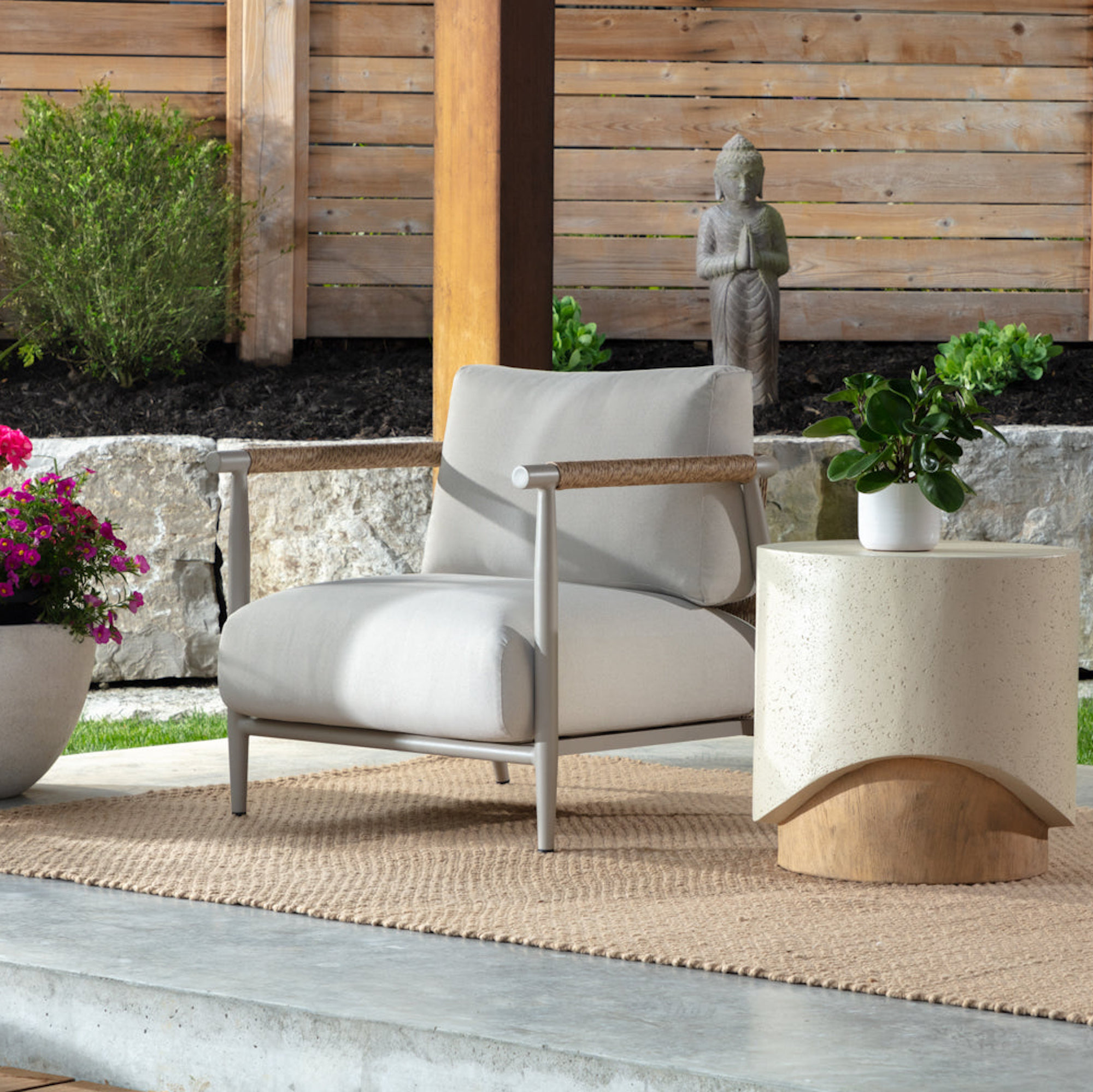 Sleek and thoughtful, the Muros Lounge Chair is an ideal choice for your outdoor space. An all-weather greige aluminum frame showcases a beautiful faux rattan waterfall back design with clean lines and luxurious cushions covered in palazzo cream fabric.