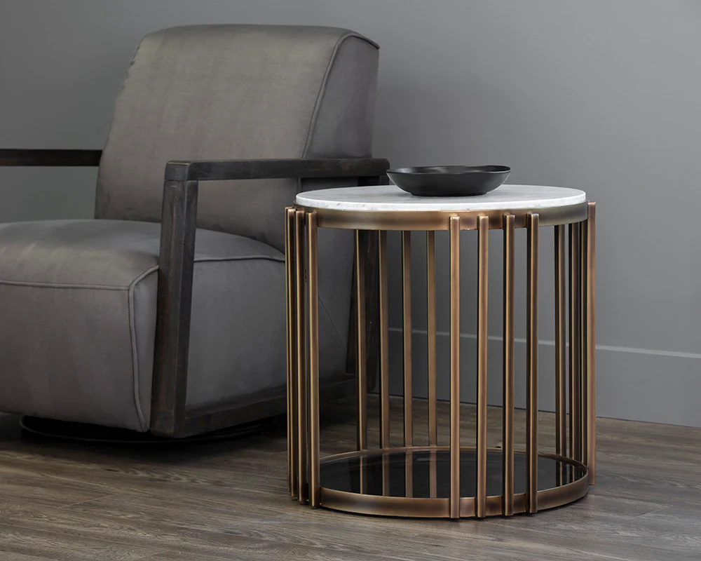 Introduce an element of grandeur to any space with this marvelous end table. Features a 21mm solid Carrara white marble top with a 6mm smoked tempered glass bottom. Completed with a stylish powder-coated metal frame in a rustic bronze finish. Coordinating coffee and console tables also available. As marble is a natural material, unique veining, pitting, fissures, micro-cracks and colour variations are all characteristics that add to the uniqueness and beauty of each piece.