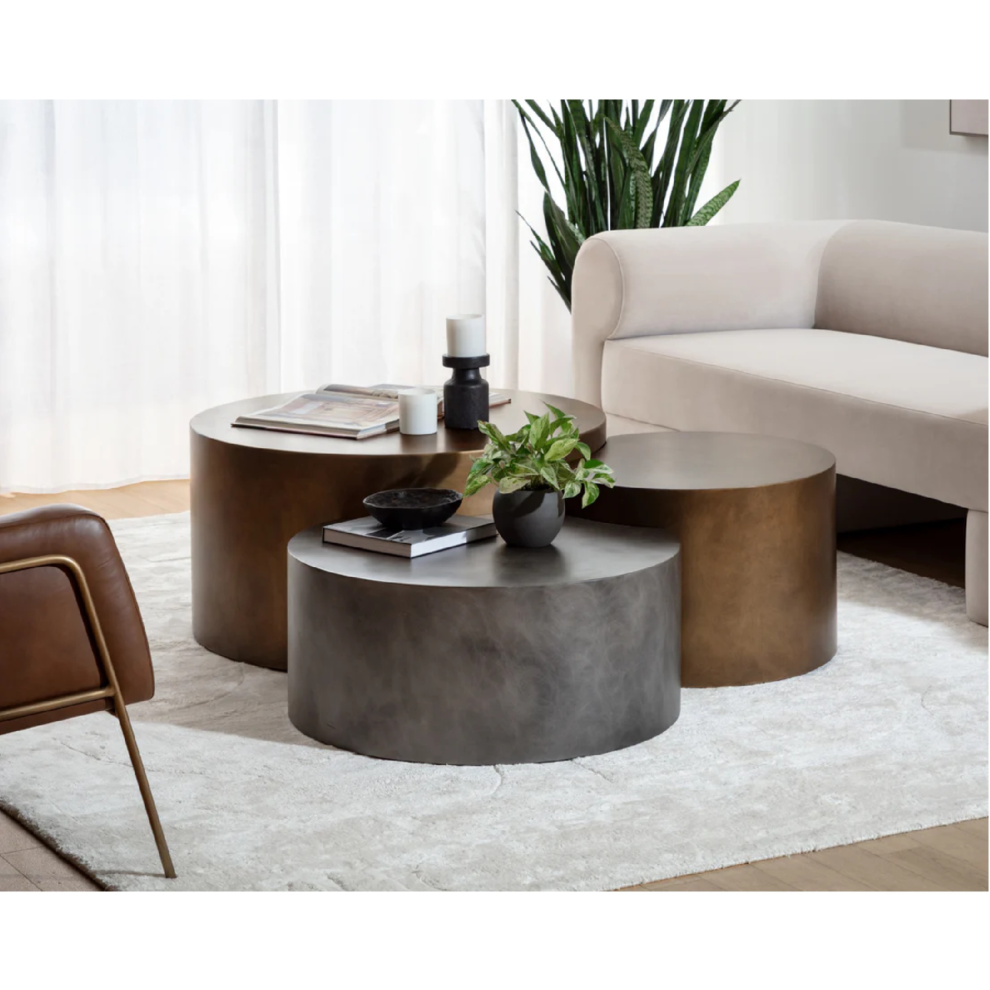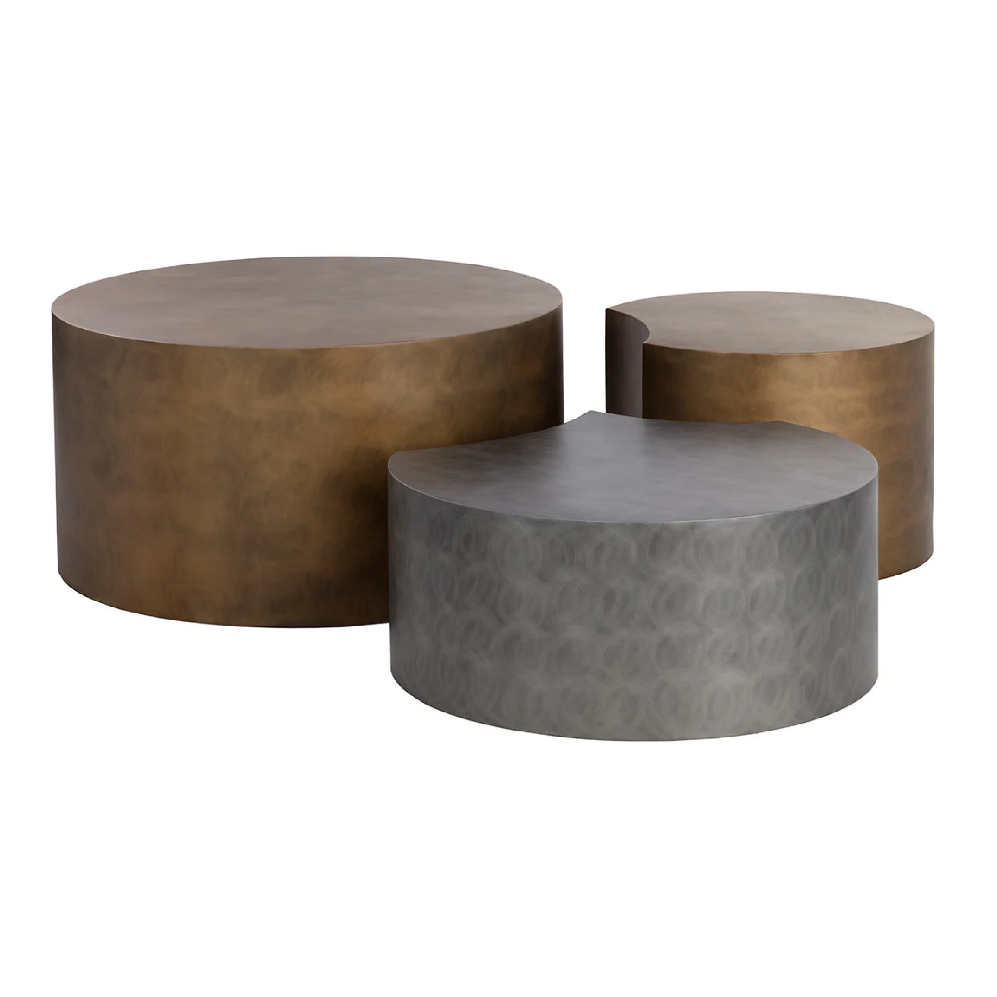 Add ultra contemporary appeal to various spaces with the stunning Neo Coffee Tables. Comprised of three metal pieces designed to fit together at staggered heights and in varying antique brass and nickel finishes. Each table top has a handmade swirl pattern that is unique to each piece and will vary. Function and dimension at its finest. All three pieces sold as a set Made in India. With refined craftsmanship, this design was brought to life by skilled local artisans. Due to the nature of handcraftsmanship, unique imperfections such as fissures, markings and variations in colour and shape are welcomed and appreciated characteristics for a truly one-of-a-kind piece.
