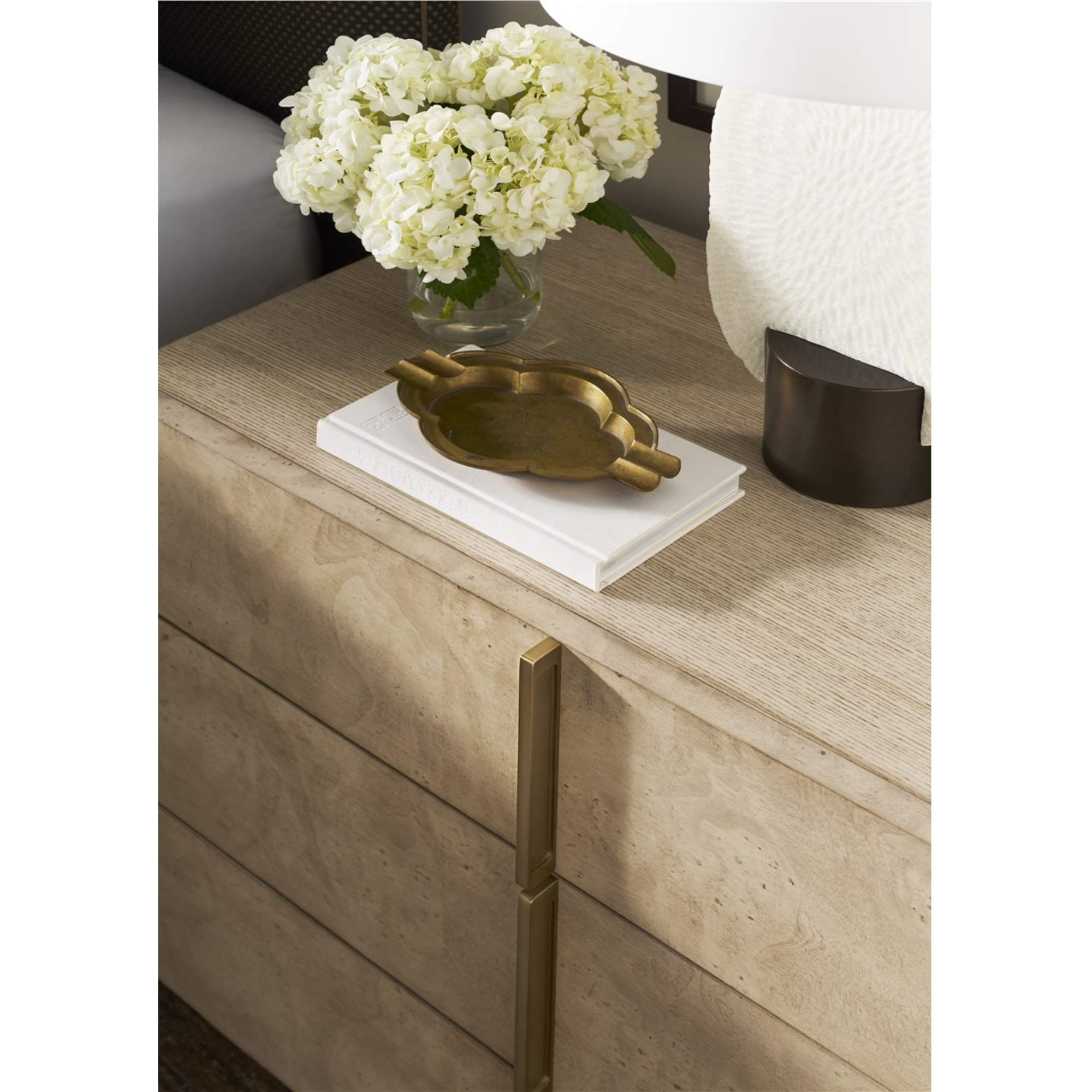 An elegant companion to a statement bed, the Nova Nightstand elevates bedside storage. Its stunning Mappa Burl veneer surfaces bring modern organic style to a room’s aesthetic while elegant linear handles in warm Satin Brass add a touch of refinement. Equally beautiful and functional, this chic nightstand features three drawers for bedside essentials. Choose your favorite finish to personalize this nightstand.