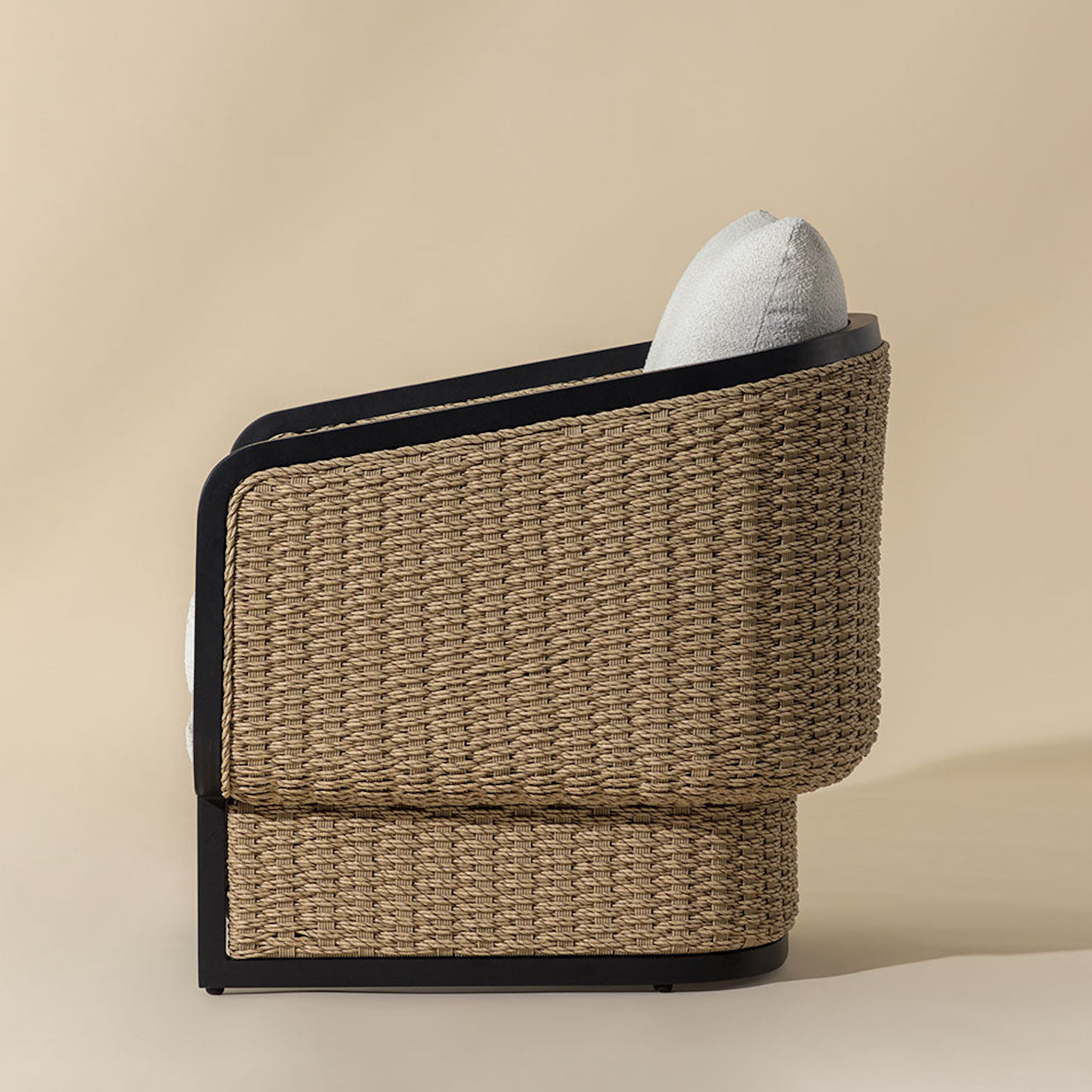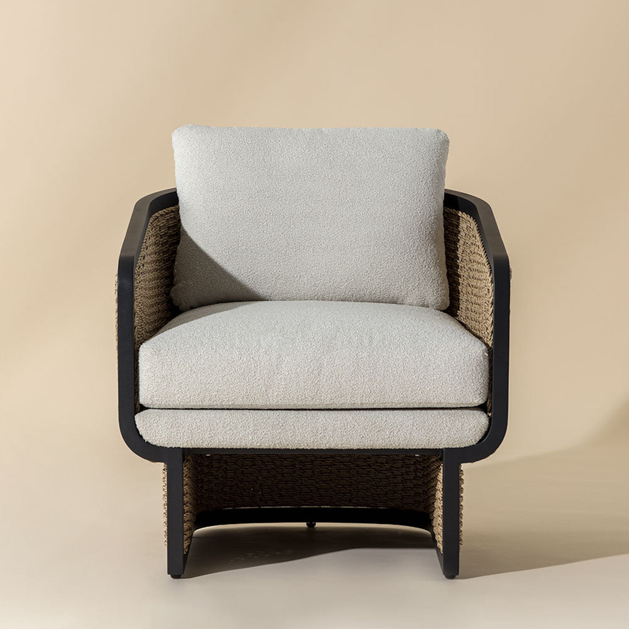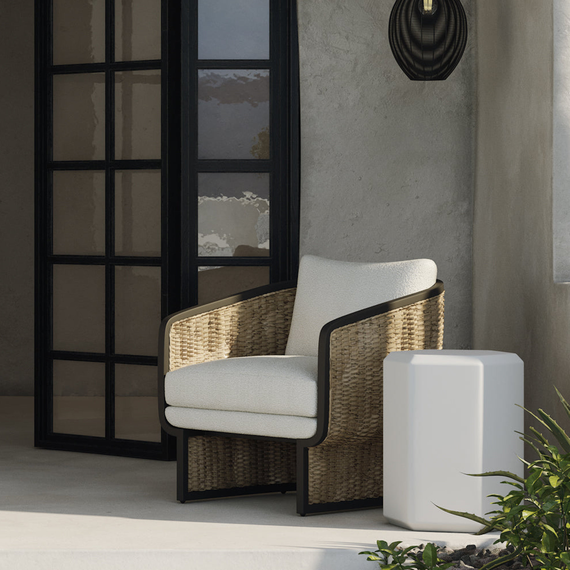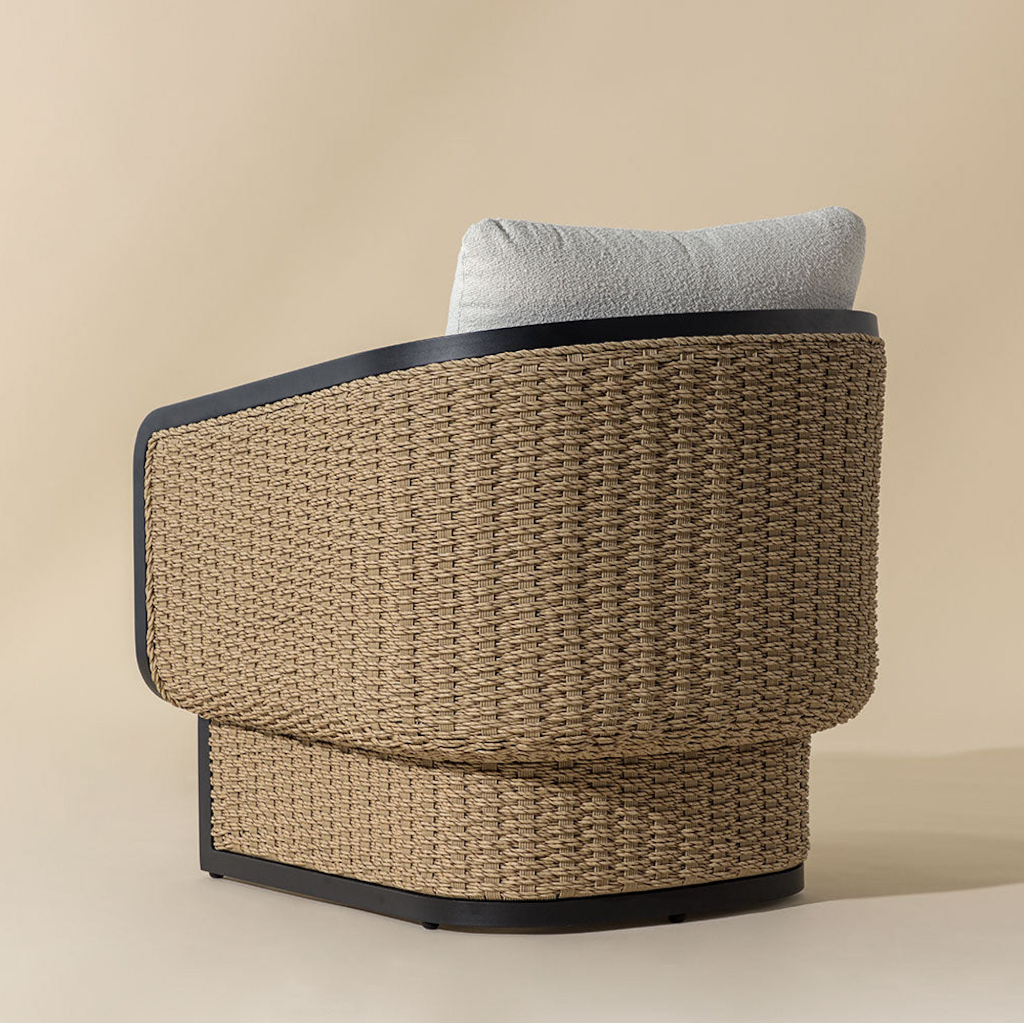 The Olbia Lounge Chair seamlessly blends comfort with durable materials and effortless style. Twisted all-weather wicker intricately weaves across a barrelback aluminum frame, adding textured charm. Foam-filled cushions in cozy boucle fabric enhance the feeling of relaxation.