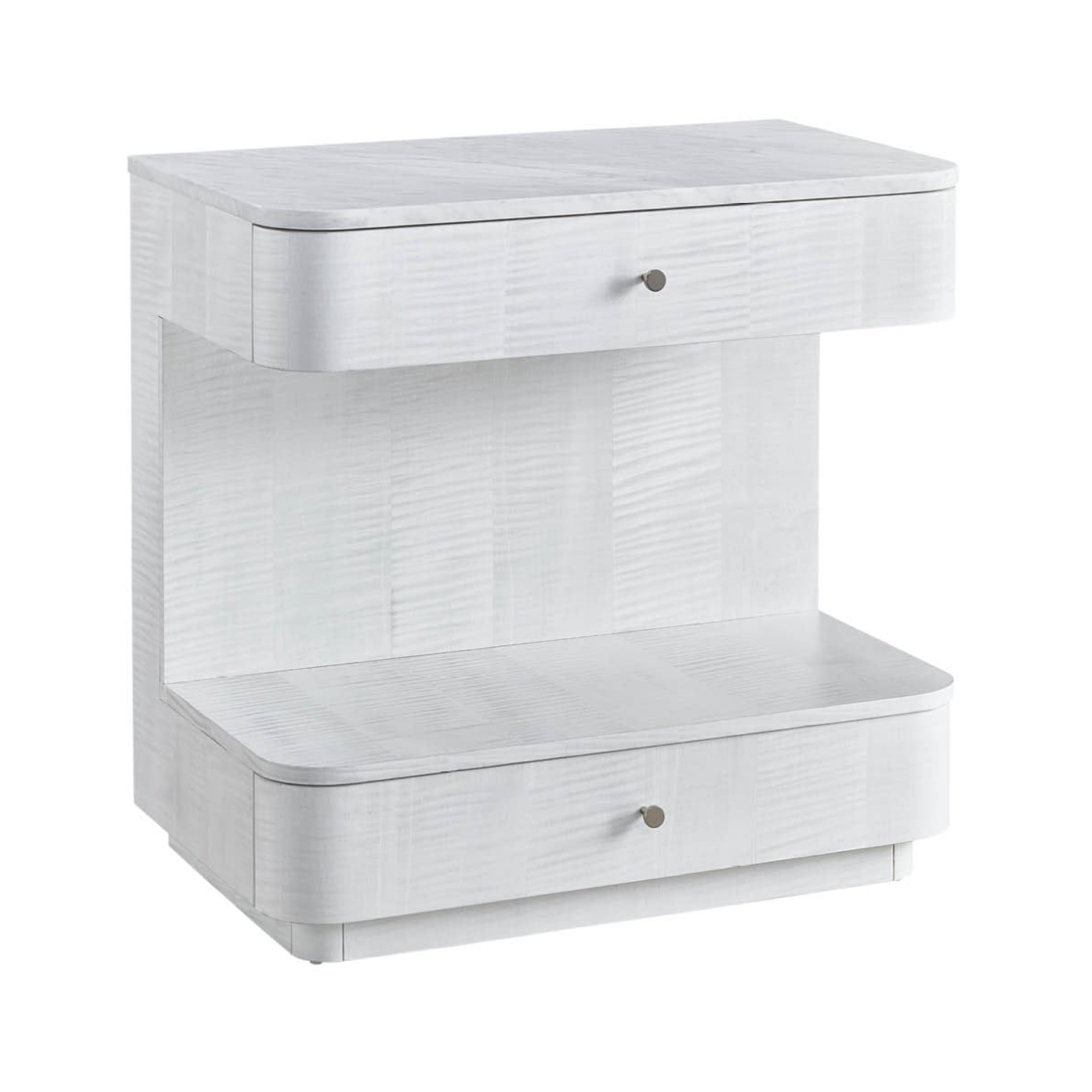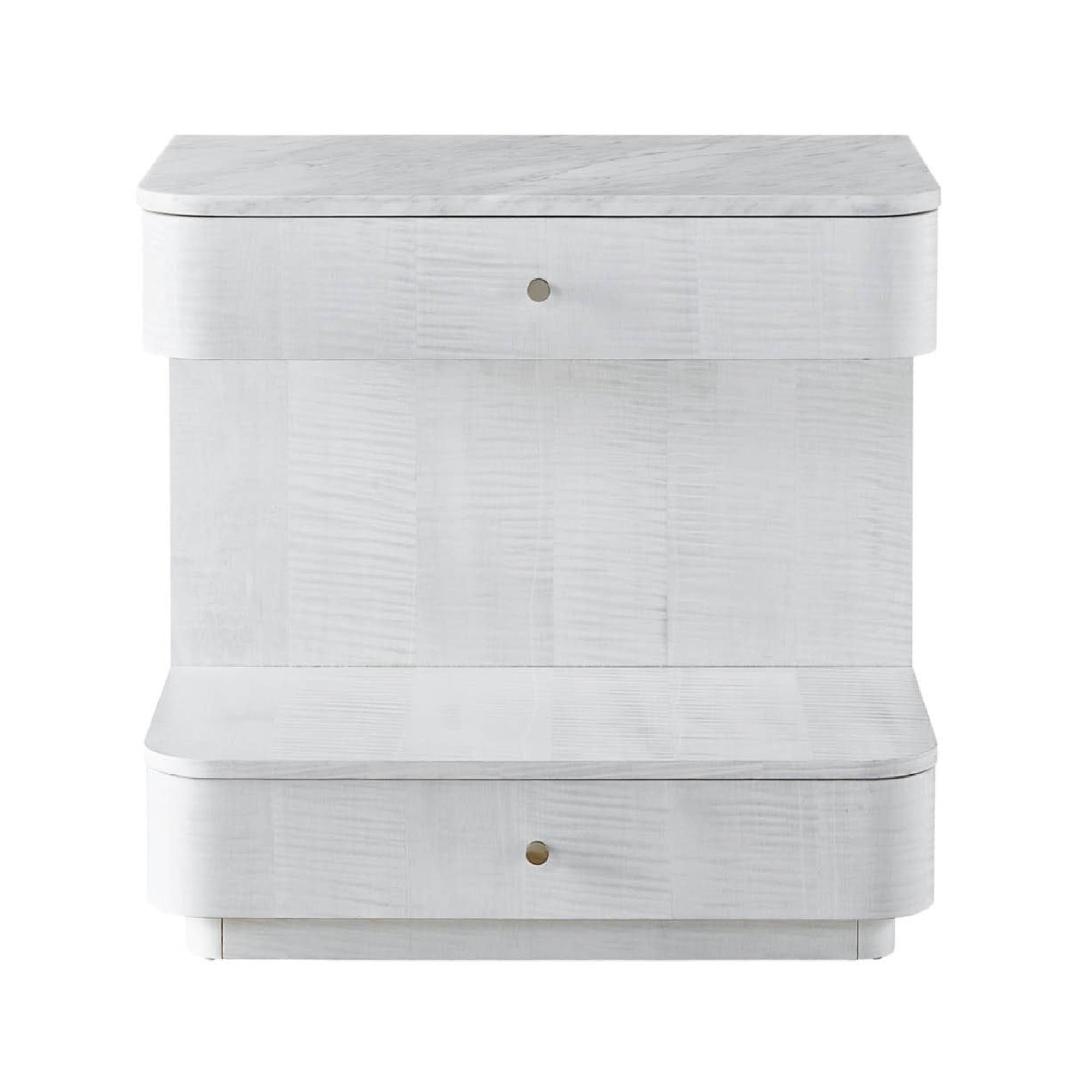 Elevate bedsides with the imaginative Paris Nightstand, a stylish twist on a retro look featuring two drawers, white marble tops and a lavish white sycamore finish.
