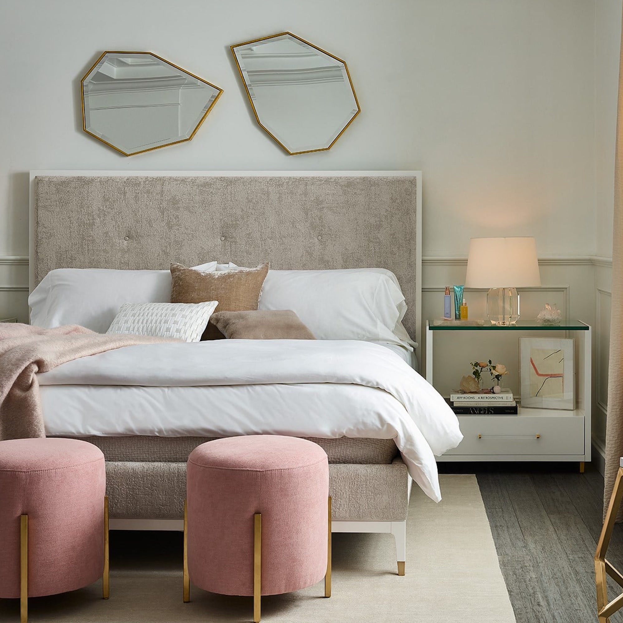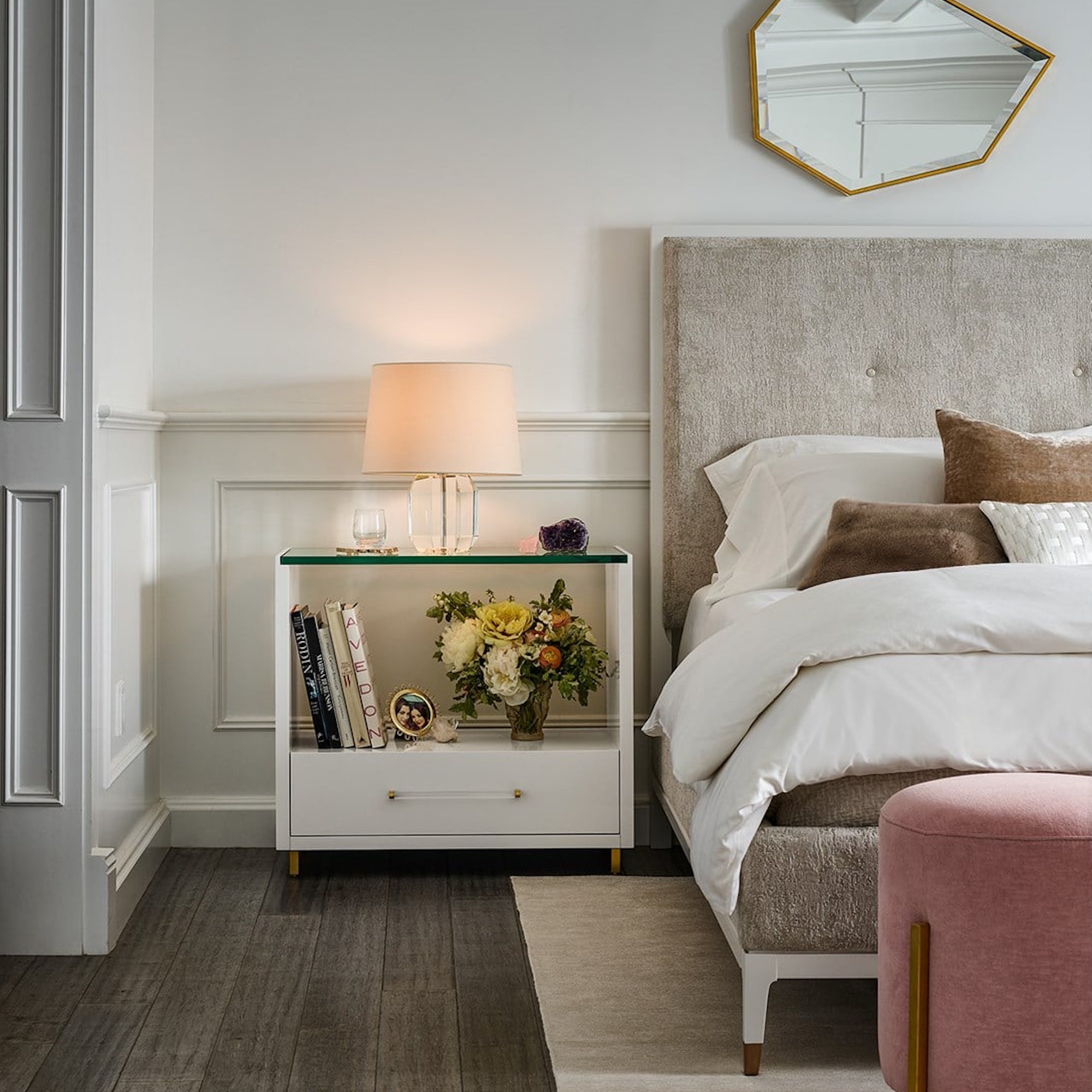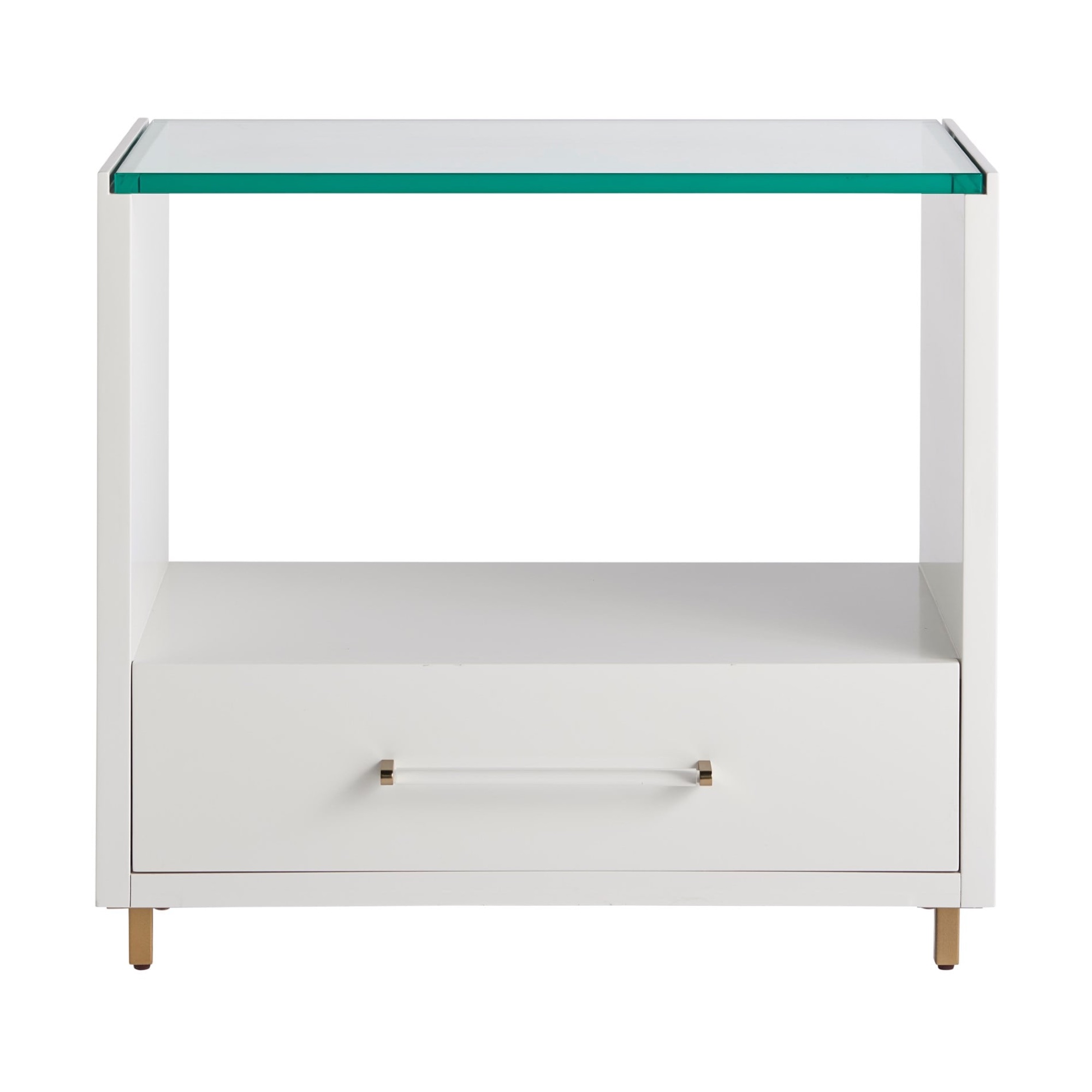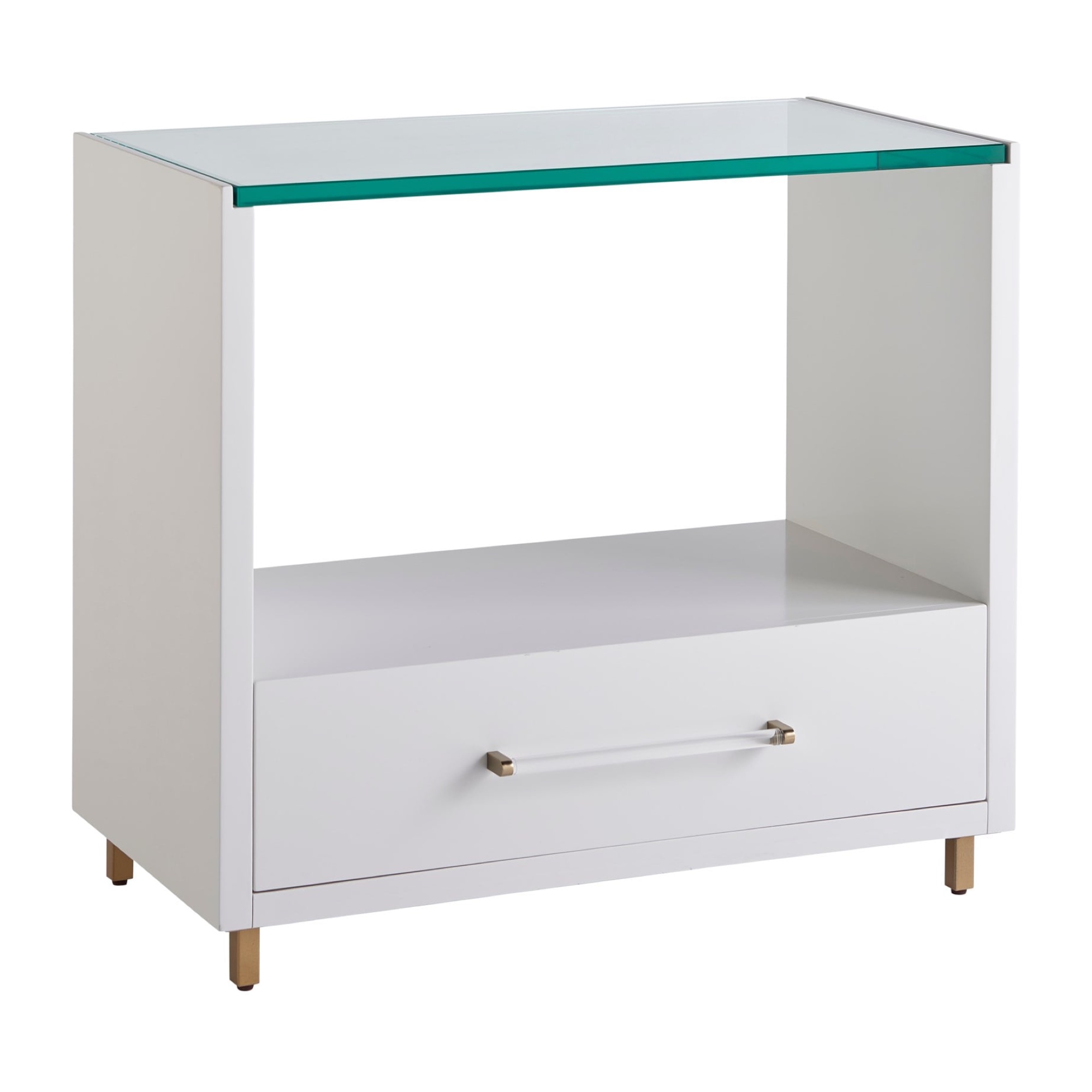 A charming juxtaposition of materials, the Peony Nightstand finds seamless balance between a glass top, champagne and acrylic bar hardware and a chic White Lacquer finish. For added flair, the legs are finished in soft gold.