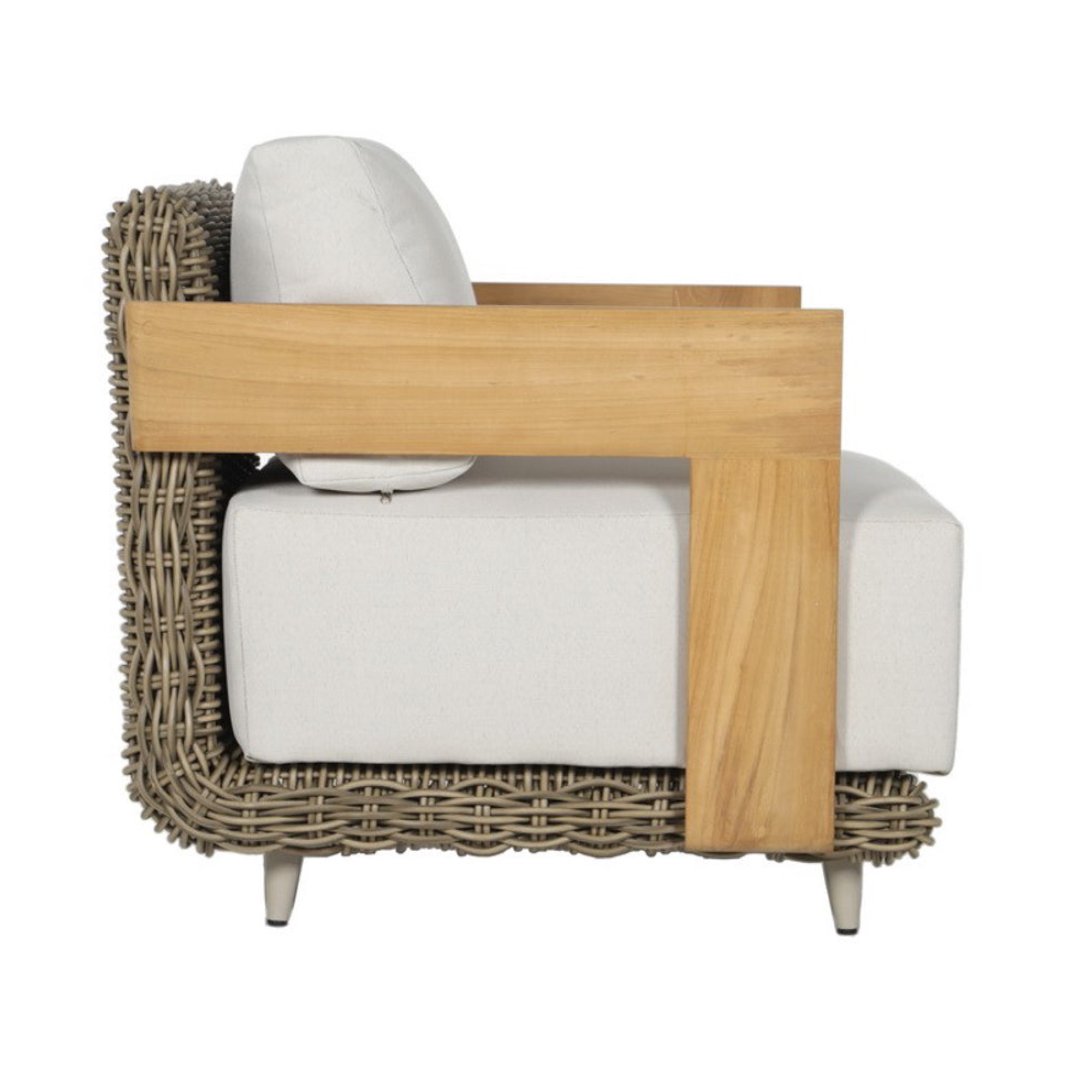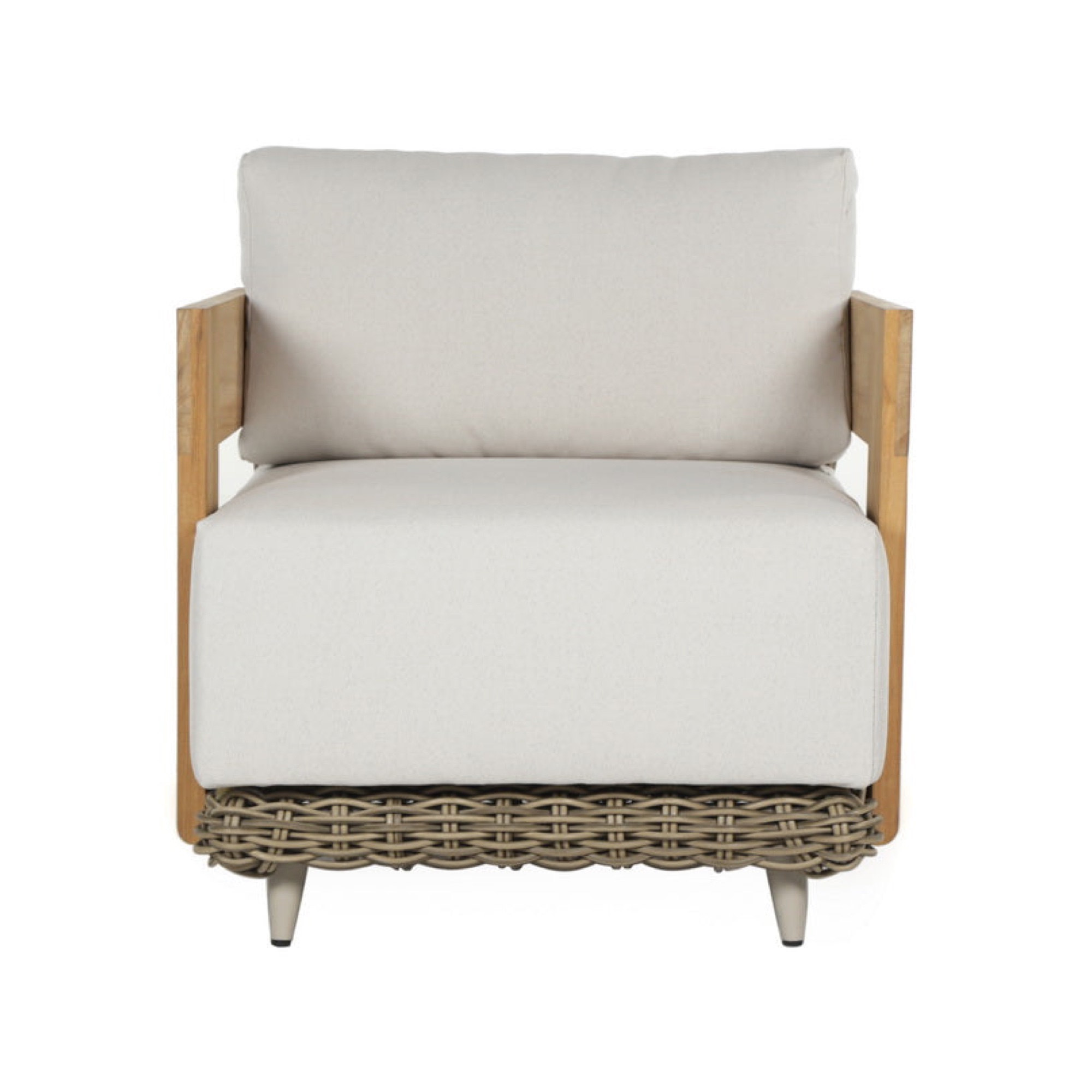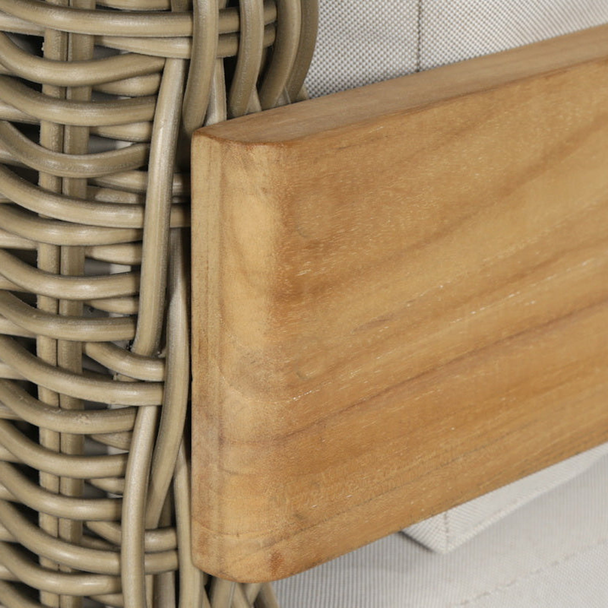 Escape to an outdoor oasis with this beautiful armchair crafted with a unique set of mixed materials. Features deep, thick seat in palazzo cream fabric with sleek, solid teak wood armrests. A taupe wicker exterior complete this intricate design. Suitable for indoor and covered outdoor spaces.