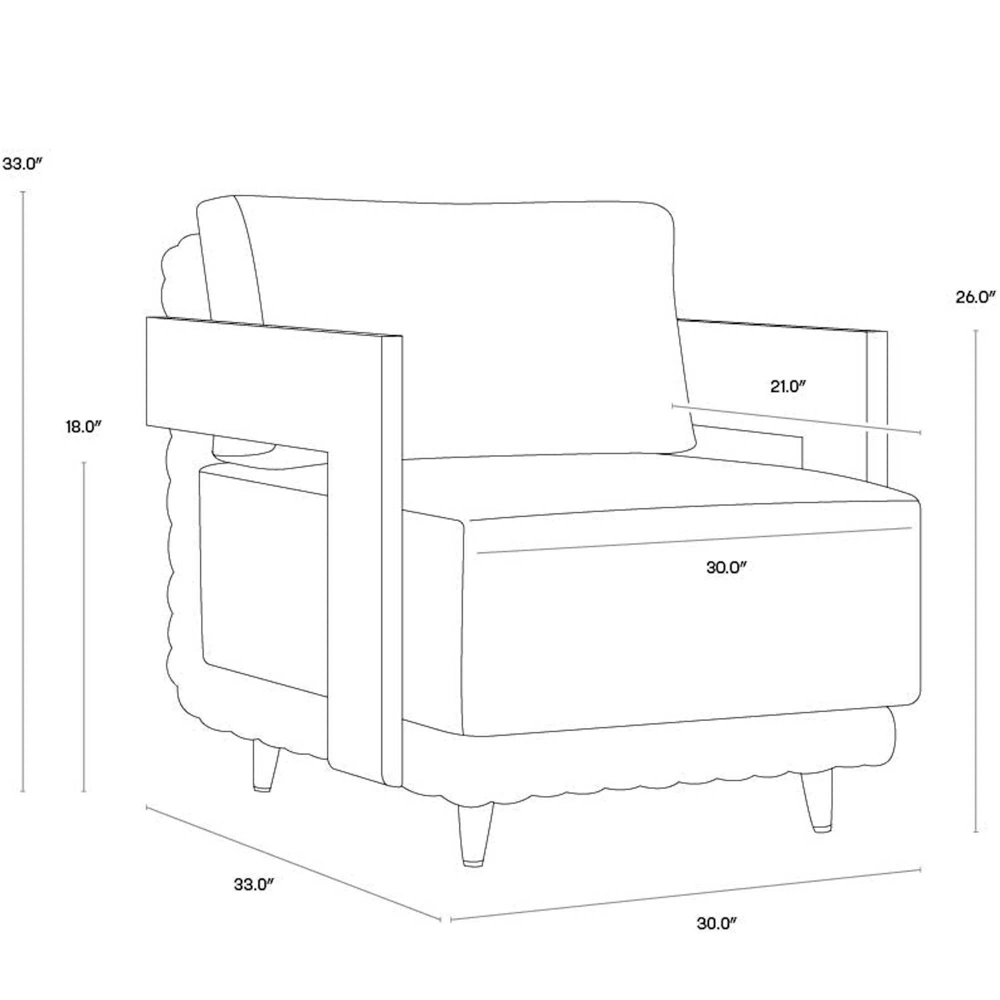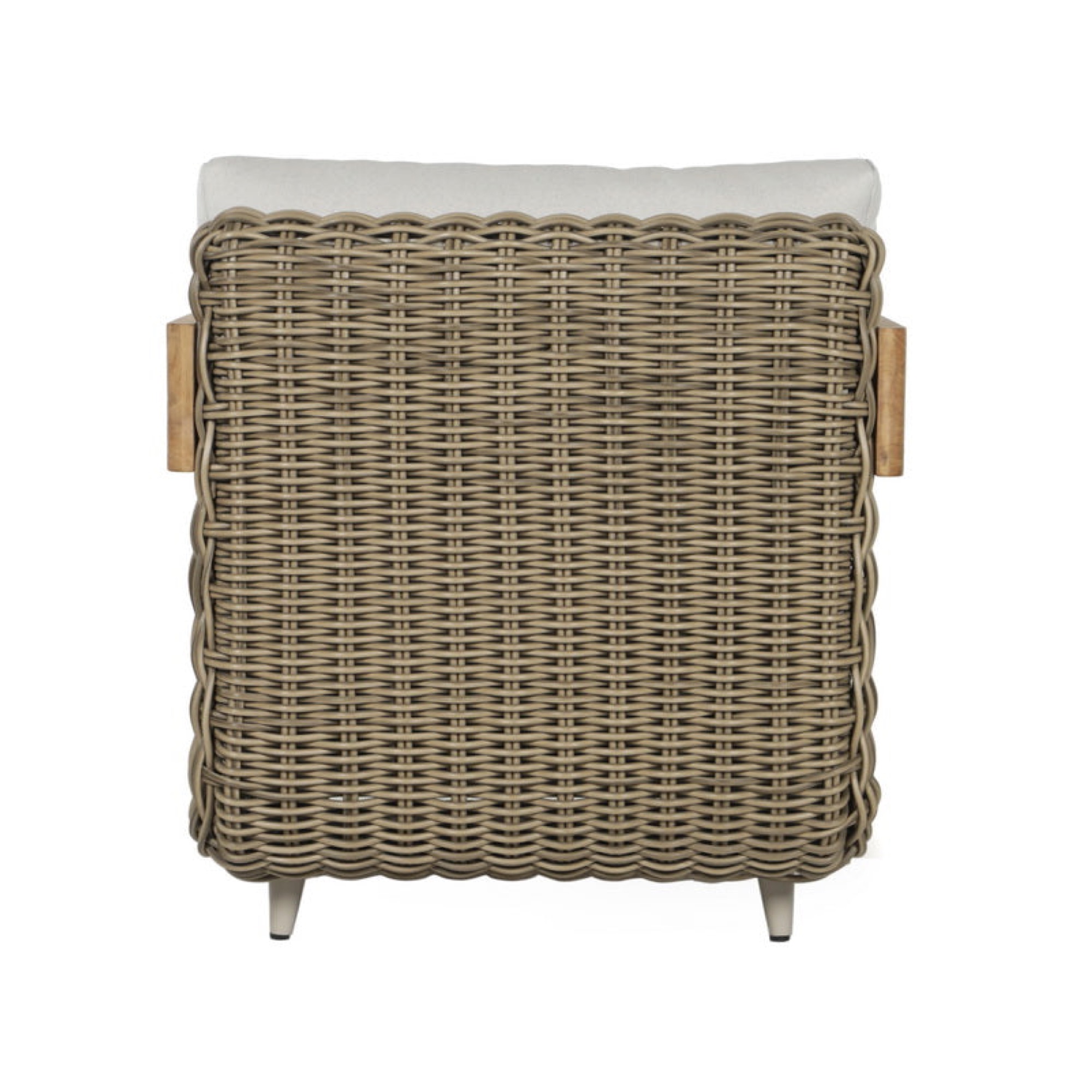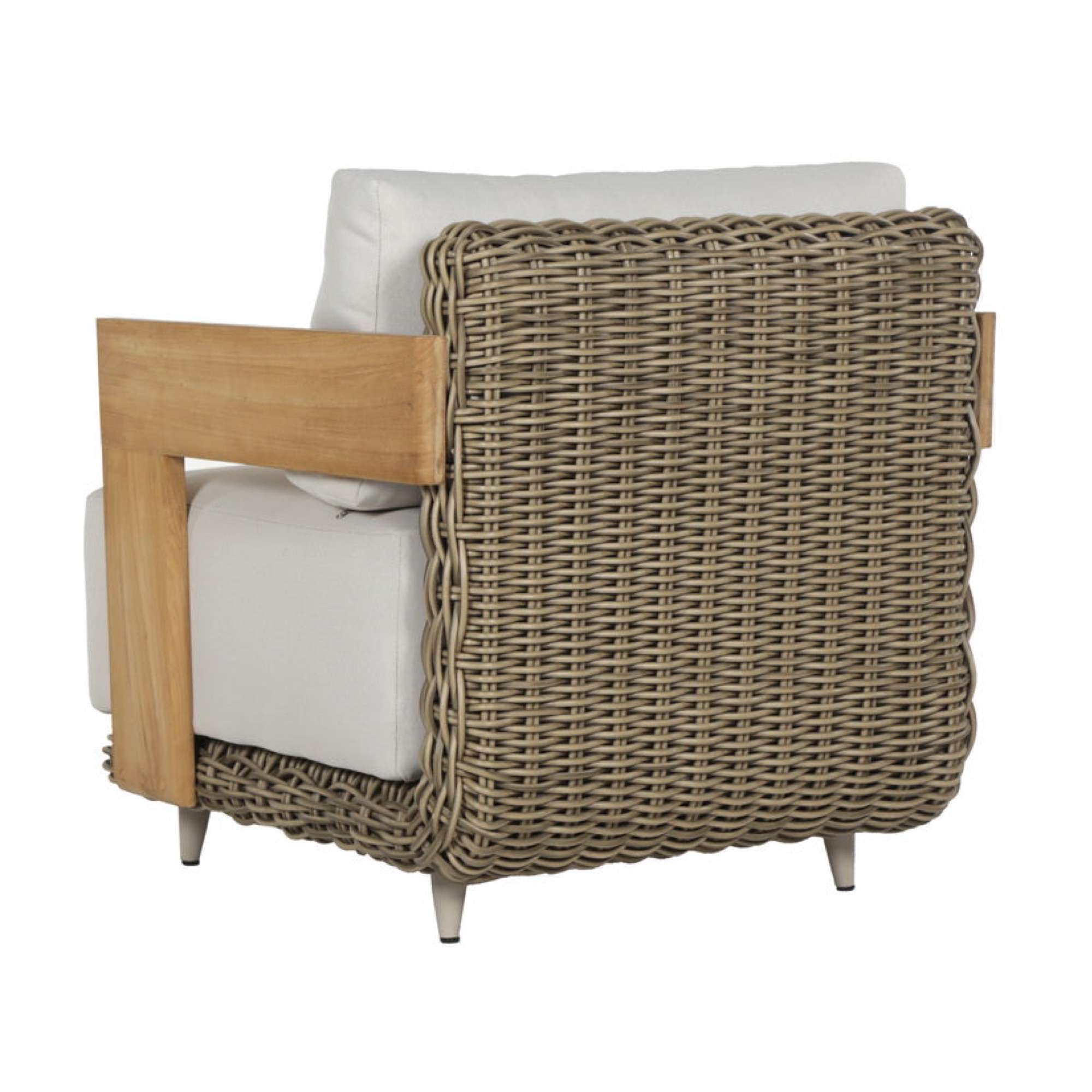 Escape to an outdoor oasis with this beautiful armchair crafted with a unique set of mixed materials. Features deep, thick seat in palazzo cream fabric with sleek, solid teak wood armrests. A taupe wicker exterior complete this intricate design. Suitable for indoor and covered outdoor spaces.