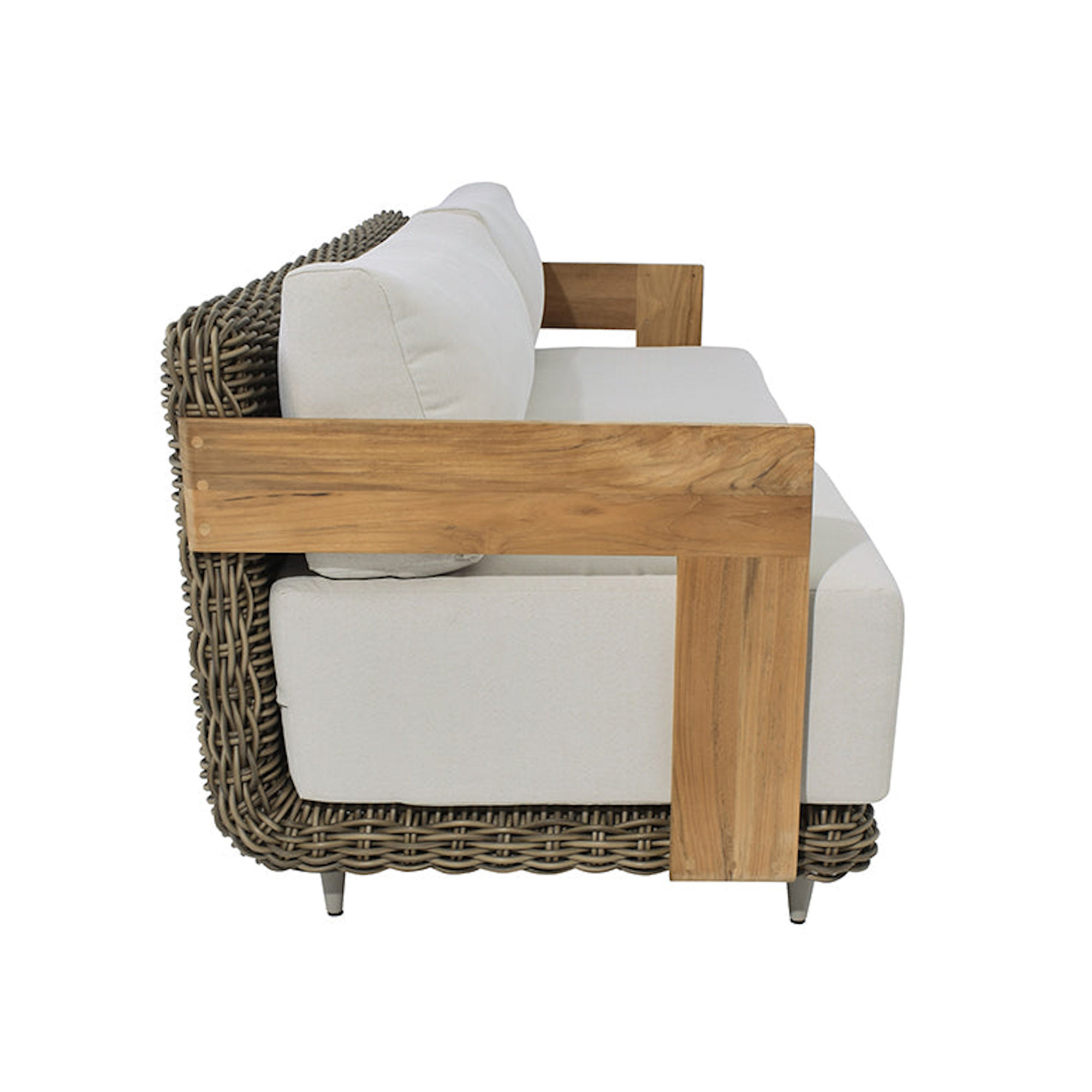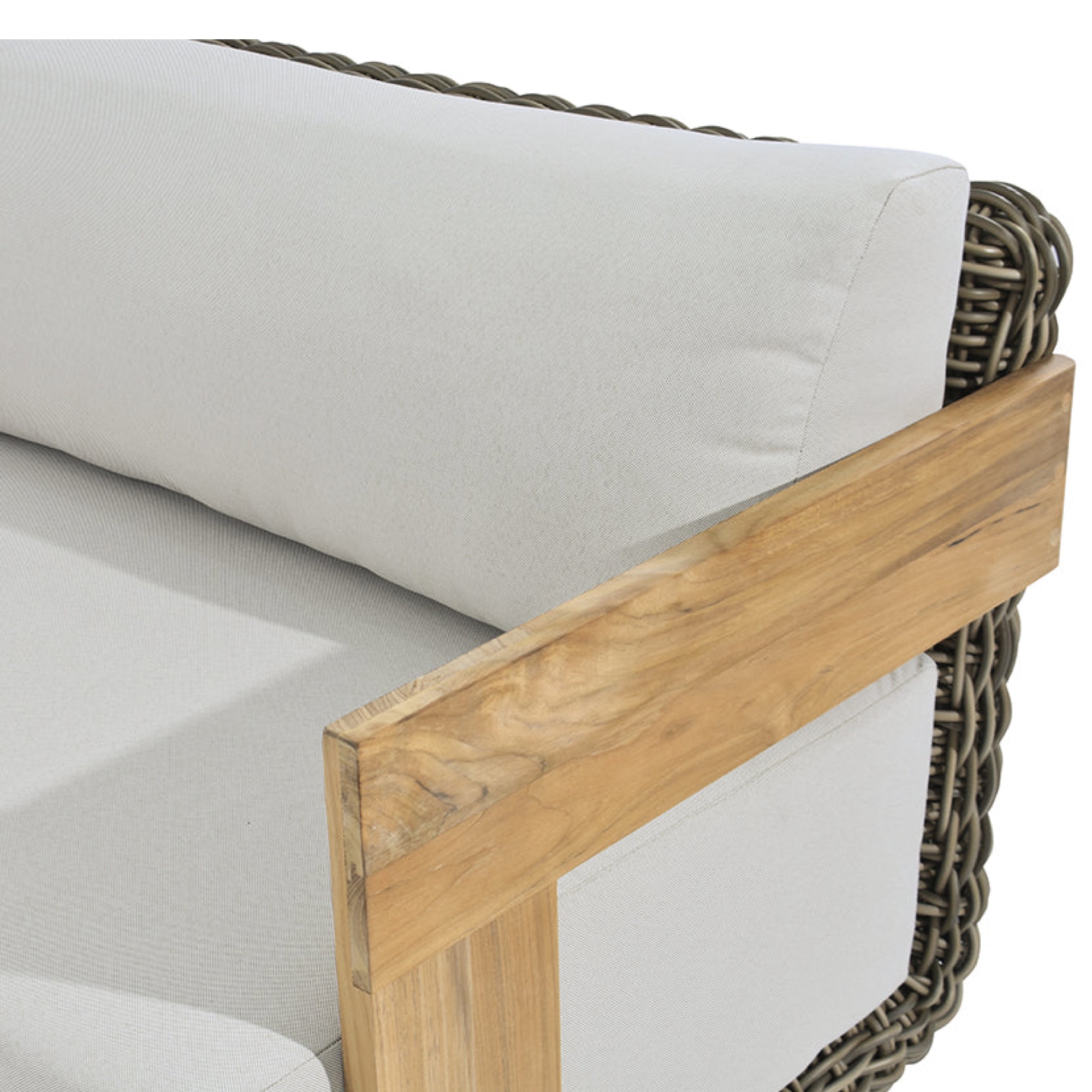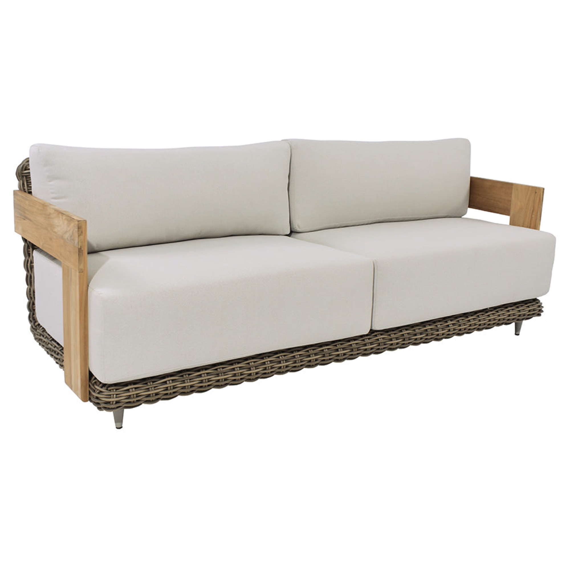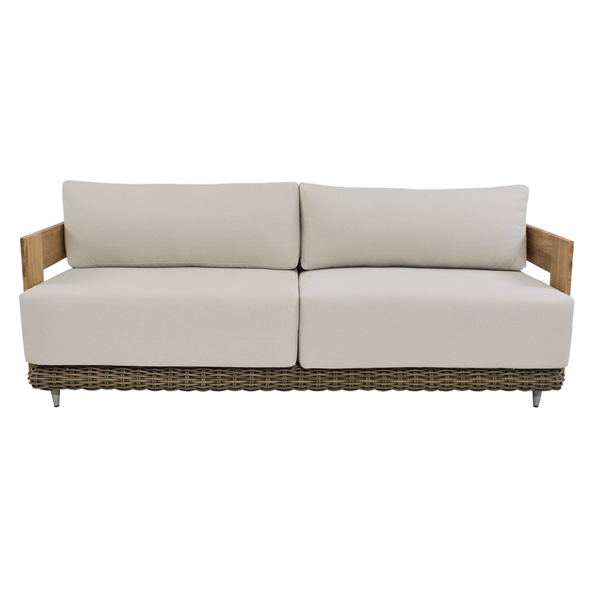 Escape to an outdoor oasis with this beautiful outdoor sofa crafted with a unique set of mixed materials. Features deep, thick seat in palazzo cream fabric with sleek, solid teak wood armrests. A taupe wicker exterior complete this intricate design. Suitable for indoor and covered outdoor spaces.