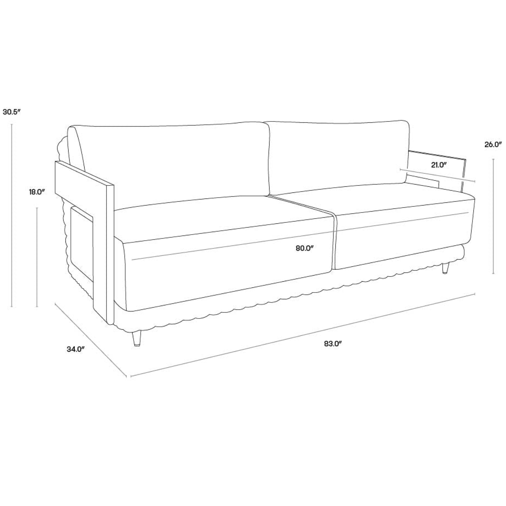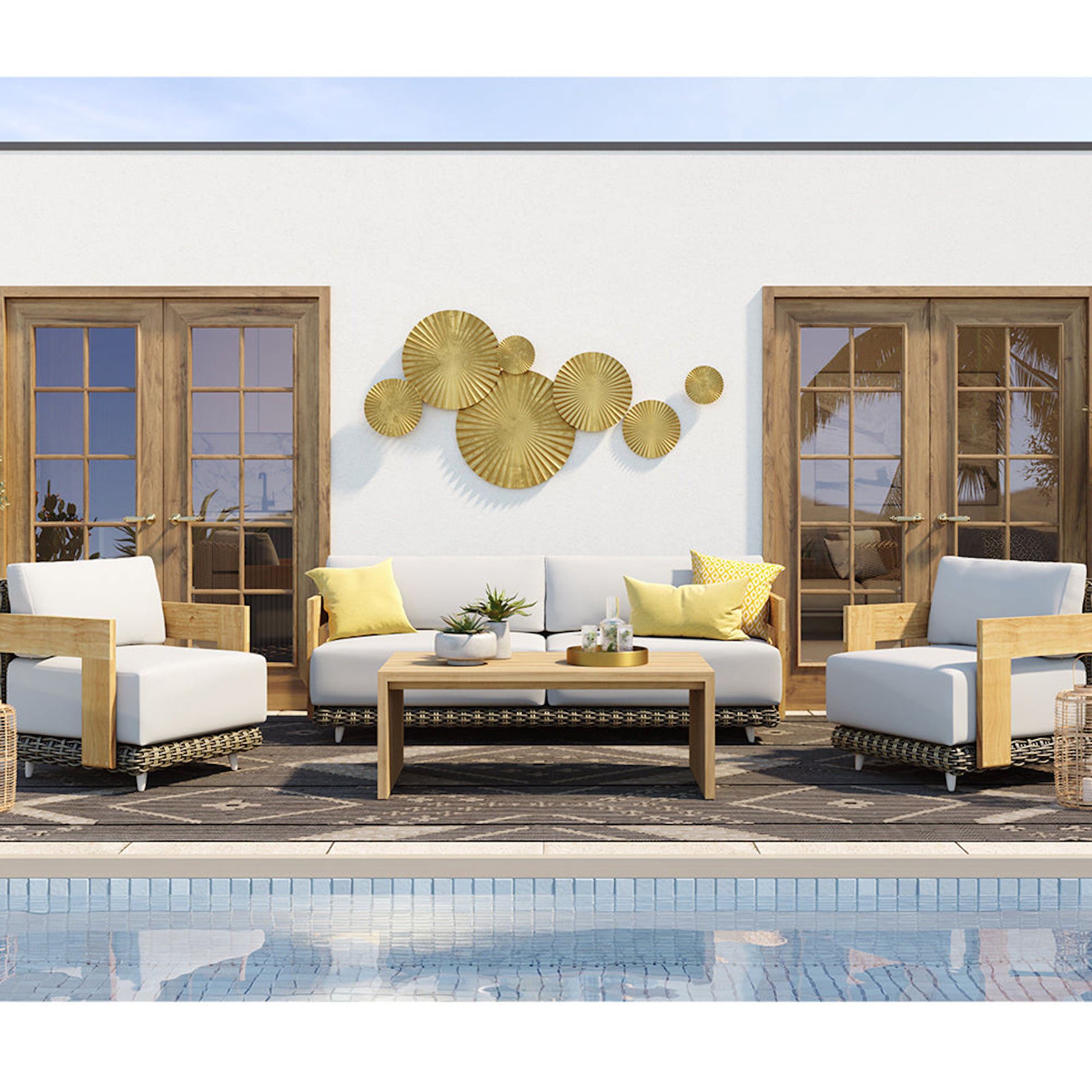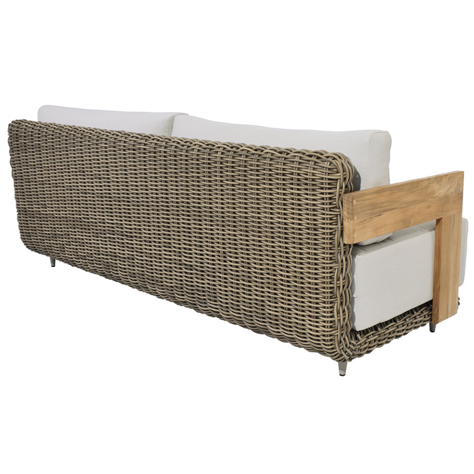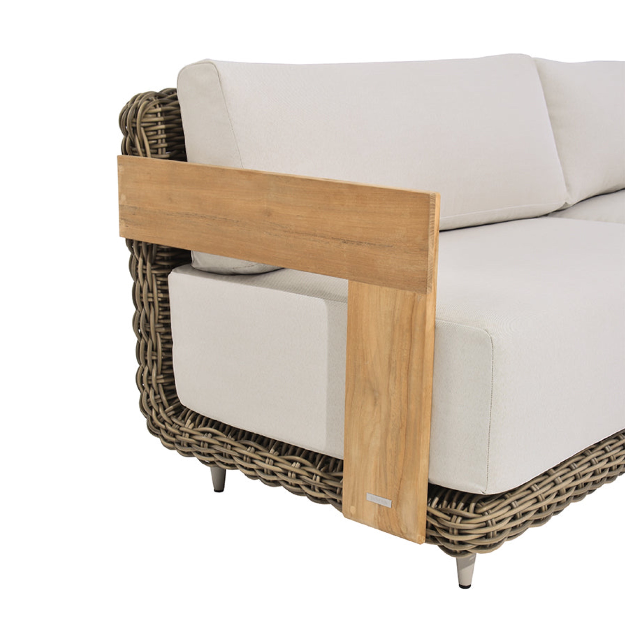 Escape to an outdoor oasis with this beautiful outdoor sofa crafted with a unique set of mixed materials. Features deep, thick seat in palazzo cream fabric with sleek, solid teak wood armrests. A taupe wicker exterior complete this intricate design. Suitable for indoor and covered outdoor spaces.