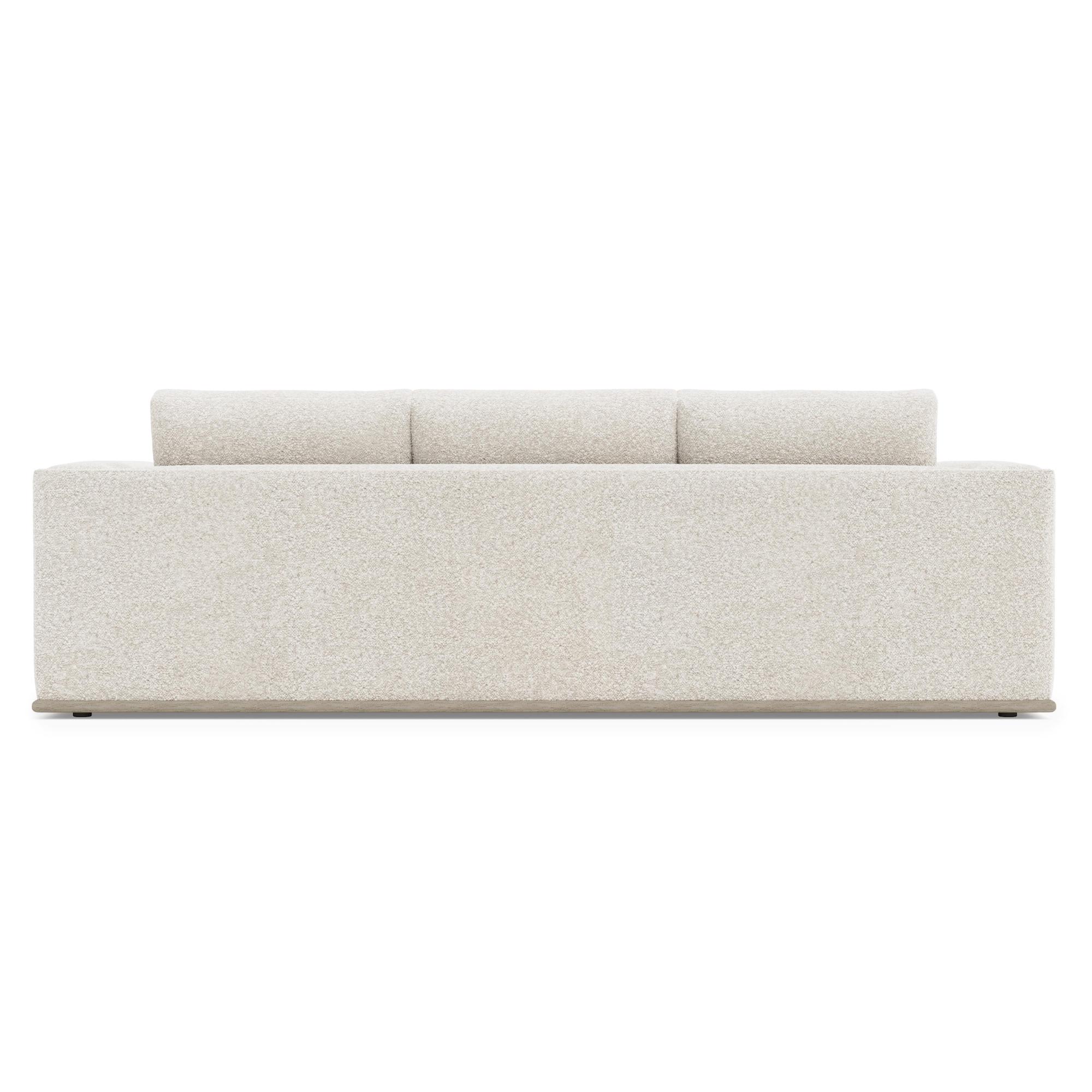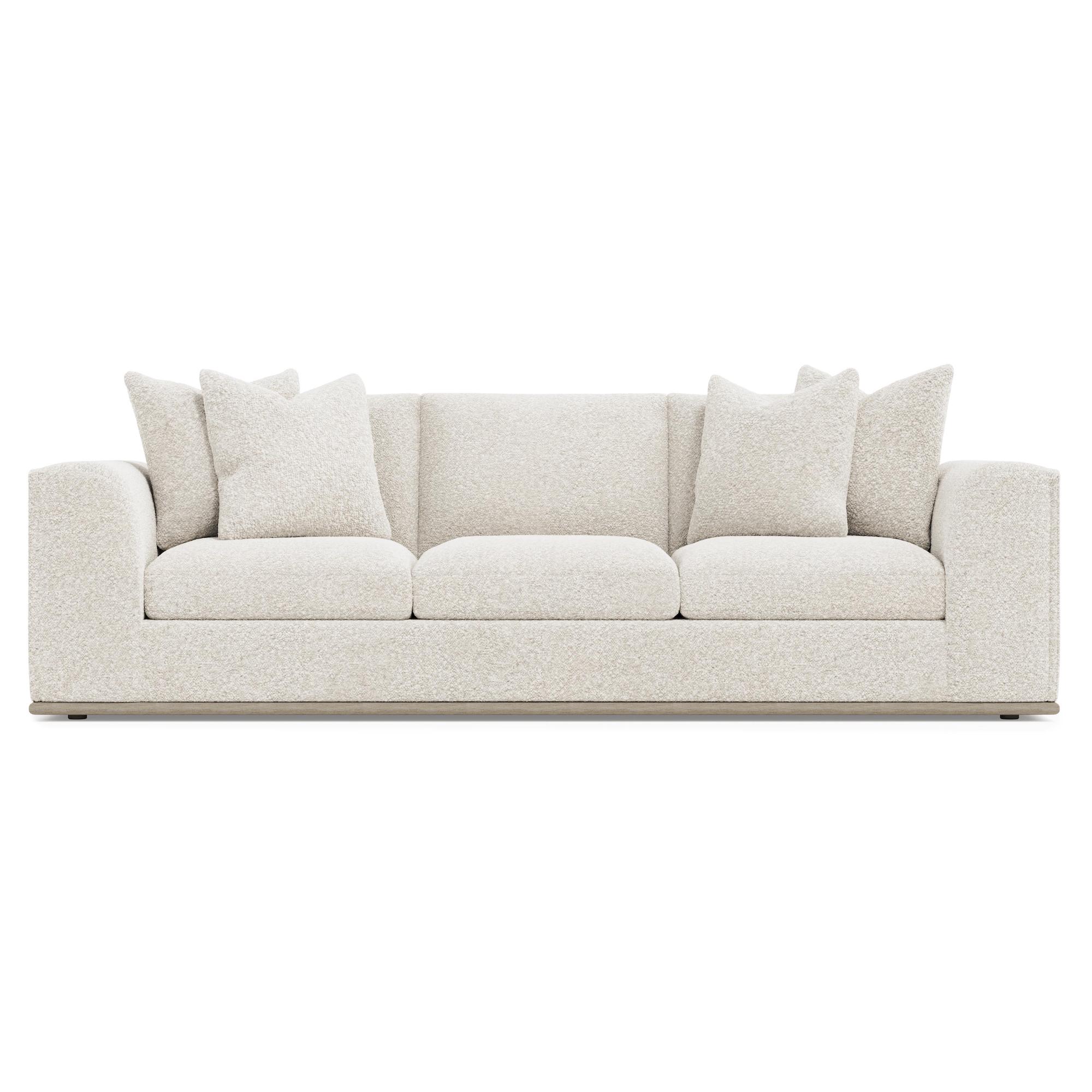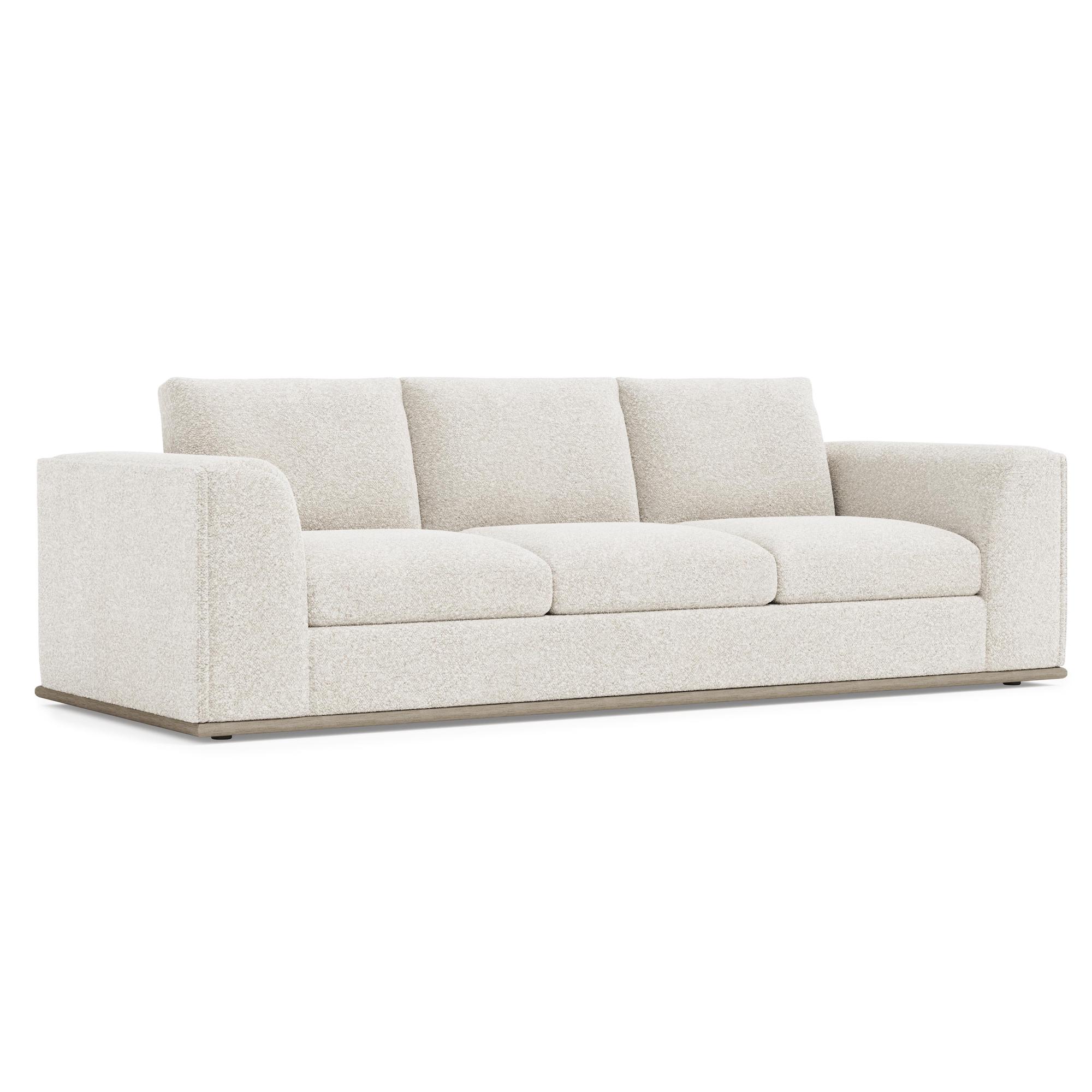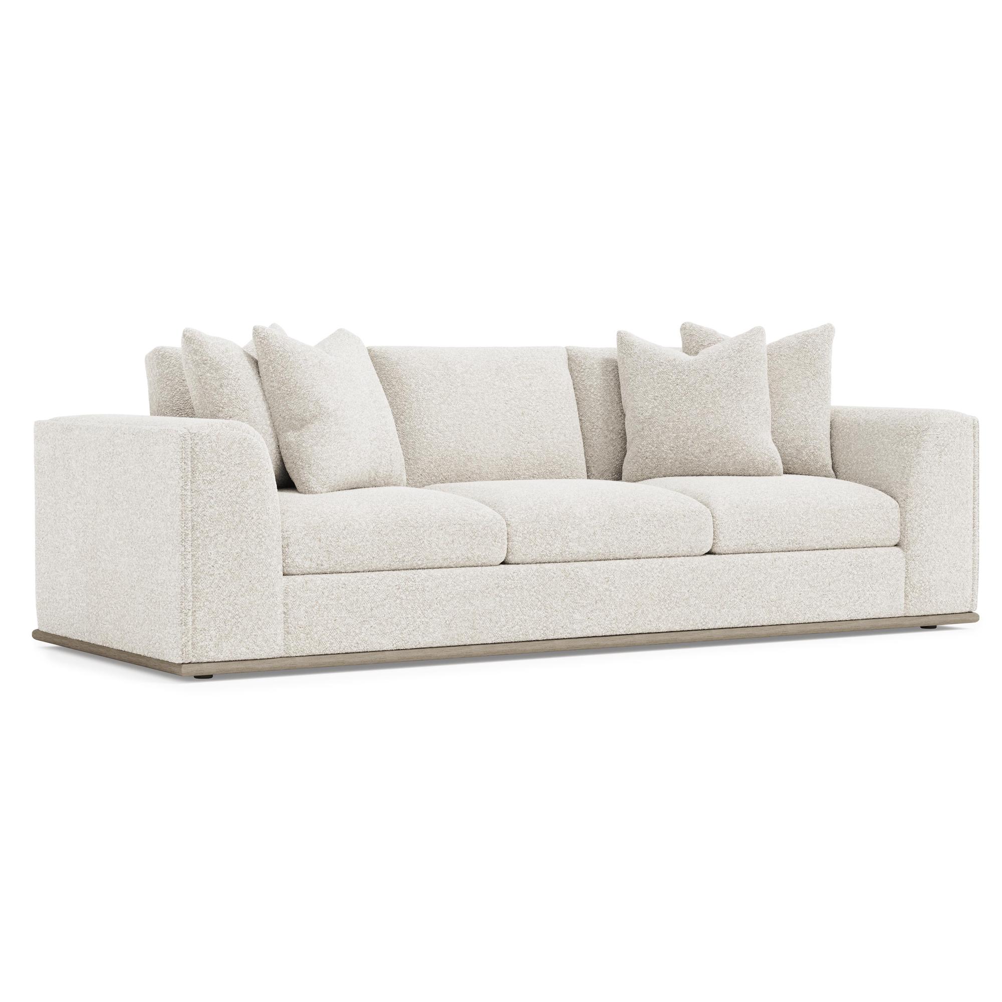 Luxurious and chic, the Prague sofa has a wide, low-profile frame that achieves a grounded, modern look. Sumptuous spring down cushions and fiber back pillows offer enduring comfort. At the base, an exposed wood band draws attention to the clean, linear design of this elegant piece.