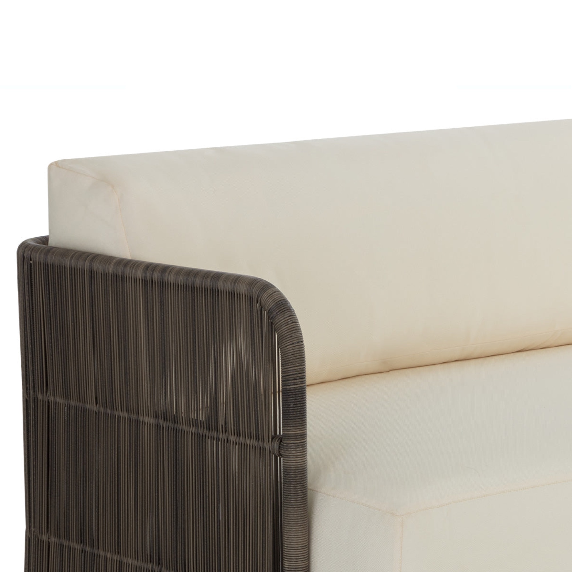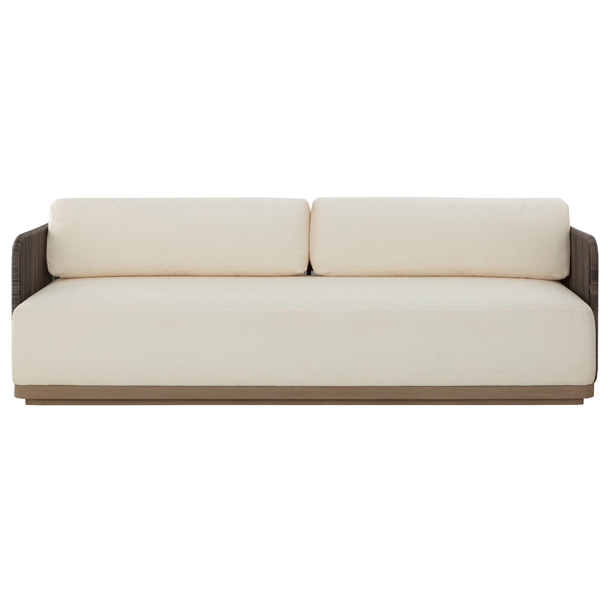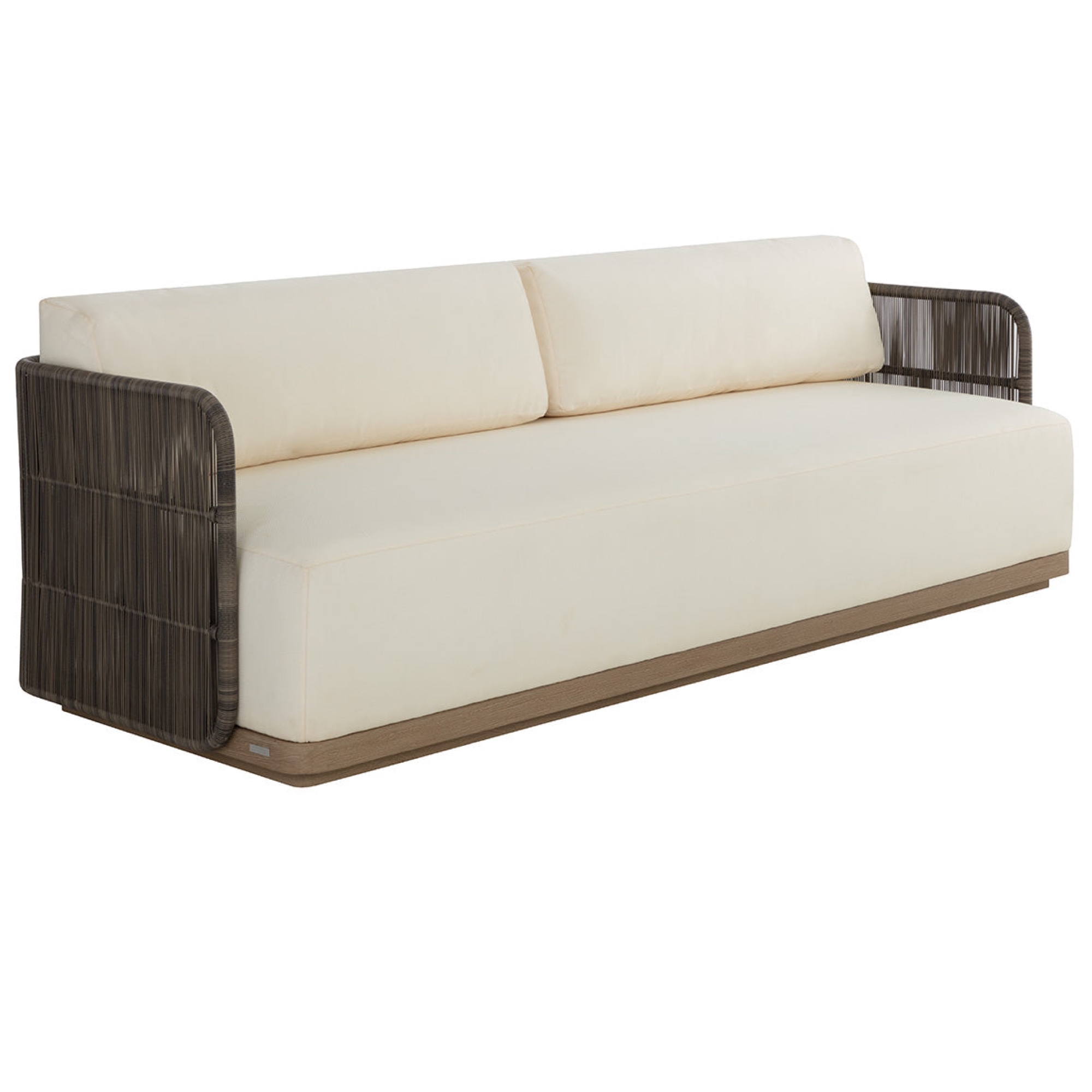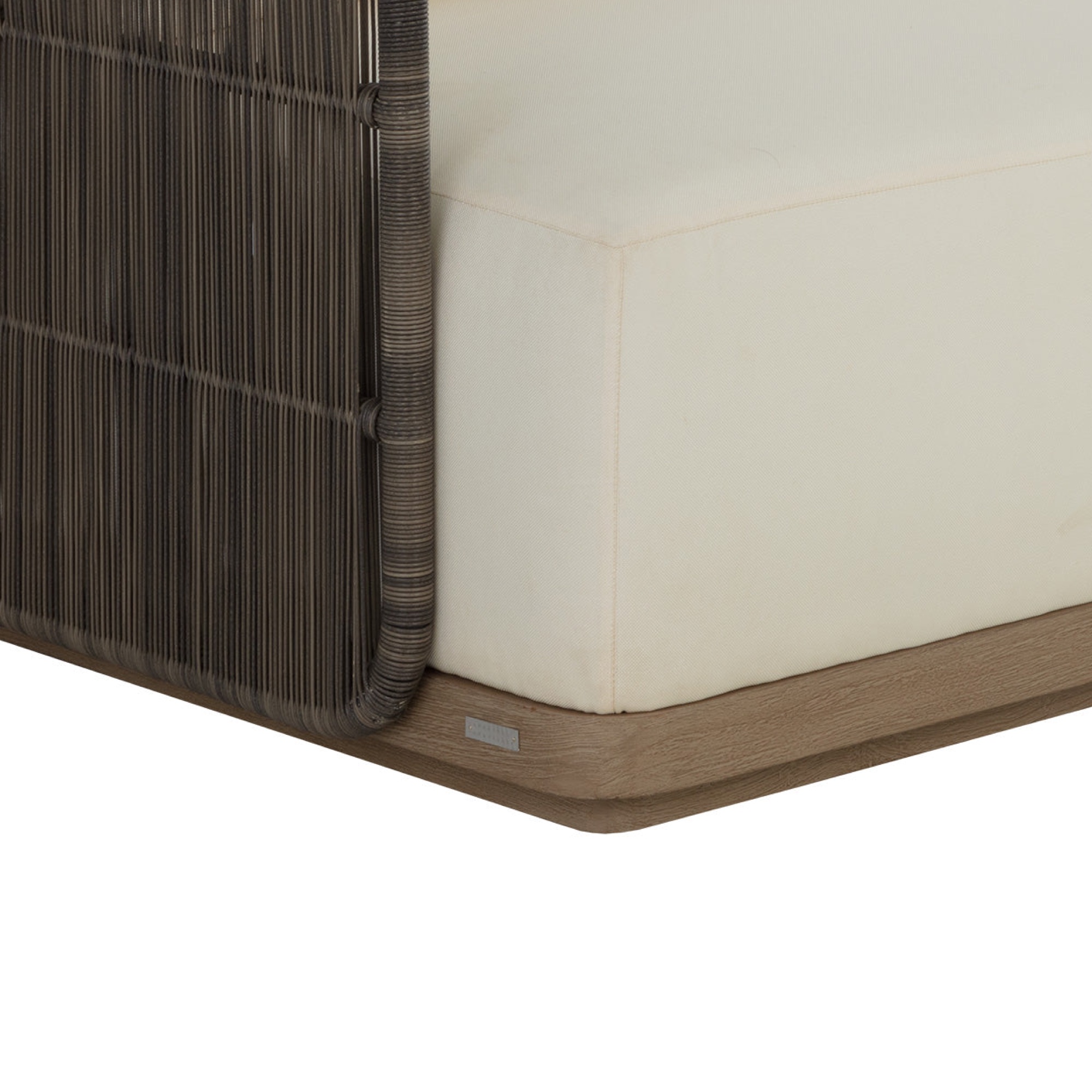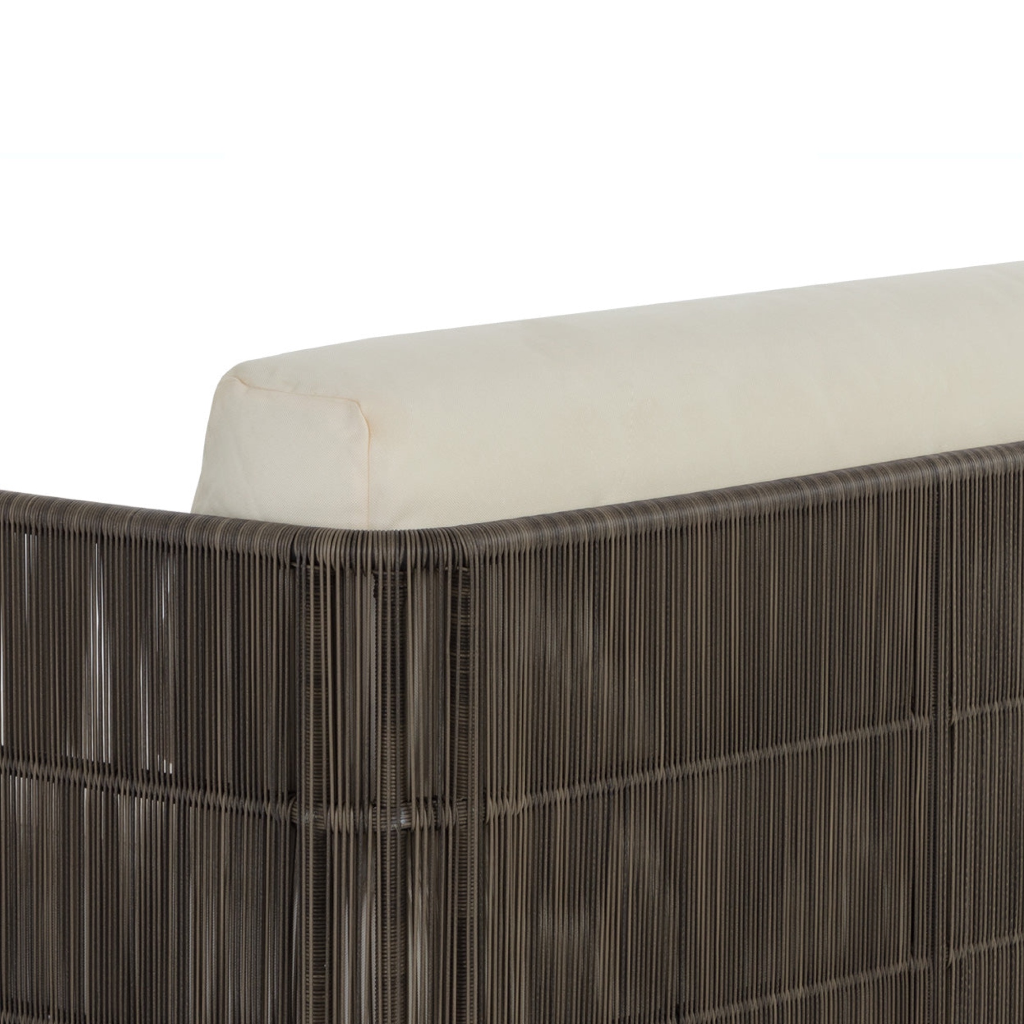 Relax and enjoy the weather with the comfortable Ravenna Sofa. Constructed with a drift brown teak wood base with a linear handwoven design made from ore grey polyrod on a black aluminum frame. Suitable for indoor and covered outdoor spaces.