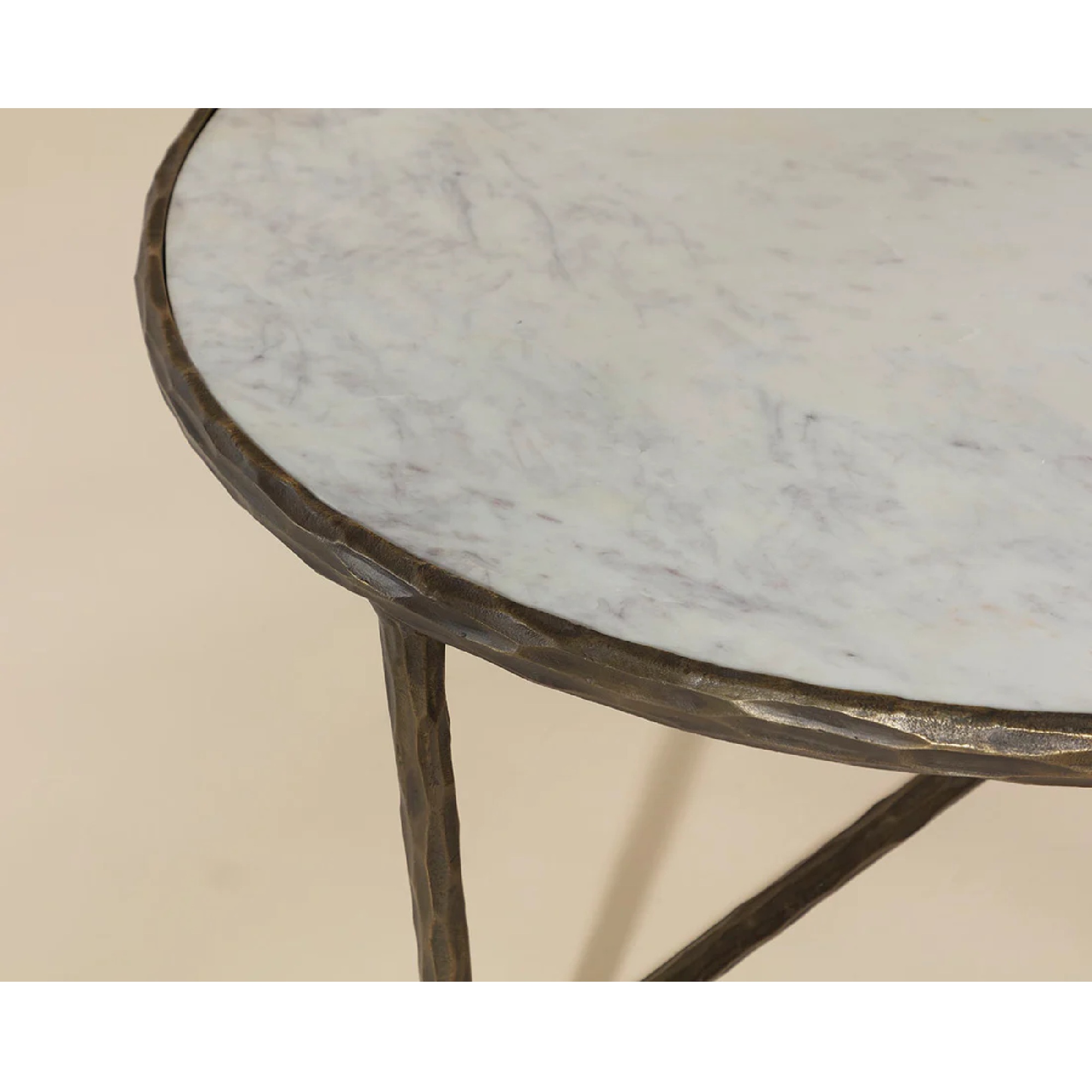 Refined white Banswara marble balanced with the artful look of hand-hammered metal elevates the traditional style of the Riyaz Cocktail Table. Its rounded shape and complimentary tones allow this coffee table to enhance any living space.