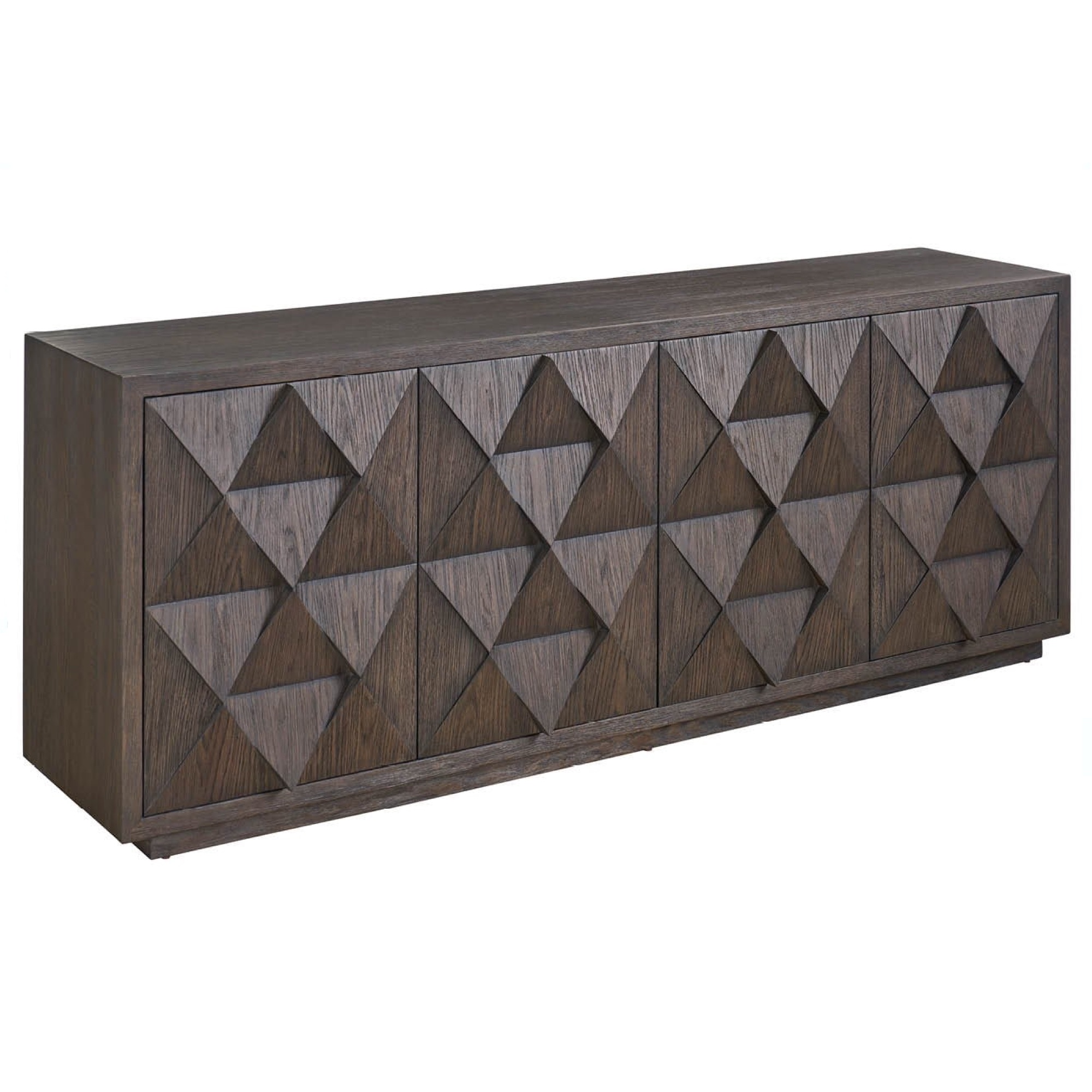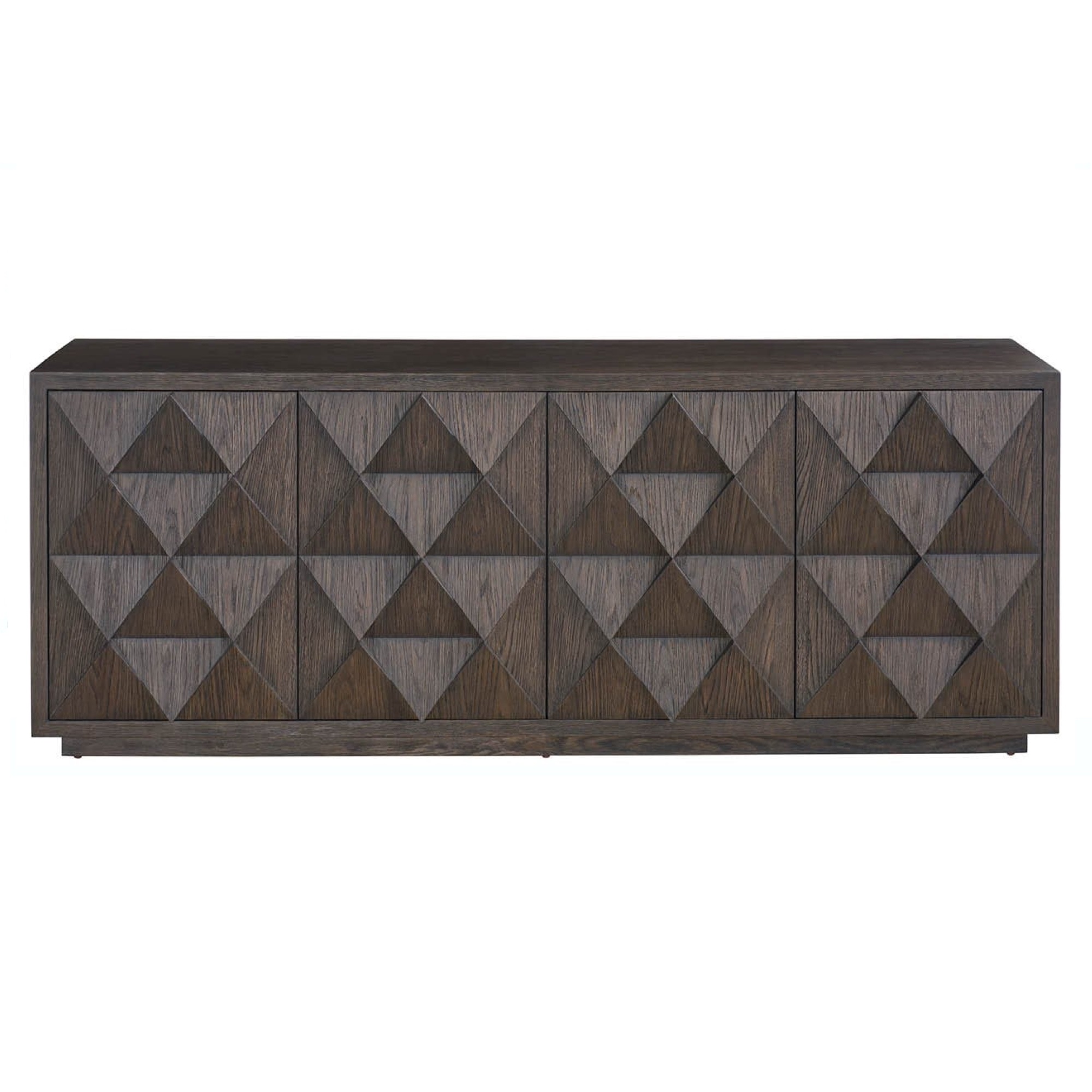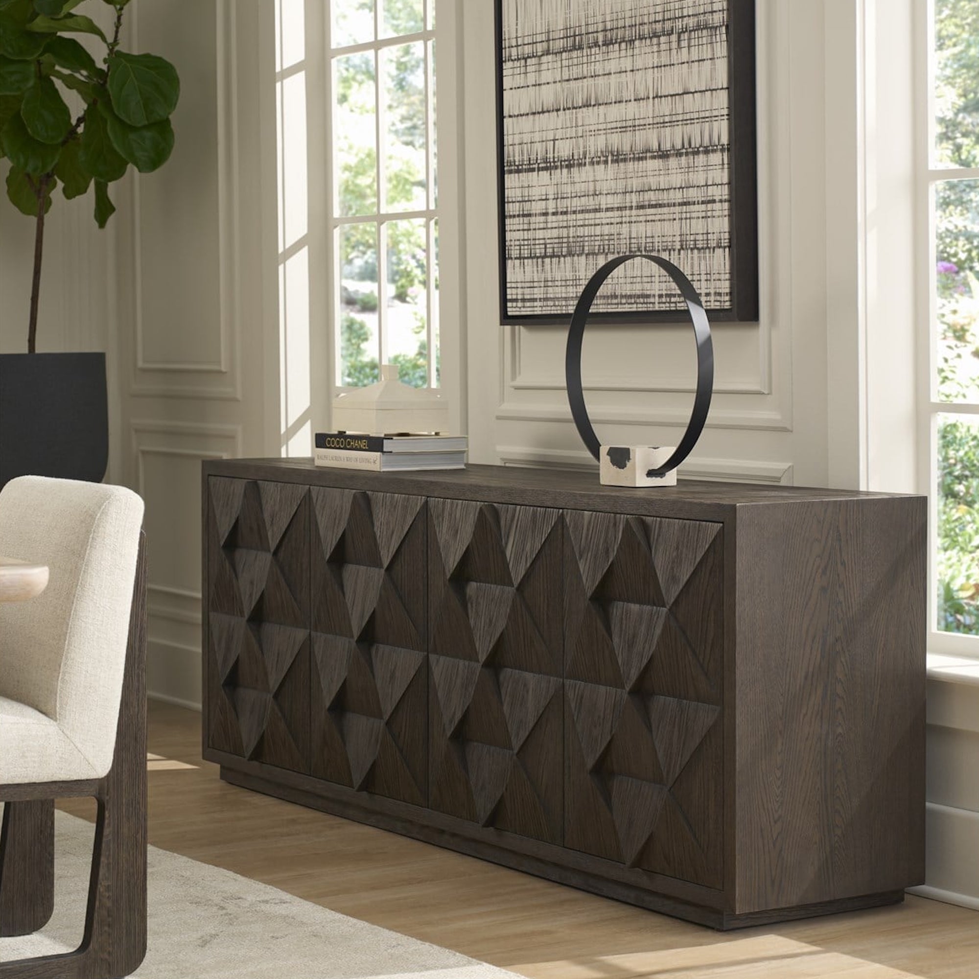 The Sable Credenza makes a geometric statement in any dining or living space. Its deep Sable finish highlights the intricate, faceted design of the doors, creating a focal point that’s both stylish and functional for storage and display.