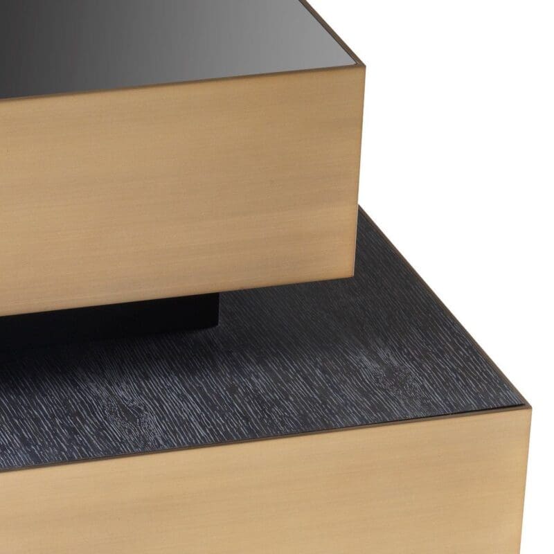 Create an extravagant new look in your living room with Shelton side table . This quirky design features two overlapping squares with a brushed brass rim. The lower square has a top of charcoal grey oak veneer, the upper one has a top of black glass.