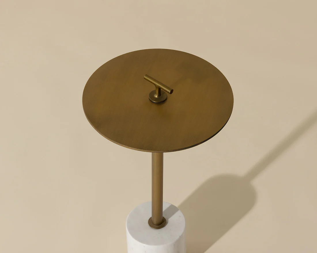 This sculptural side table is a beauty from all angles. Features a powder-coated burnished brass top and handle with a white Volakas marble base. A perfect addition for small spaces. As marble is a natural material, unique veining, pitting, fissures, micro-cracks and colour variations are all characteristics that add to the uniqueness and beauty of each piece.
