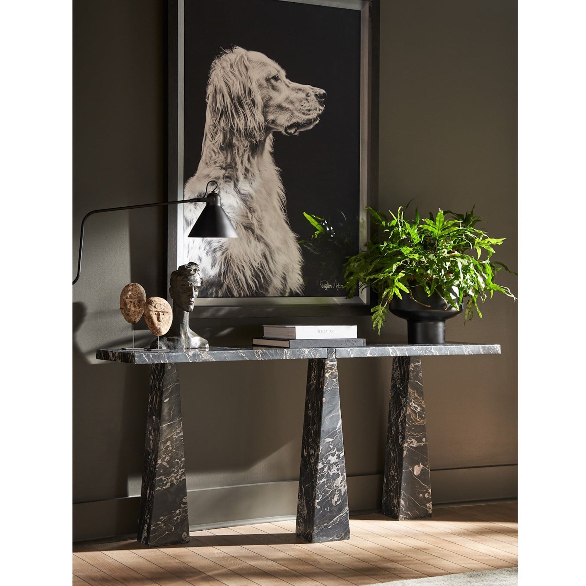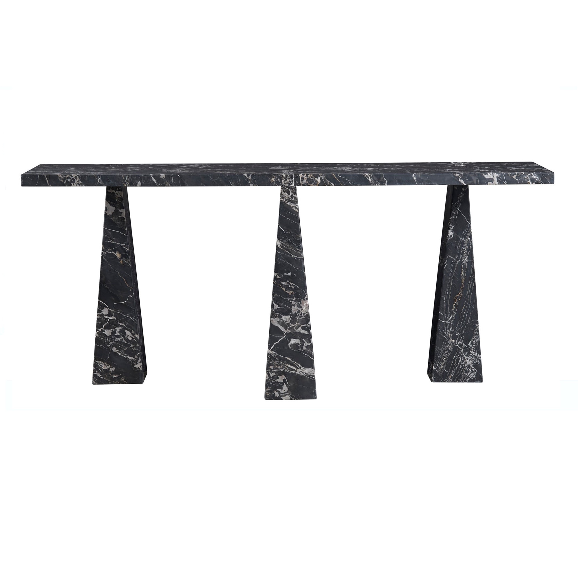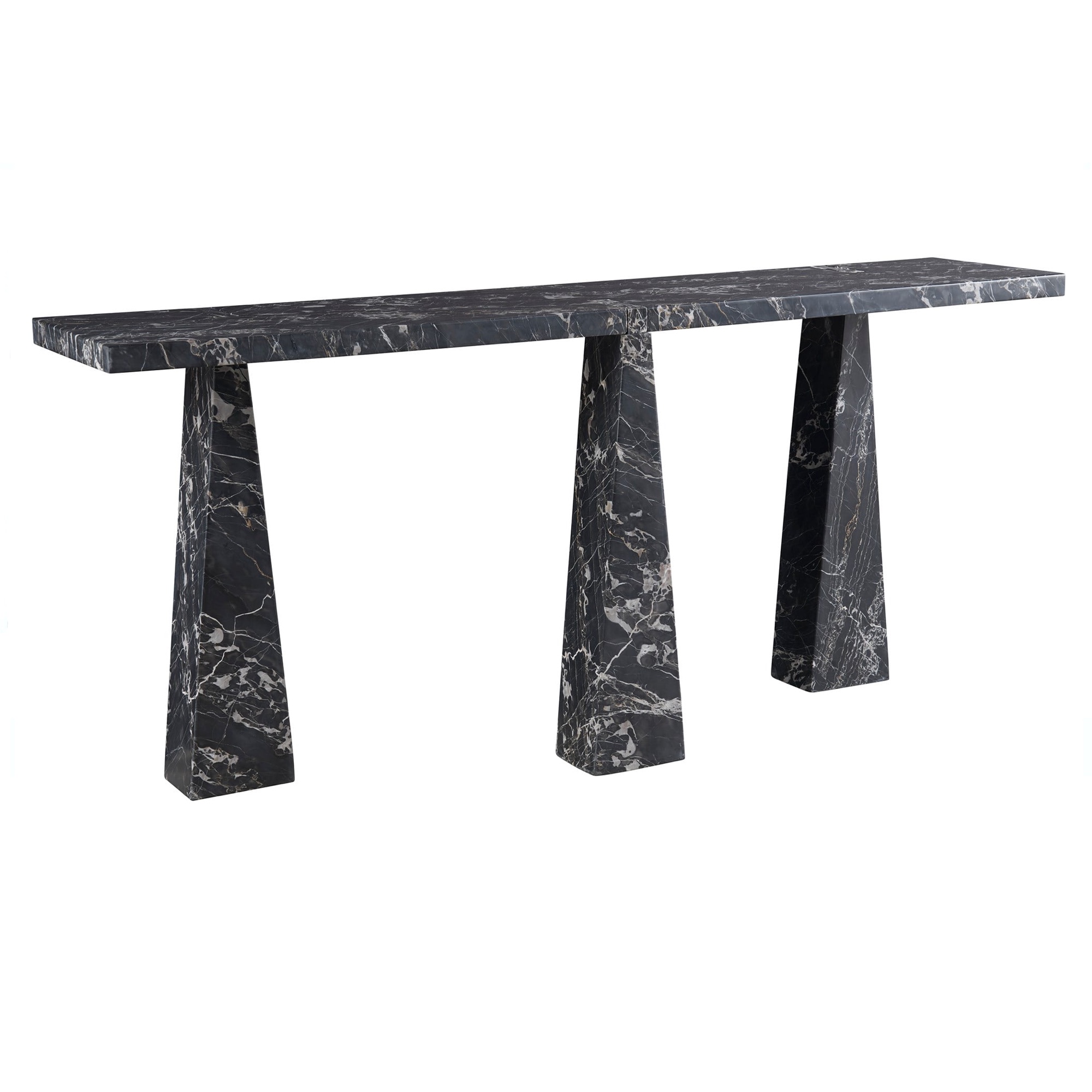 The Spectrum Sofa Table is a masterpiece of drama and depth, sculpted entirely from Golden Portoro marble, characterized by its rich, moody tones and striking white veining. Its legs, architectural and sculptural in form, draw inspiration from triangular shapes, adding a layer of intrigue and sophistication to this captivating piece.