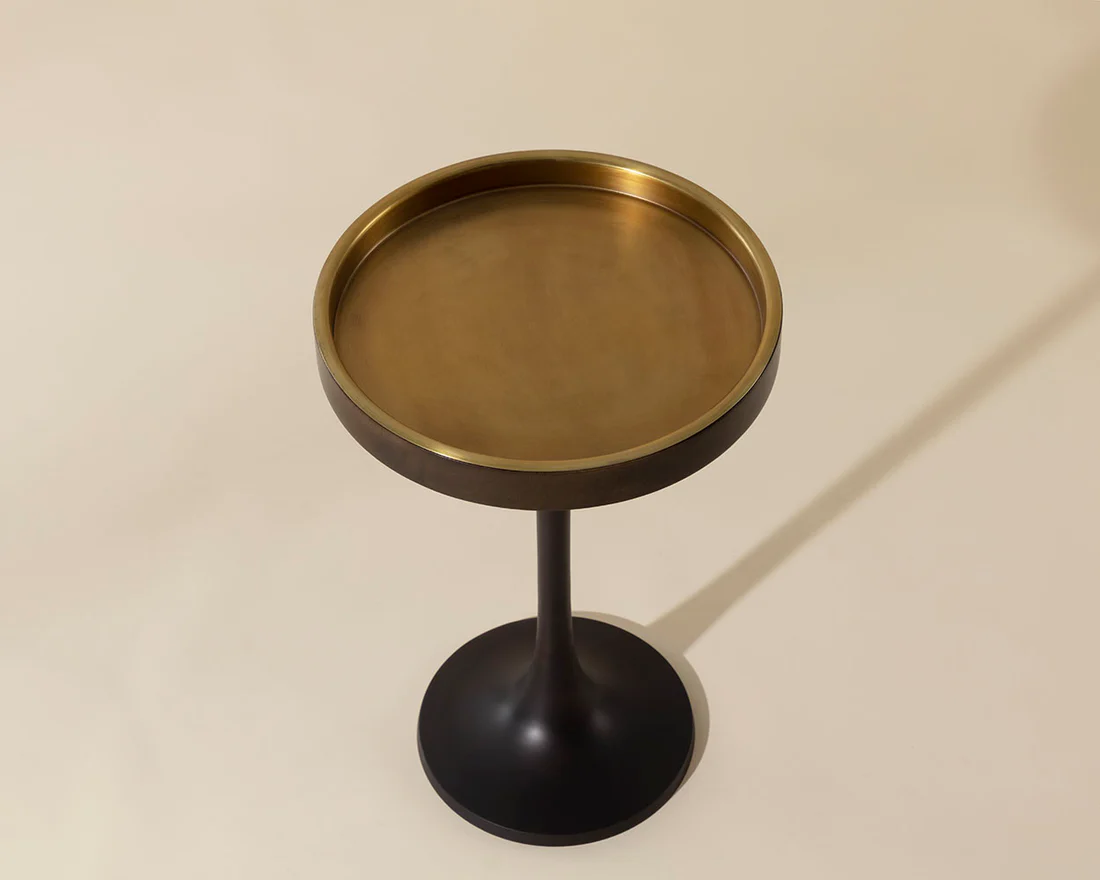 Mixed materials and a balanced composition speak to the Tekoa End Table’s sophisticated design. A circular top made from metal and mango wood rests upon an aluminum pedestal base with a bronze finish to complete the conversation.