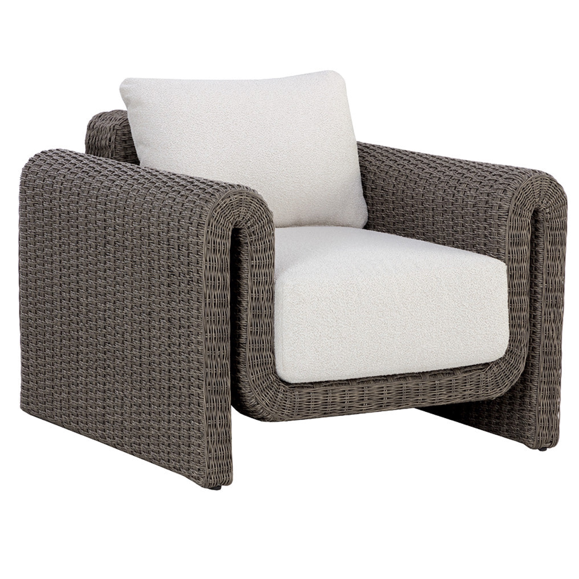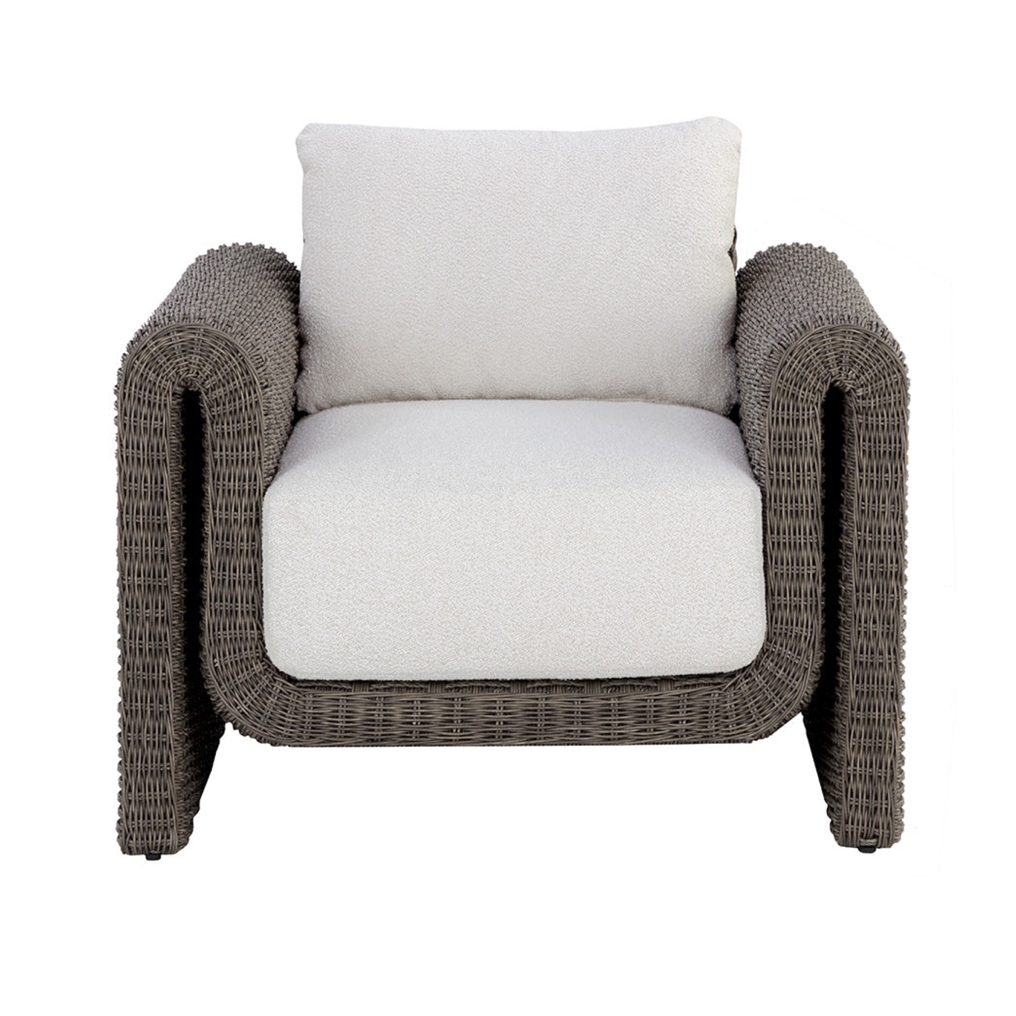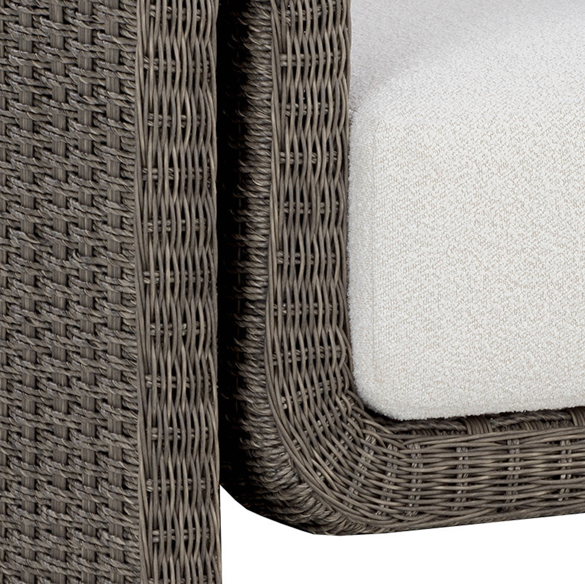 The robust proportions of the Tibi Lounge Chair enhance the textural beauty of handwoven twisted wicker. The rolled arms connect seamlessly to nestle the comfortable cushioning upholstered in our louis cream outdoor boucle performance fabric.