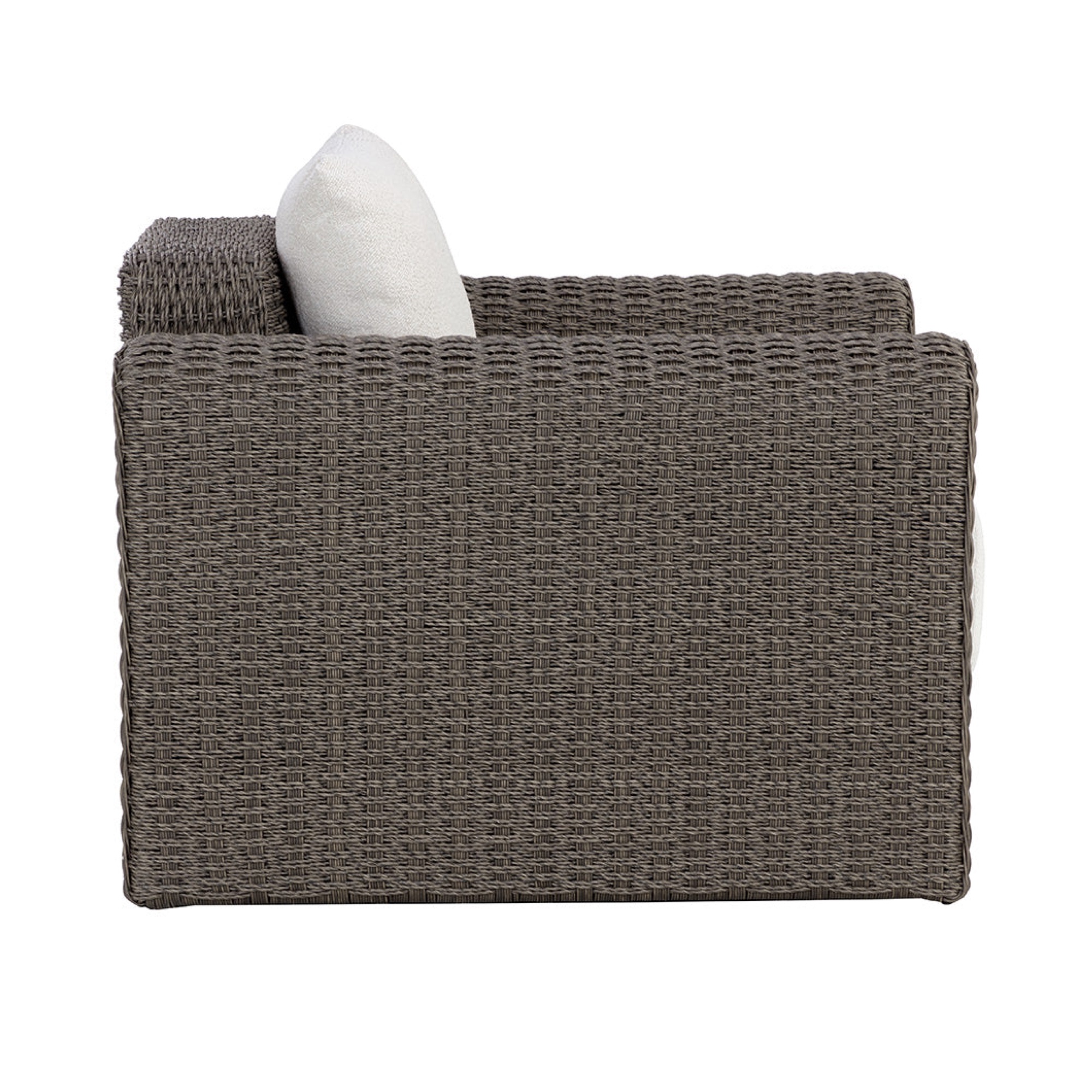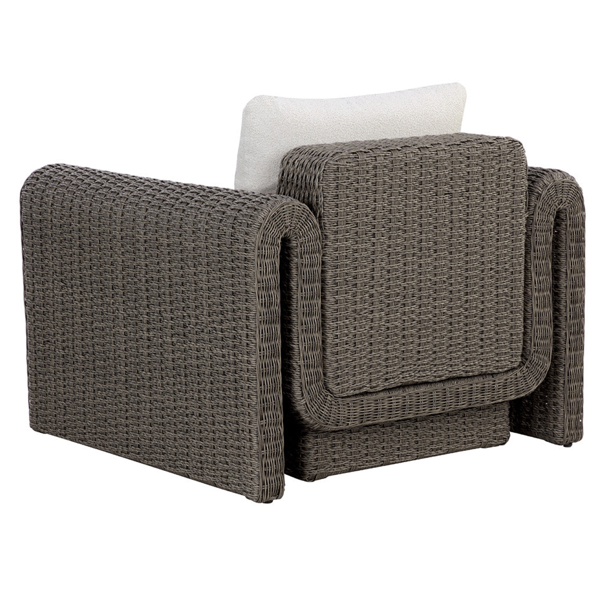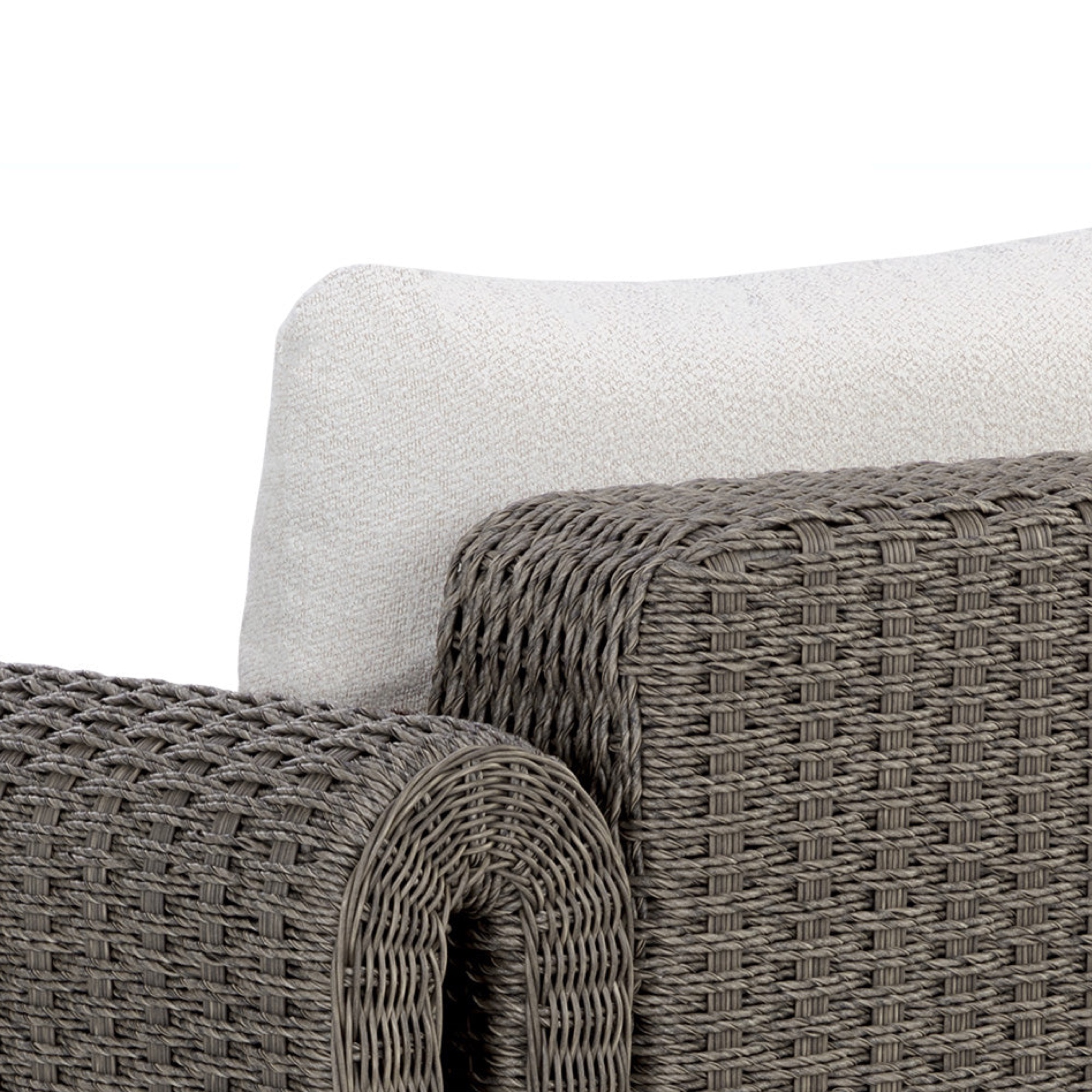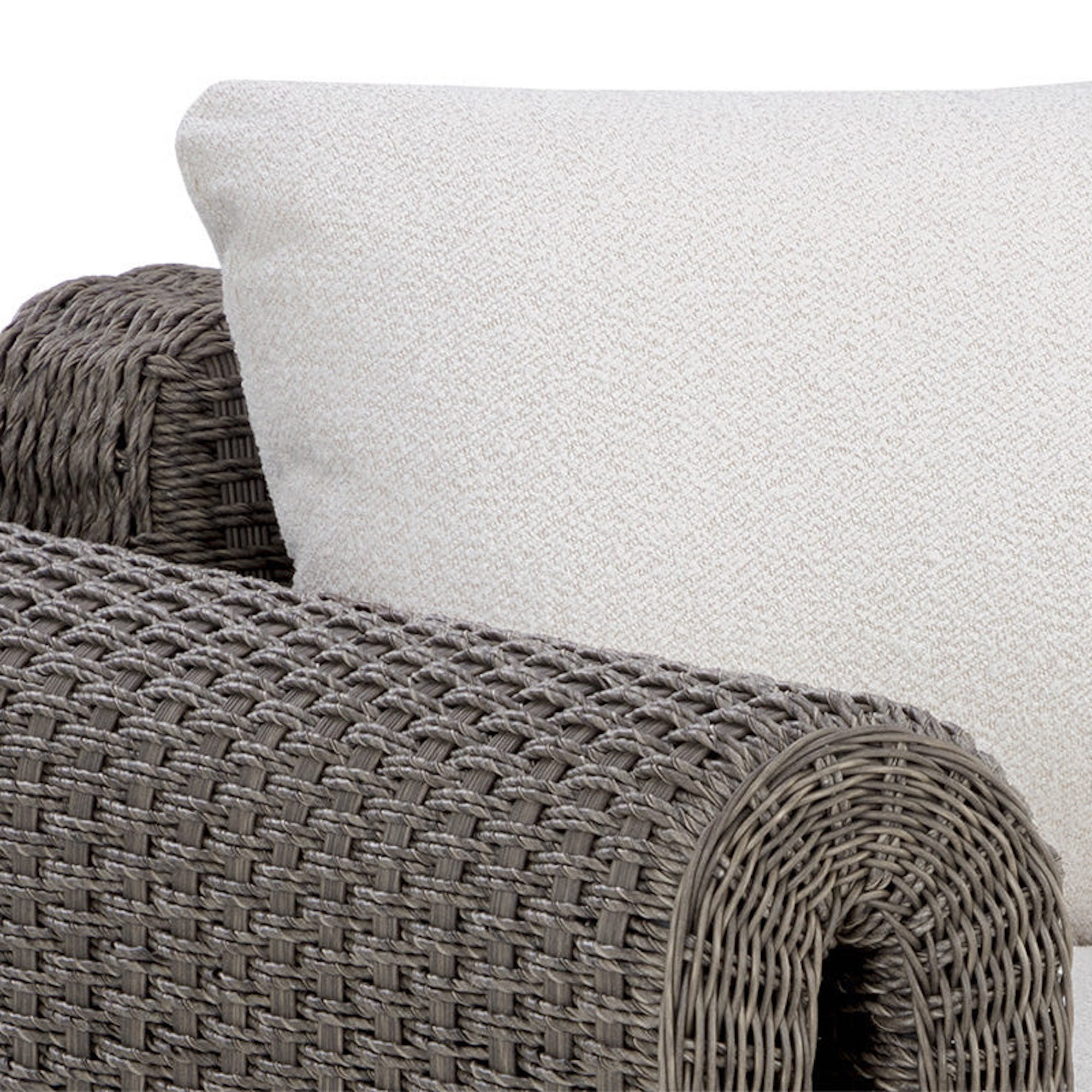 The robust proportions of the Tibi Lounge Chair enhance the textural beauty of handwoven twisted wicker. The rolled arms connect seamlessly to nestle the comfortable cushioning upholstered in our louis cream outdoor boucle performance fabric.