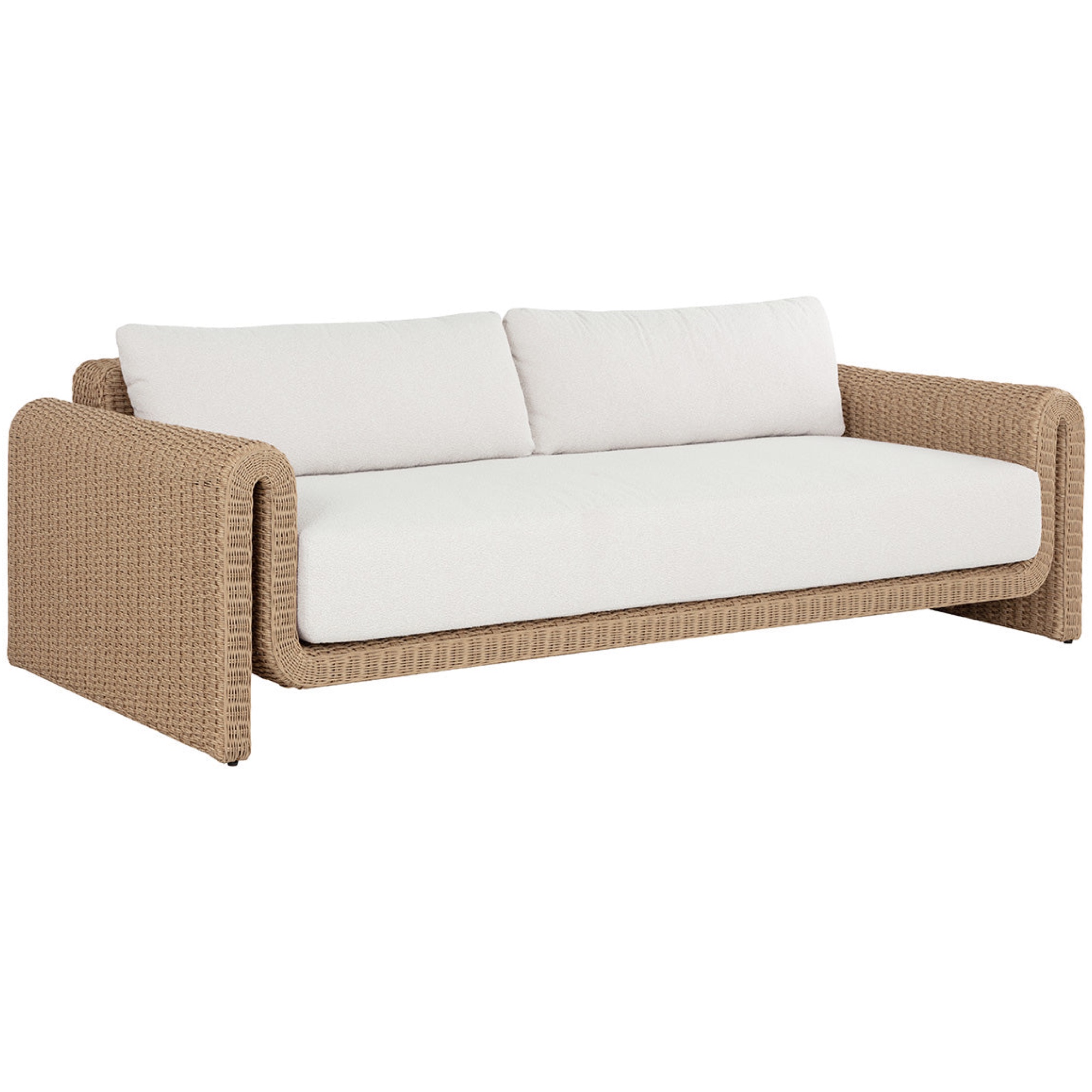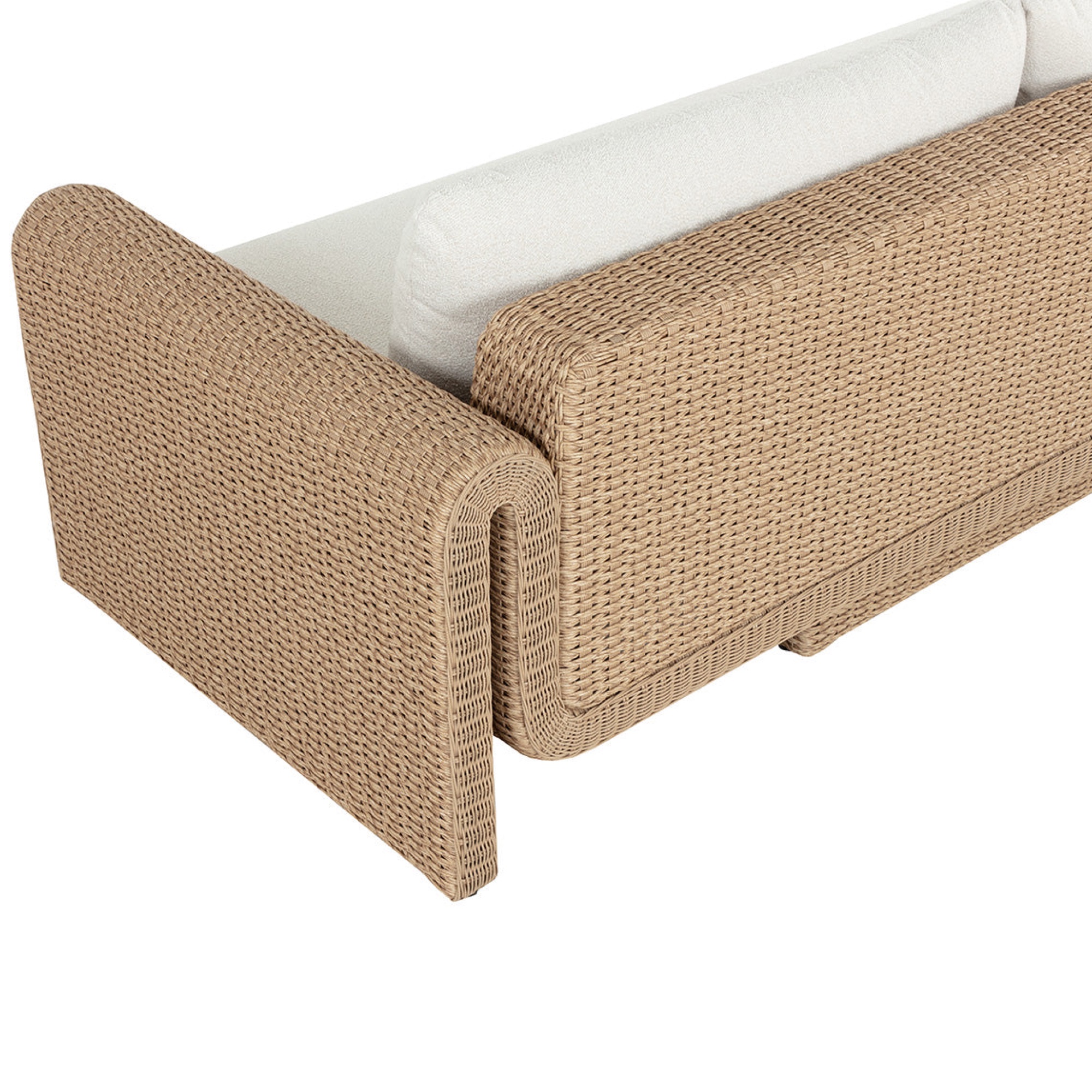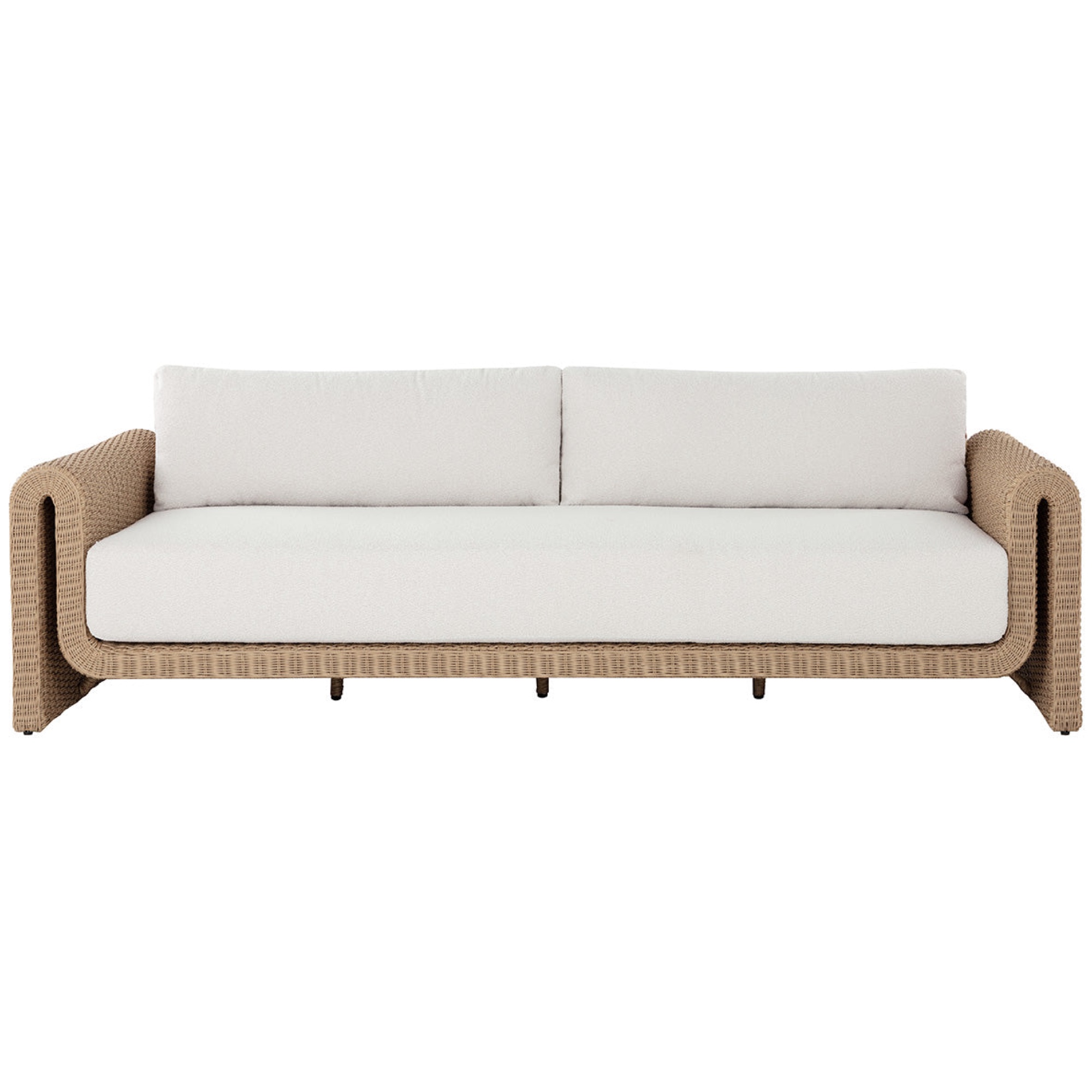 The curved proportions of the Tibi Sofa enhance the textural beauty of handwoven twisted wicker. The rolled arms connect seamlessly to nestle the comfortable cushioning upholstered in our Louis cream outdoor boucle performance fabric.