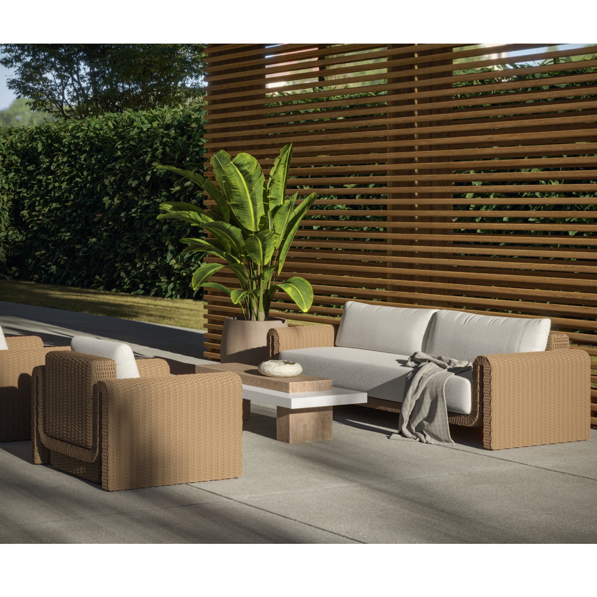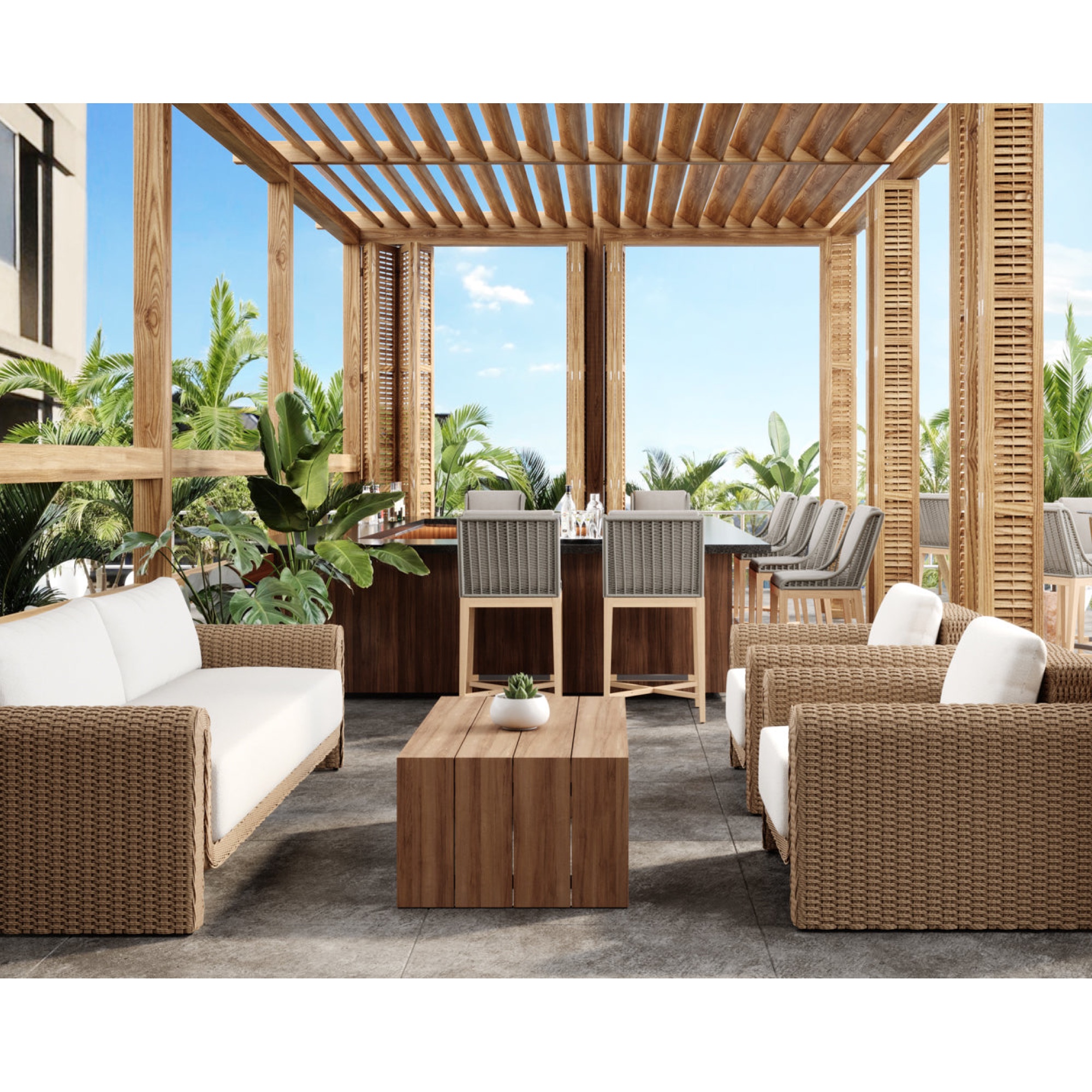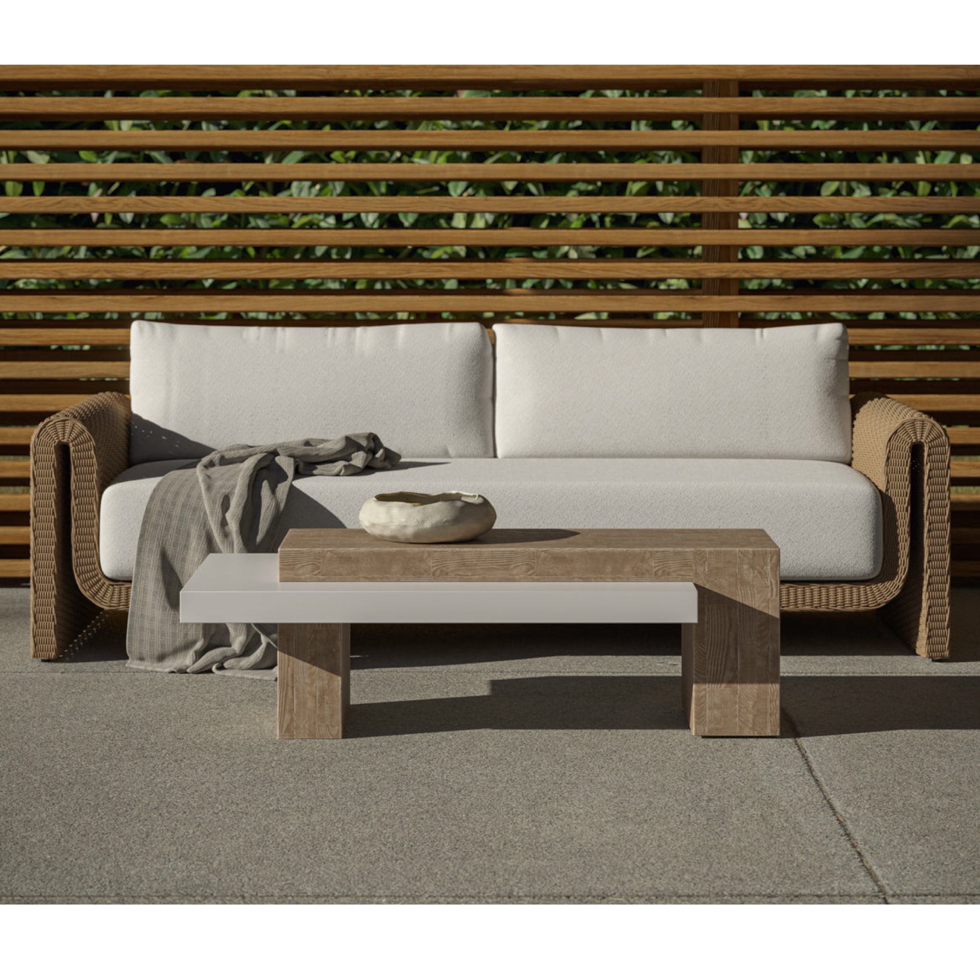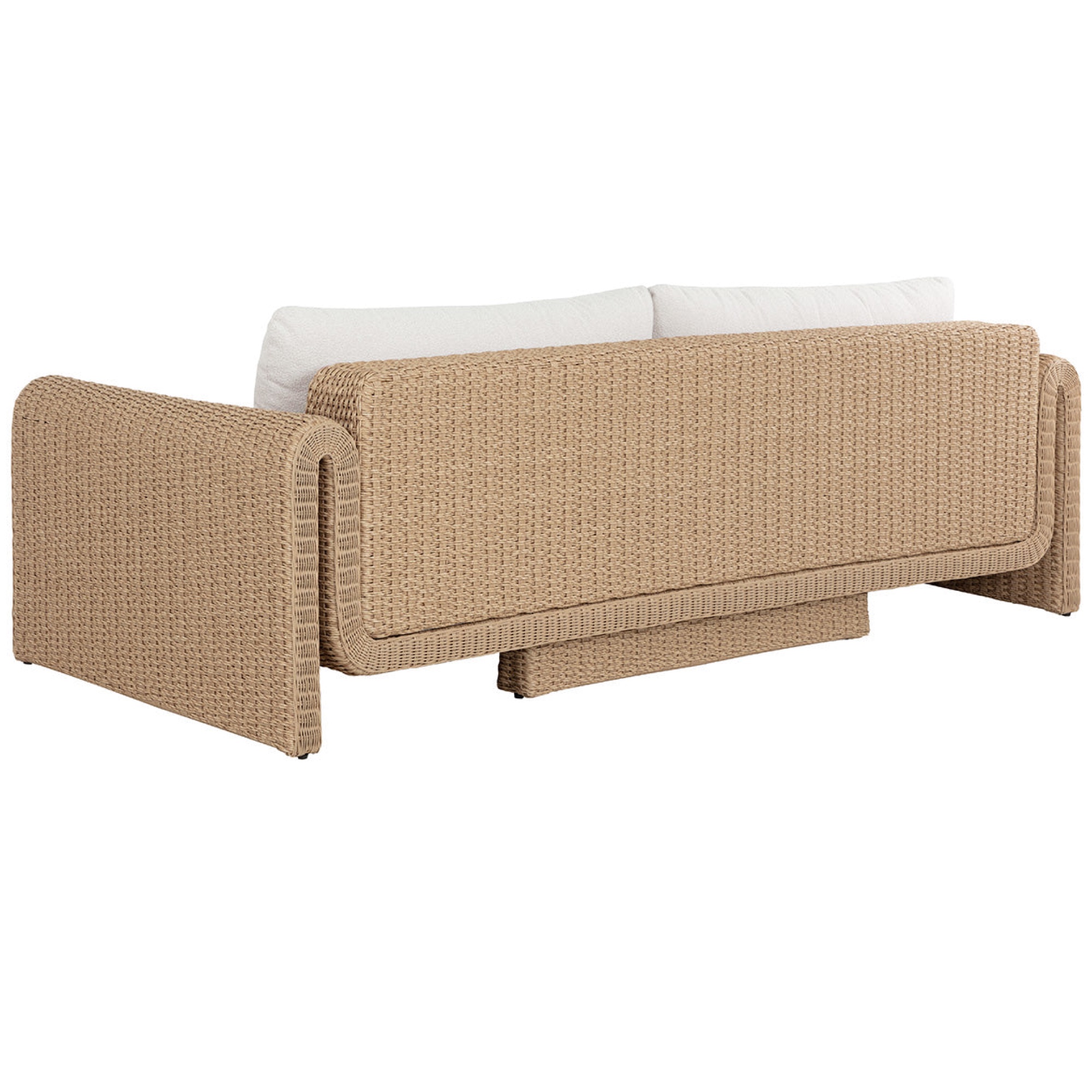 The curved proportions of the Tibi Sofa enhance the textural beauty of handwoven twisted wicker. The rolled arms connect seamlessly to nestle the comfortable cushioning upholstered in our Louis cream outdoor boucle performance fabric.