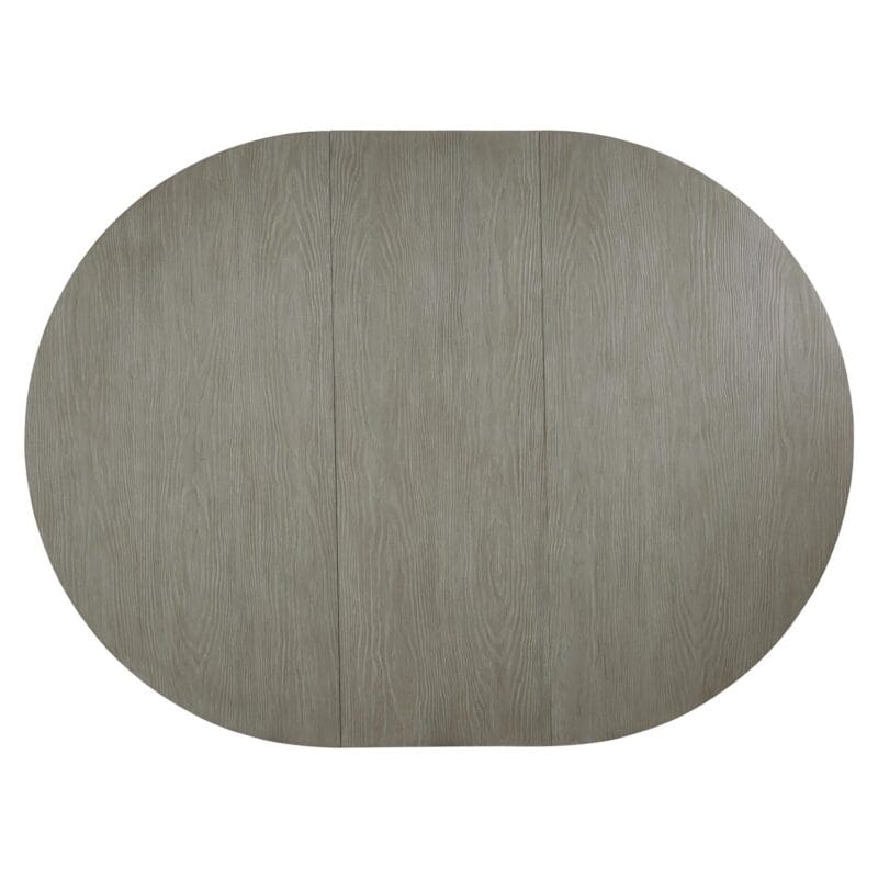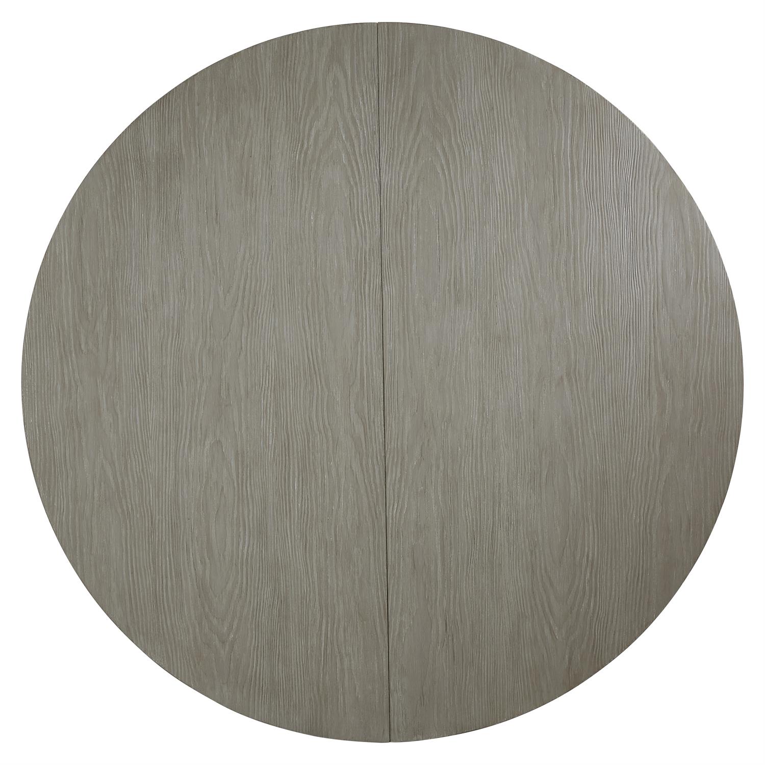 The Trianon dining table highlights modern organic design with a textured rough hewn cast resin base that has the look of raw stone. Finished in Quarry, the striking base supports a round wood top in the L’Ombre finish. The top also can be expanded with the addition of one leaf.