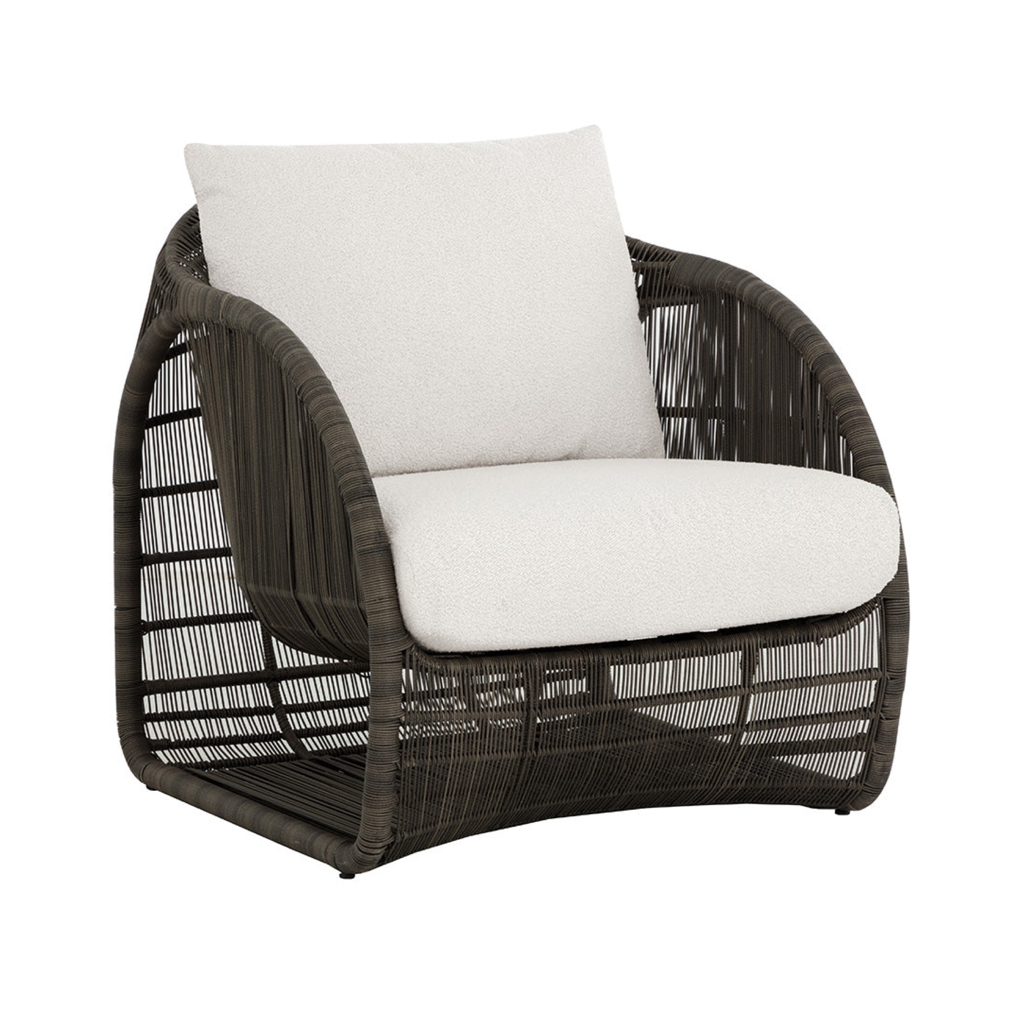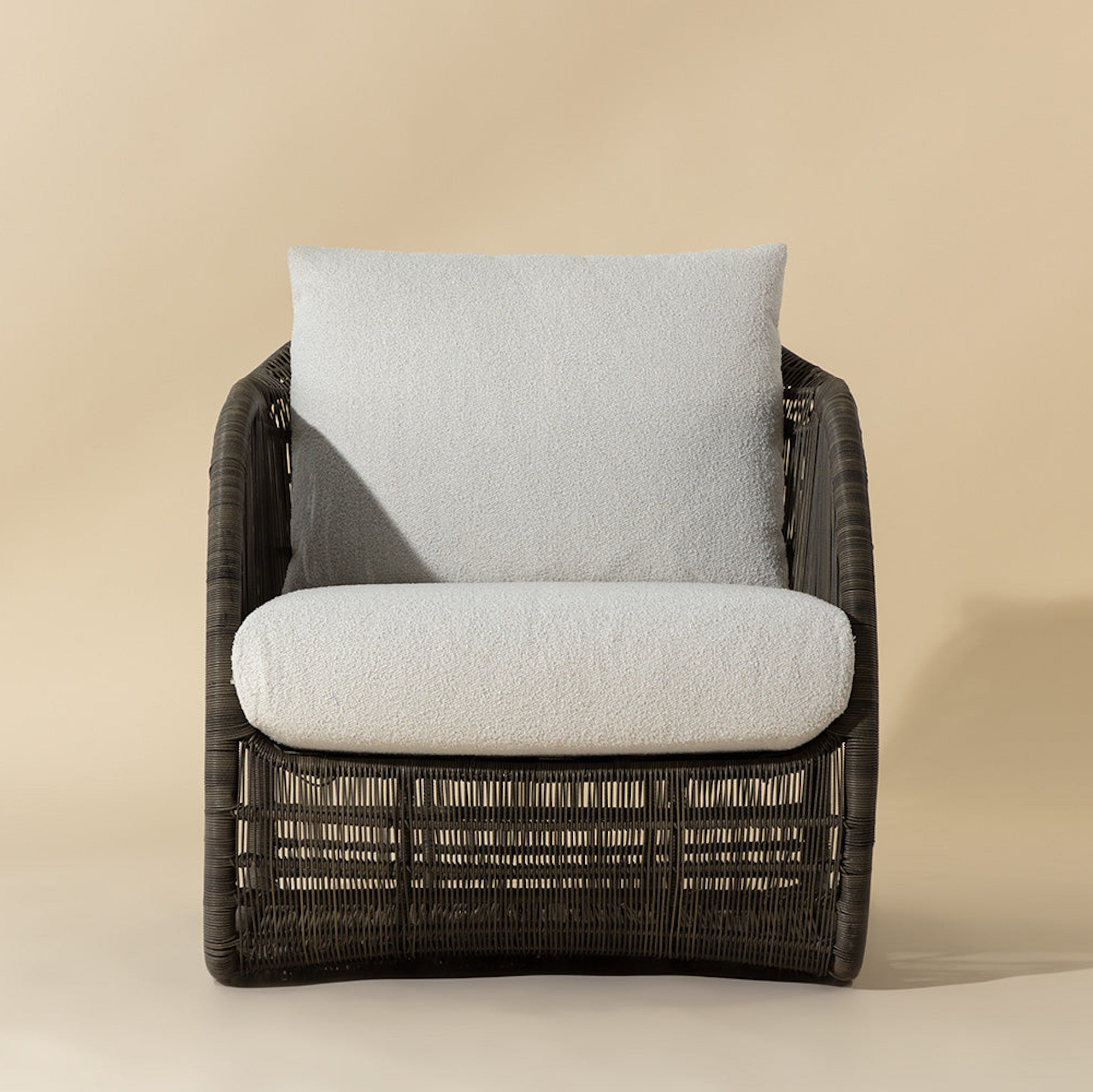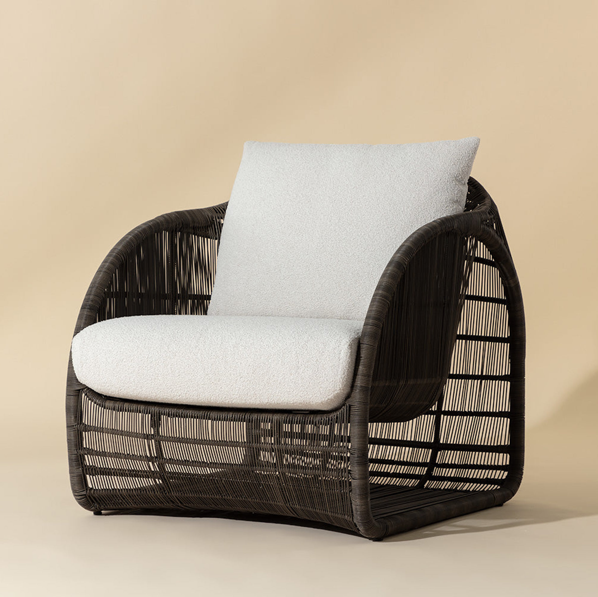An open show of modern art in action, the Tulum Lounge Chair amazes with its airy and circular form. Skillfully constructed with a black powder-coated aluminum frame and upholstered in louis cream outdoor performance fabric, this sculptural wonder with rounded sides and a suspended seat is stylish and stunning.