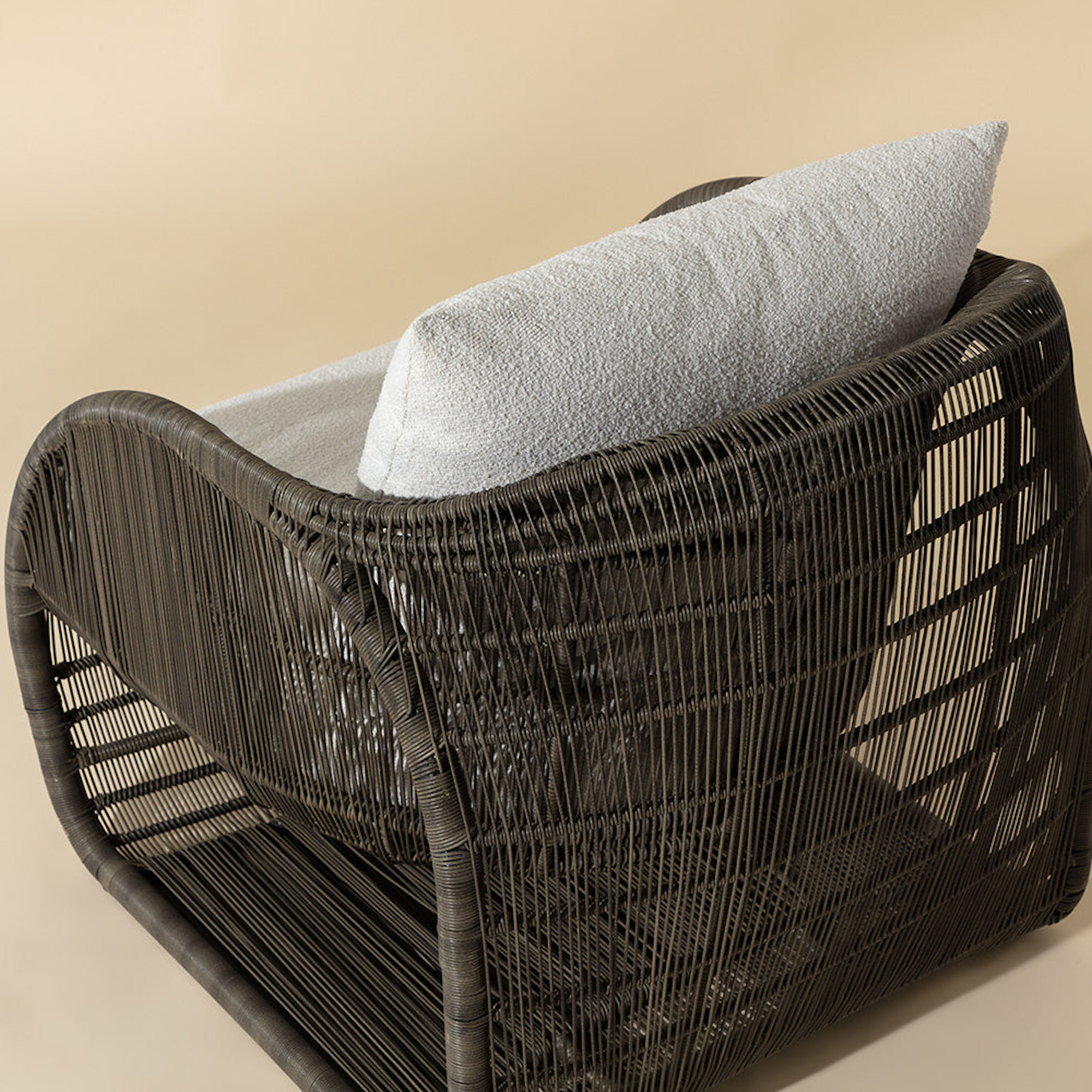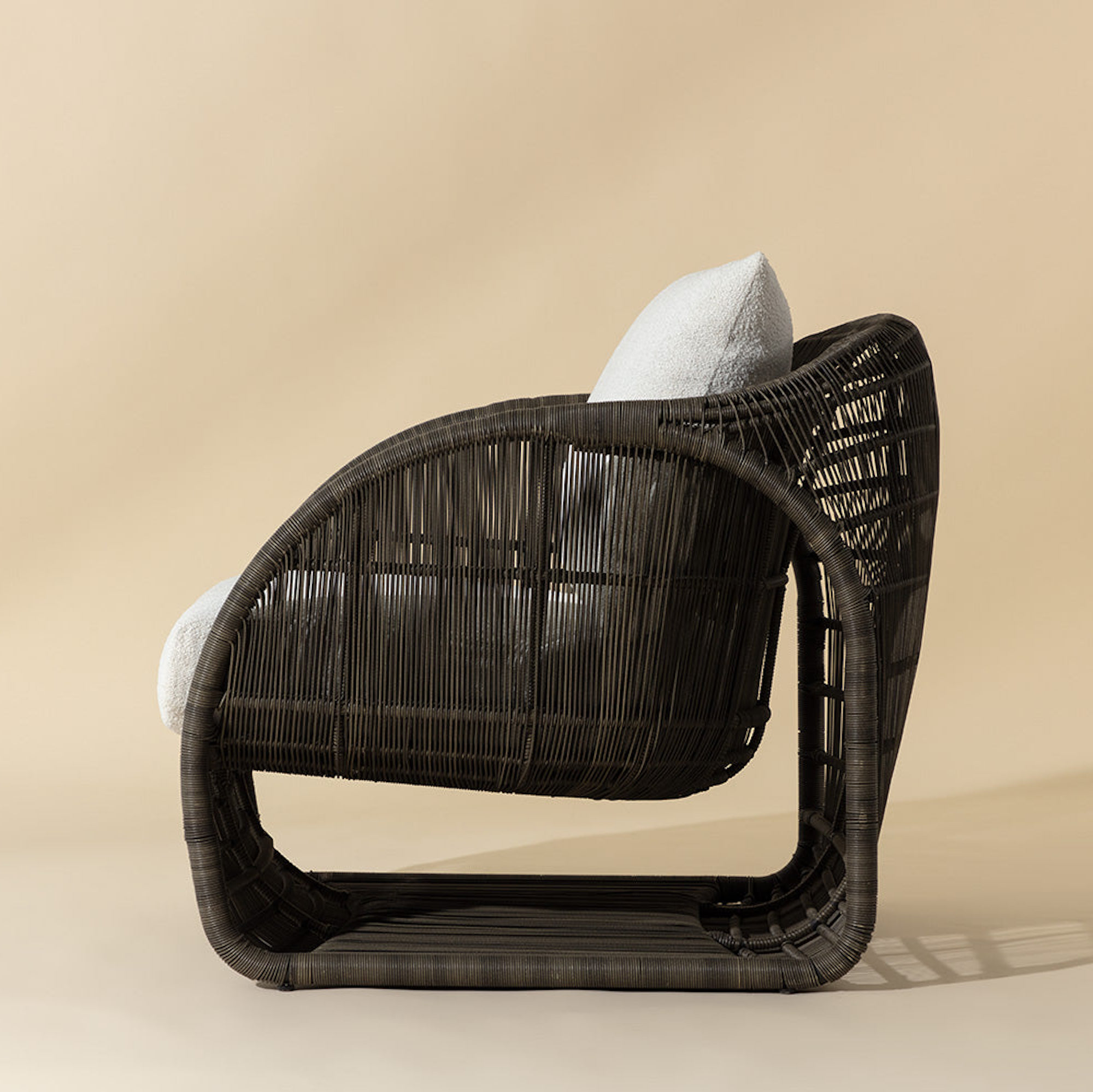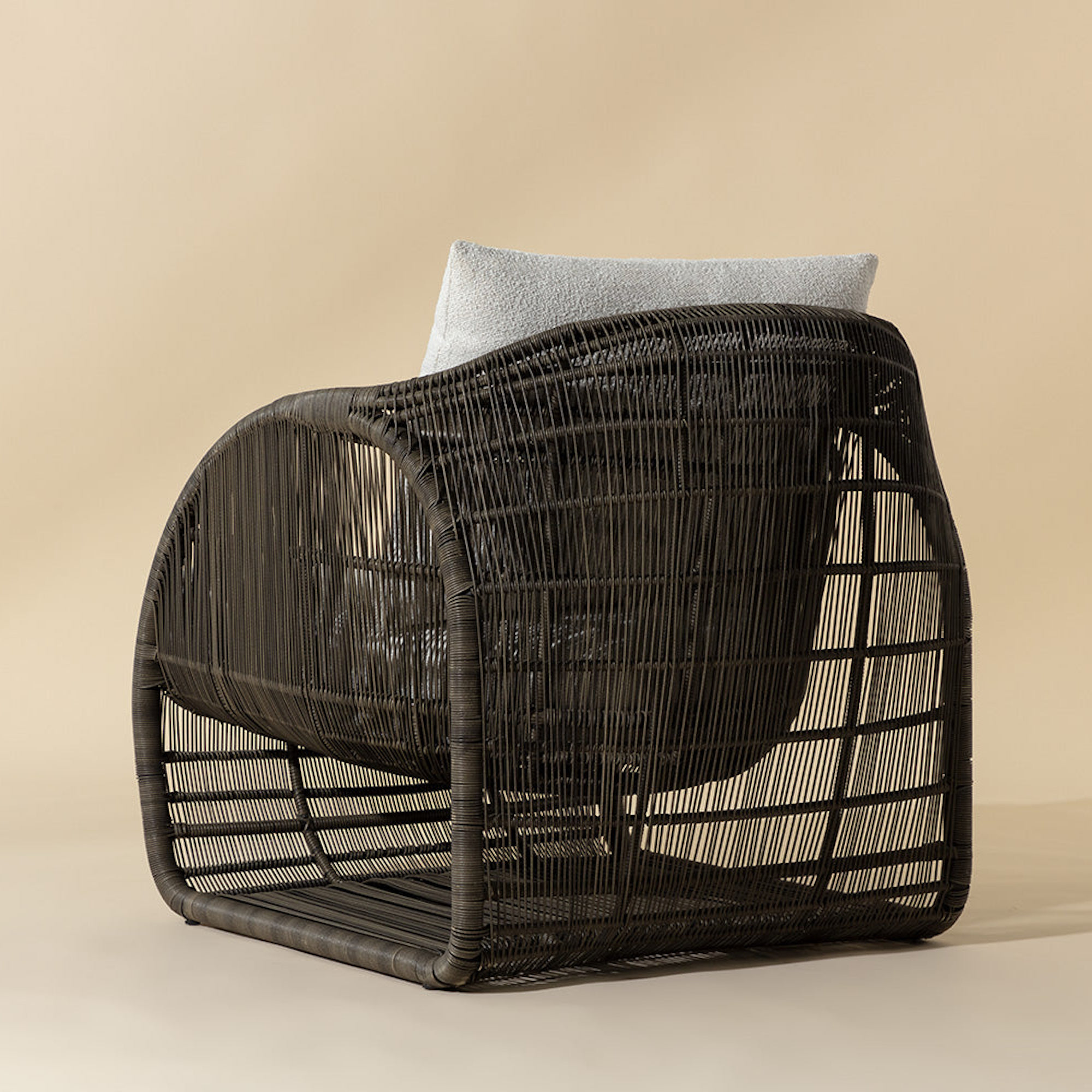 An open show of modern art in action, the Tulum Lounge Chair amazes with its airy and circular form. Skillfully constructed with a black powder-coated aluminum frame and upholstered in louis cream outdoor performance fabric, this sculptural wonder with rounded sides and a suspended seat is stylish and stunning.