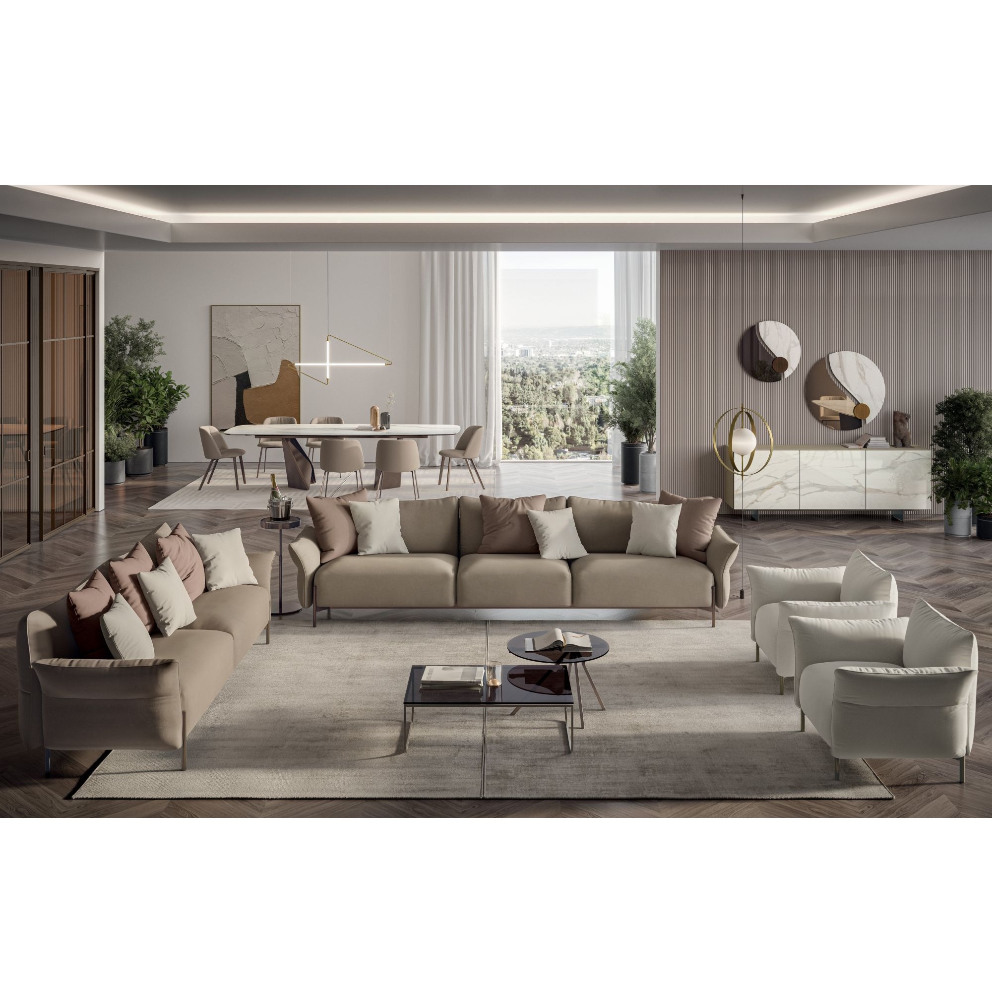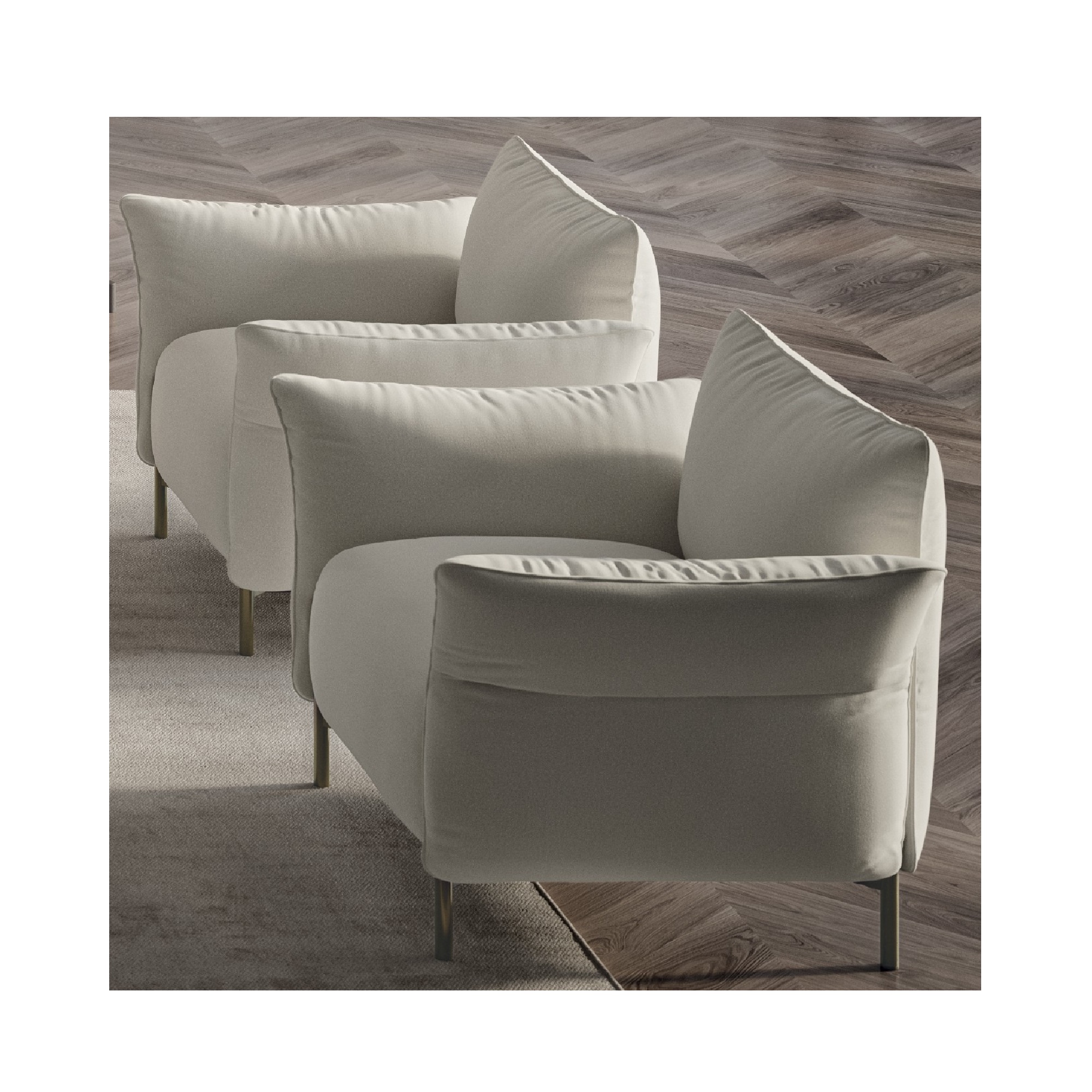 Frame available in various metal finishes and upholstery available in various fabrics or leathers.